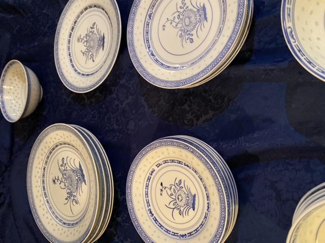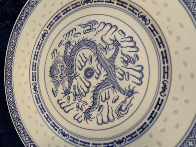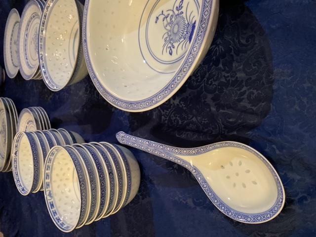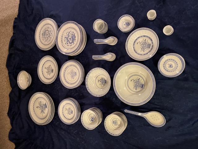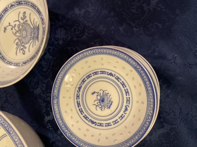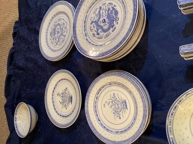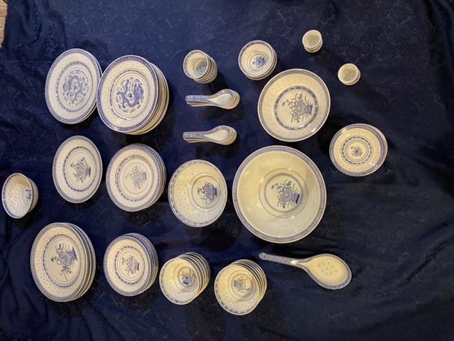 Chinese Dragon Lotus Blue & White Rice Pattern Porcelain Dishes