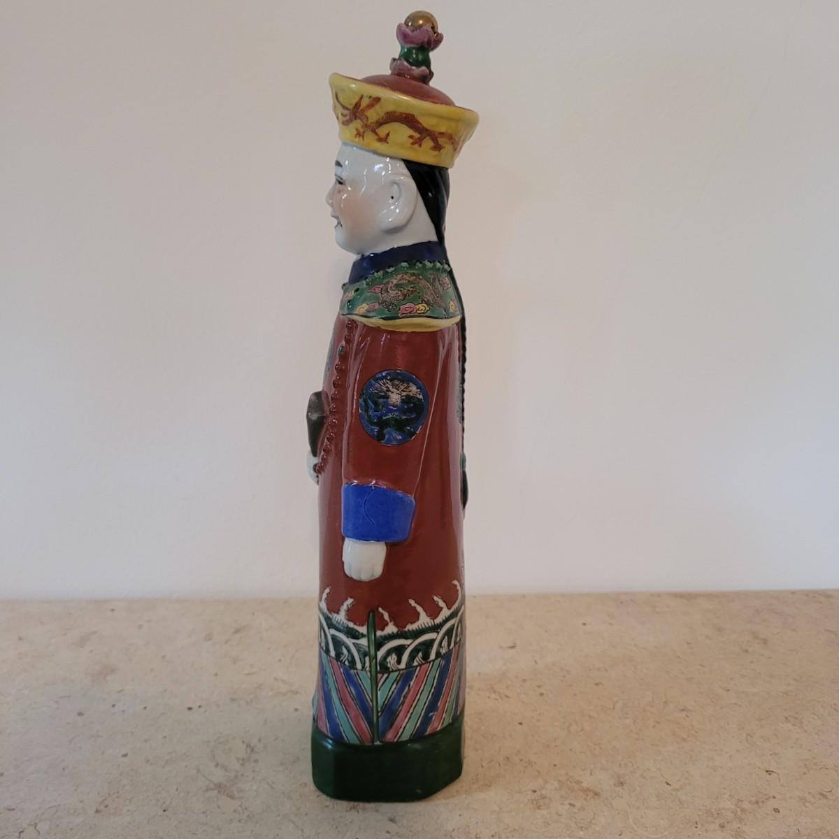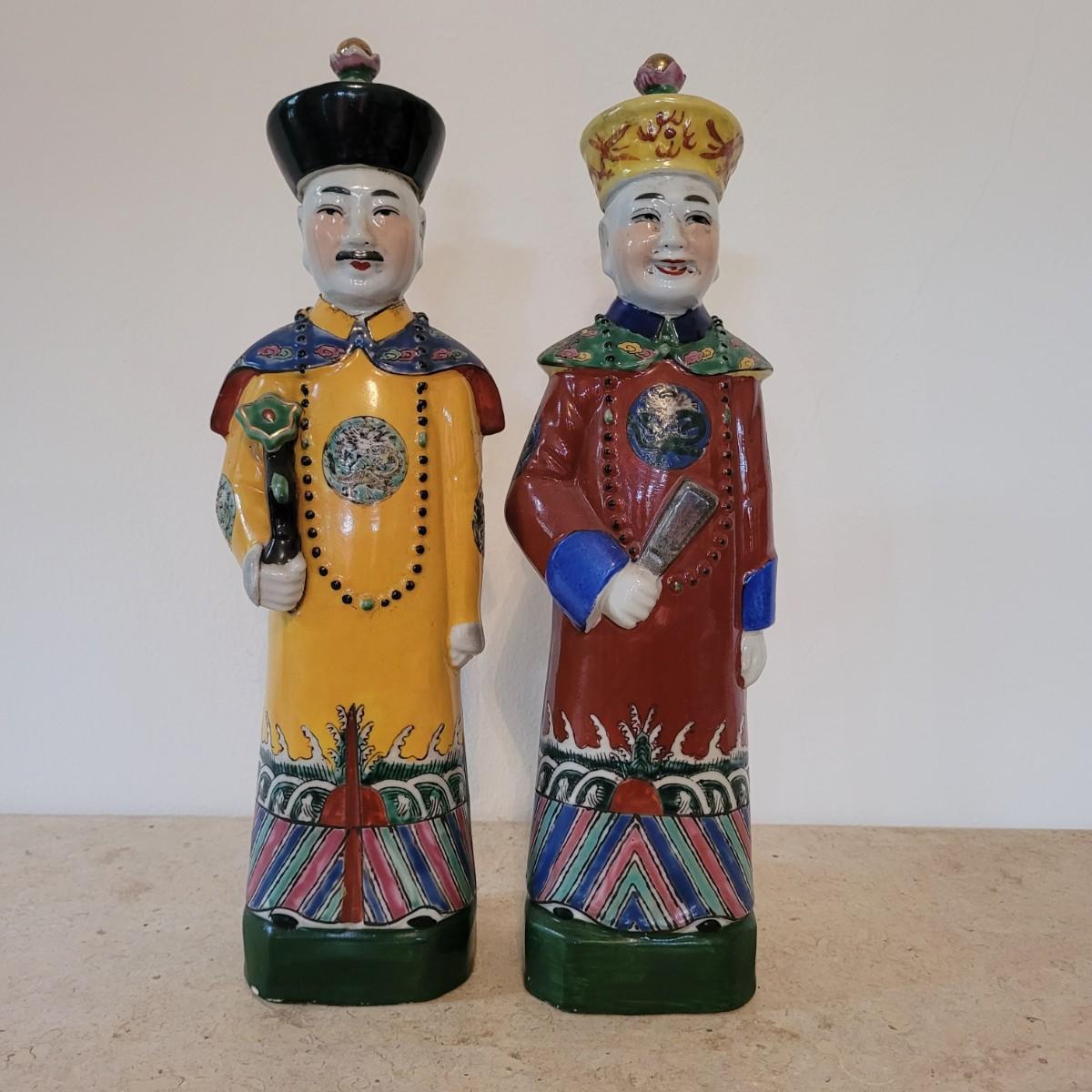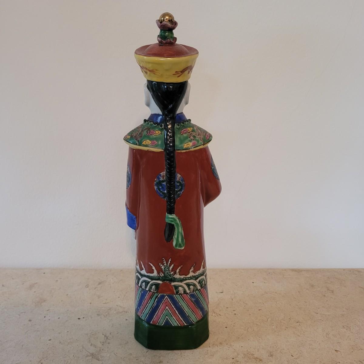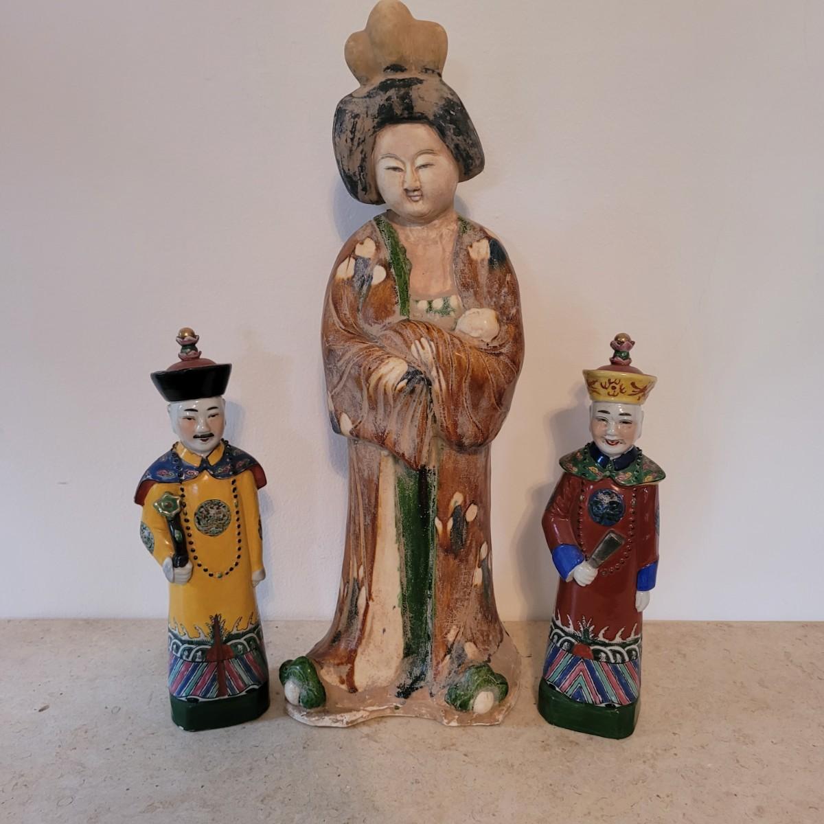 This lot includes three porcelain Chinese dynasty figurines. The first and largest piece is a Tang Dynasty style maid of honor figurine. It measures 9" x 8" x 25"H. The two smaller pieces are likely from the Quing Dynasty and depict the Yongzheng emperor and the Jiaqing emperor. Individually, these statues measure 4" x 4" x 15"H.