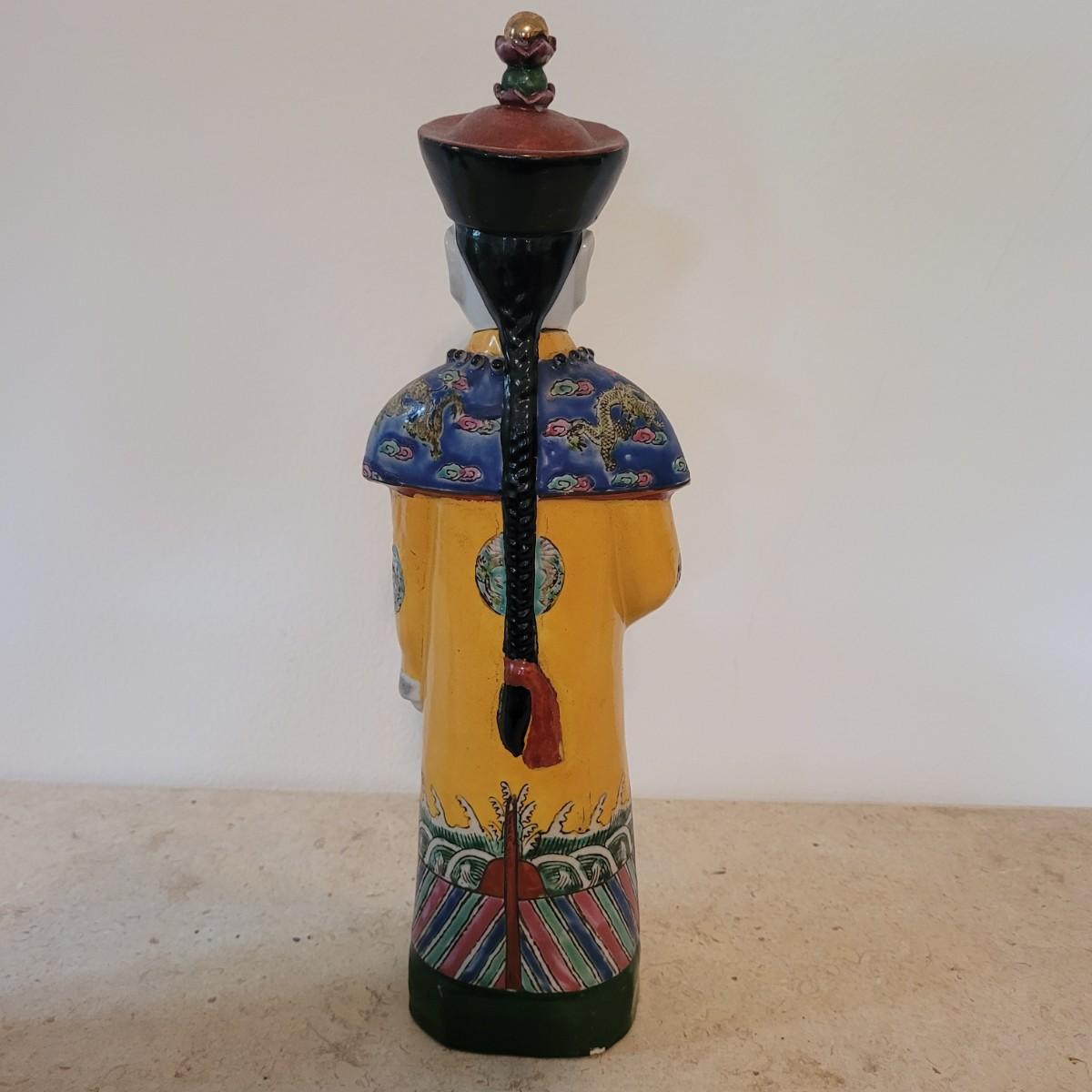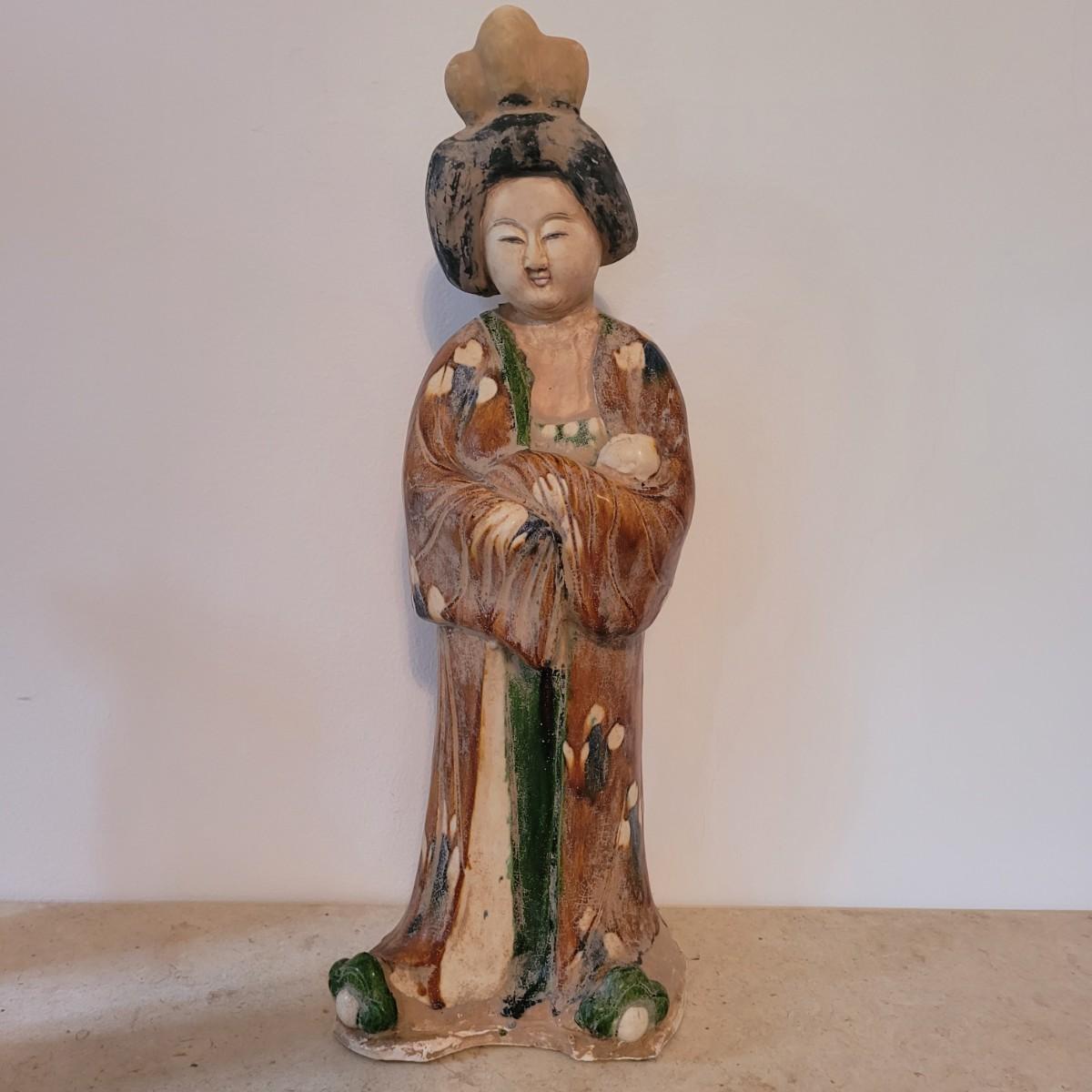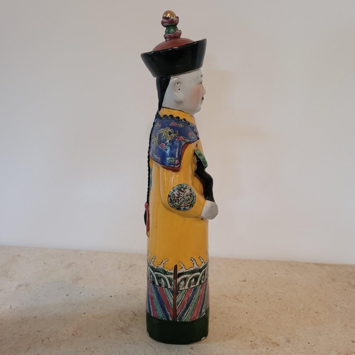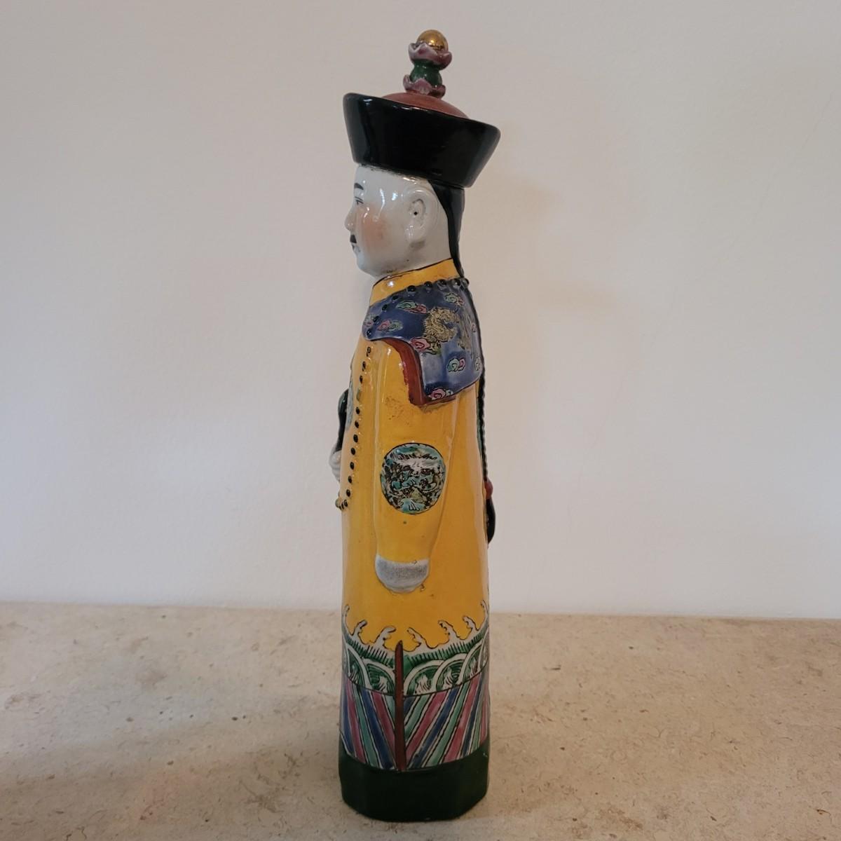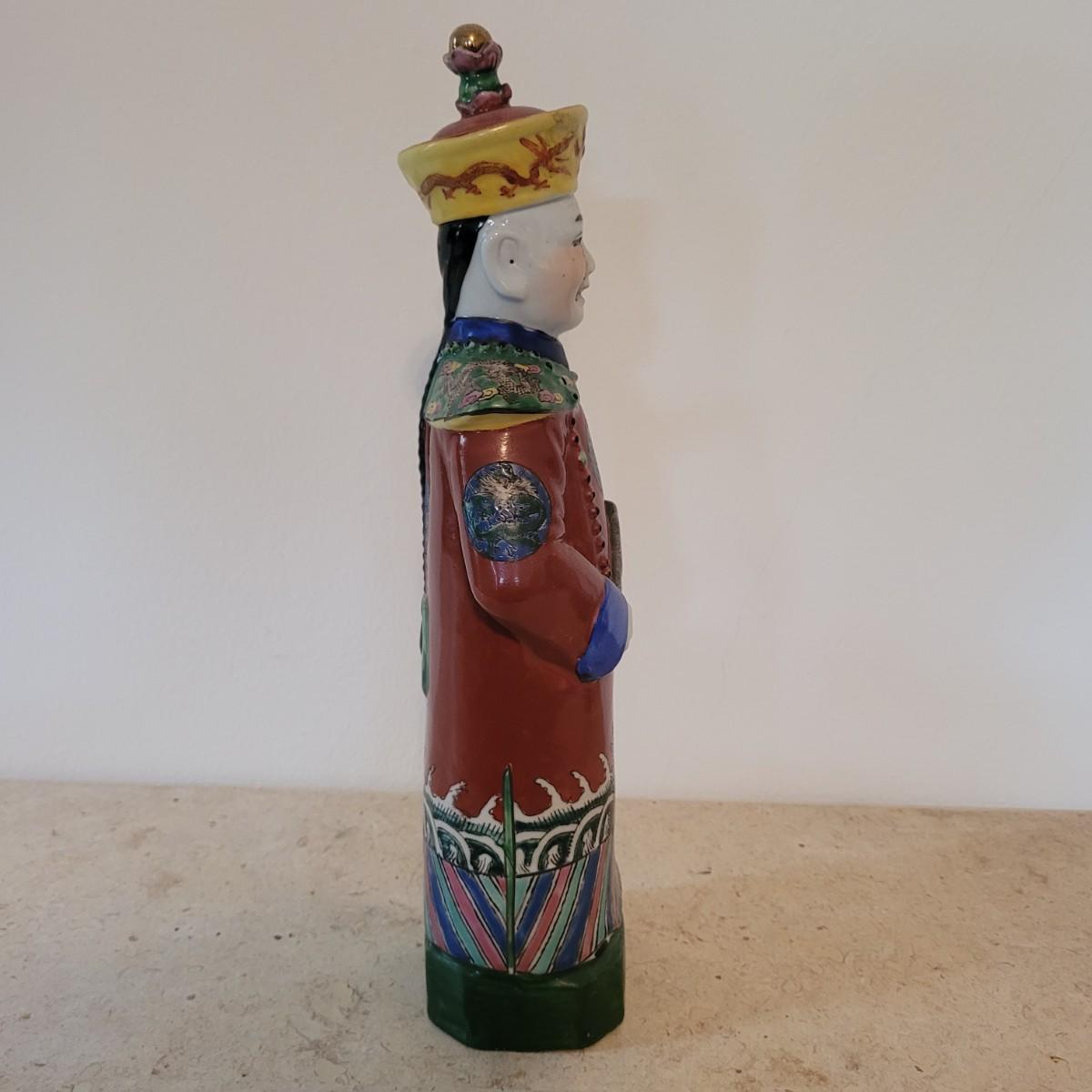 This lot includes three porcelain Chinese dynasty figurines. The first and largest piece is a Tang Dynasty style maid of honor figurine. It measures 9" x 8" x 25"H. The two smaller pieces are likely from the Quing Dynasty and depict the Yongzheng emperor and the Jiaqing emperor. Individually, these statues measure 4" x 4" x 15"H.