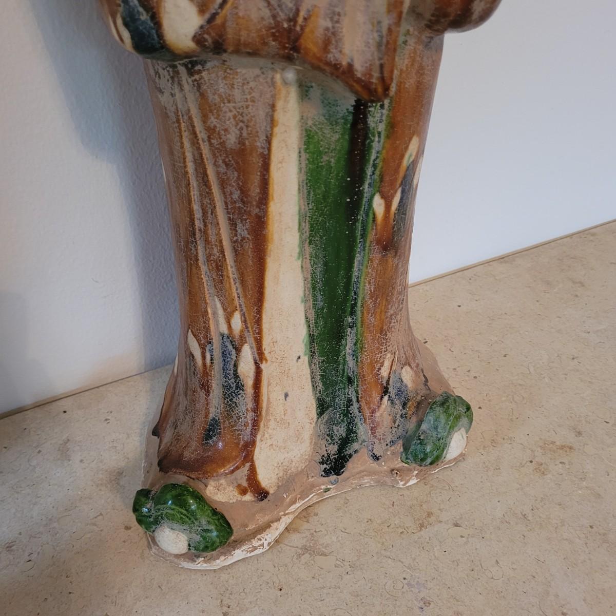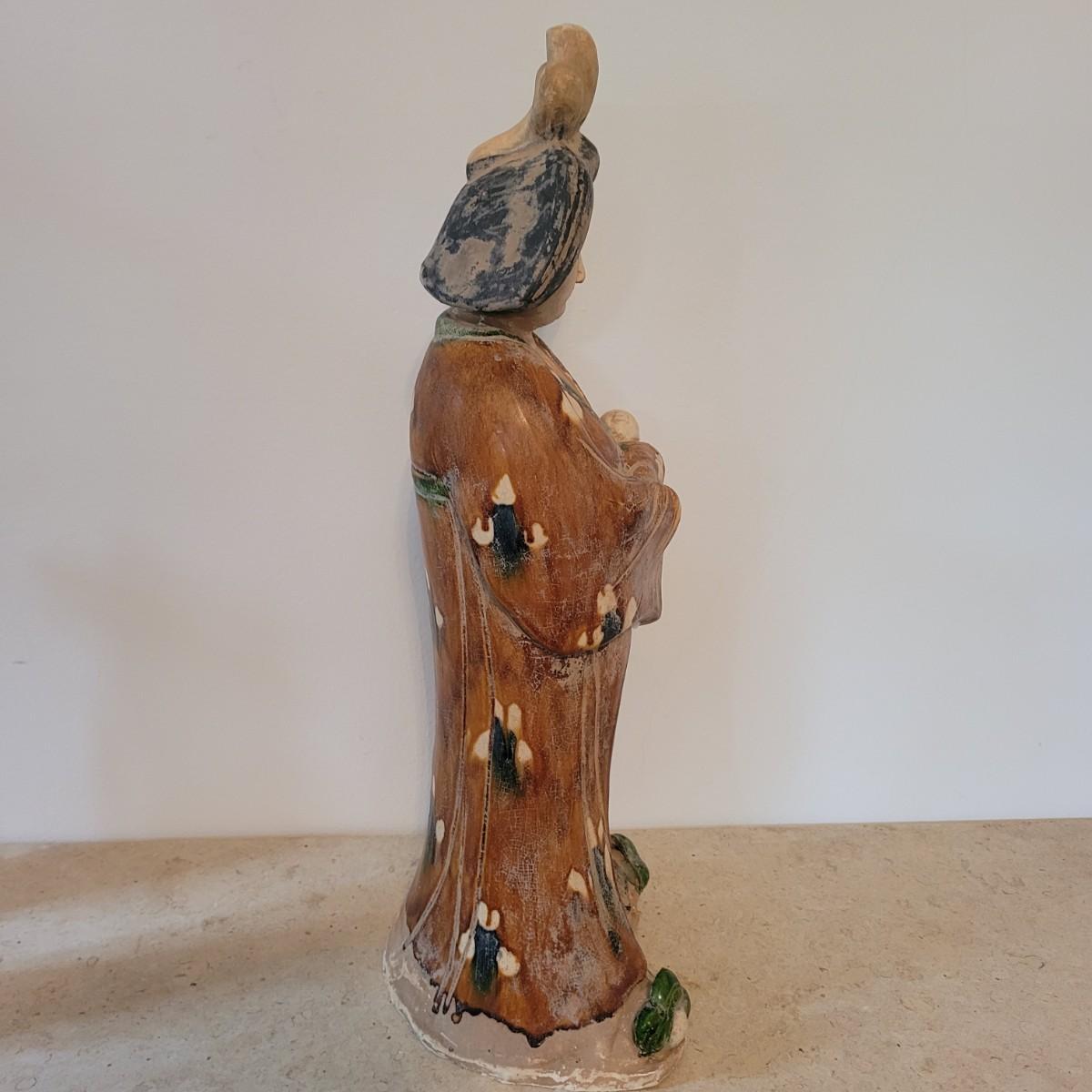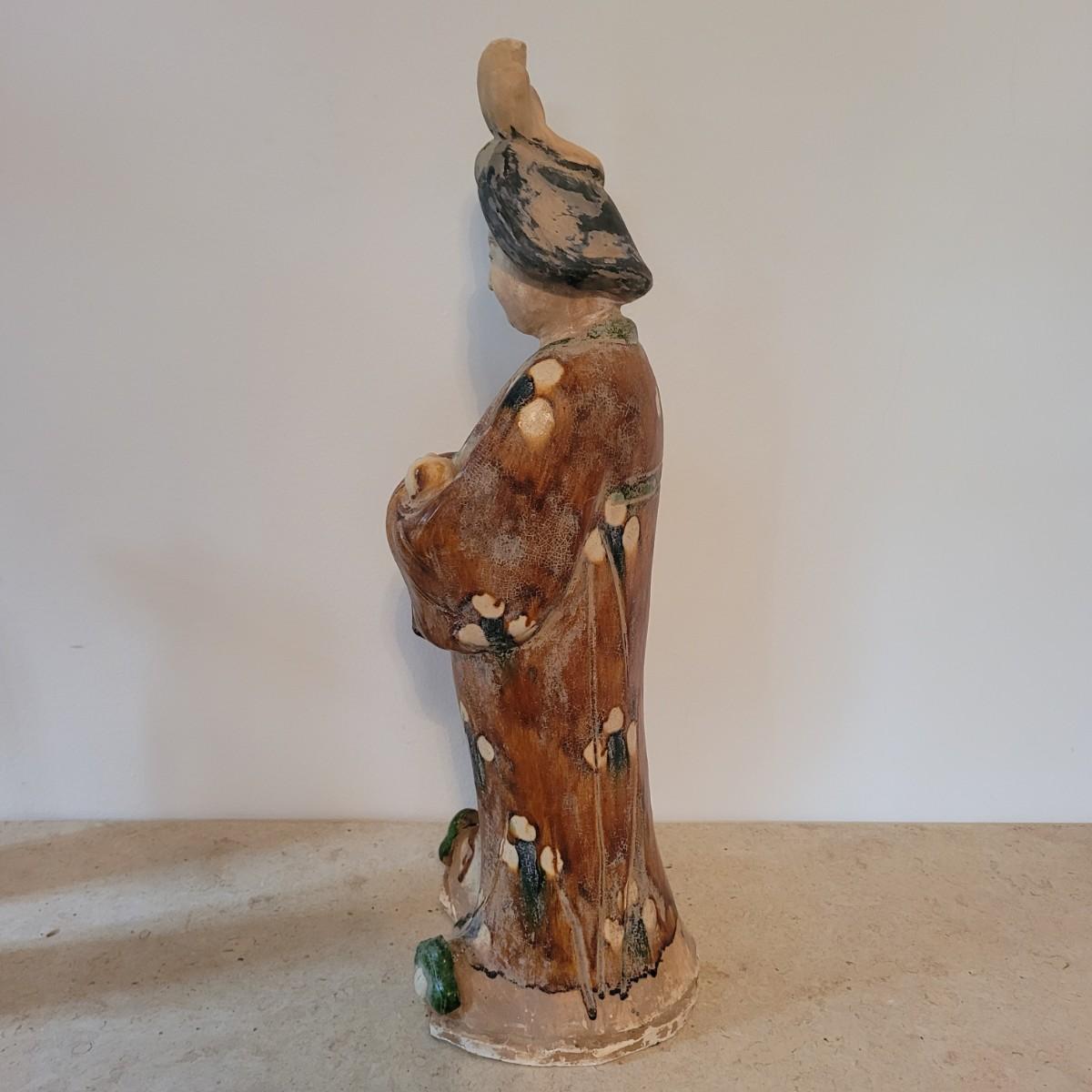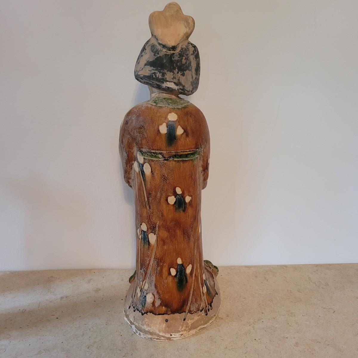 This lot includes three porcelain Chinese dynasty figurines. The first and largest piece is a Tang Dynasty style maid of honor figurine. It measures 9" x 8" x 25"H. The two smaller pieces are likely from the Quing Dynasty and depict the Yongzheng emperor and the Jiaqing emperor. Individually, these statues measure 4" x 4" x 15"H.