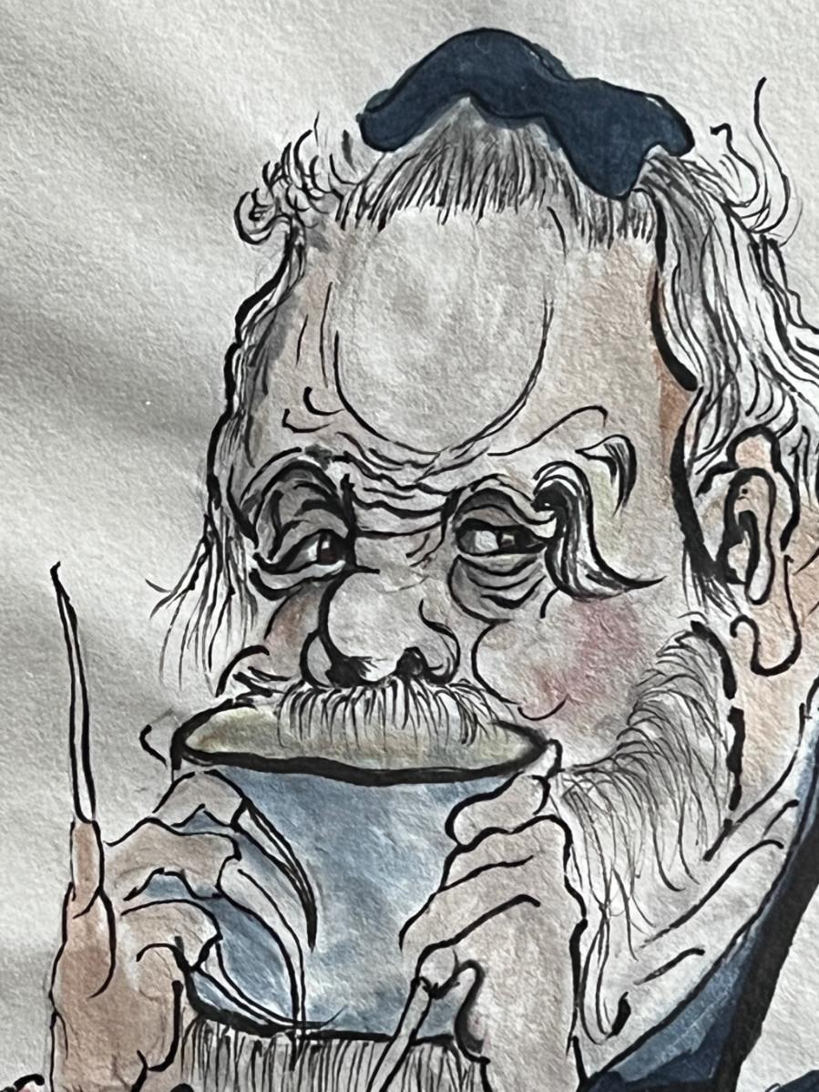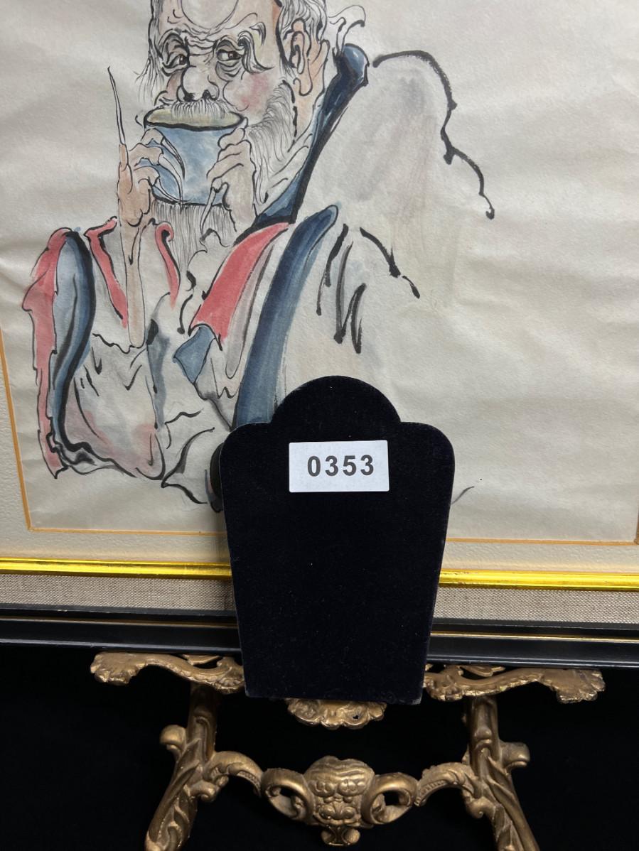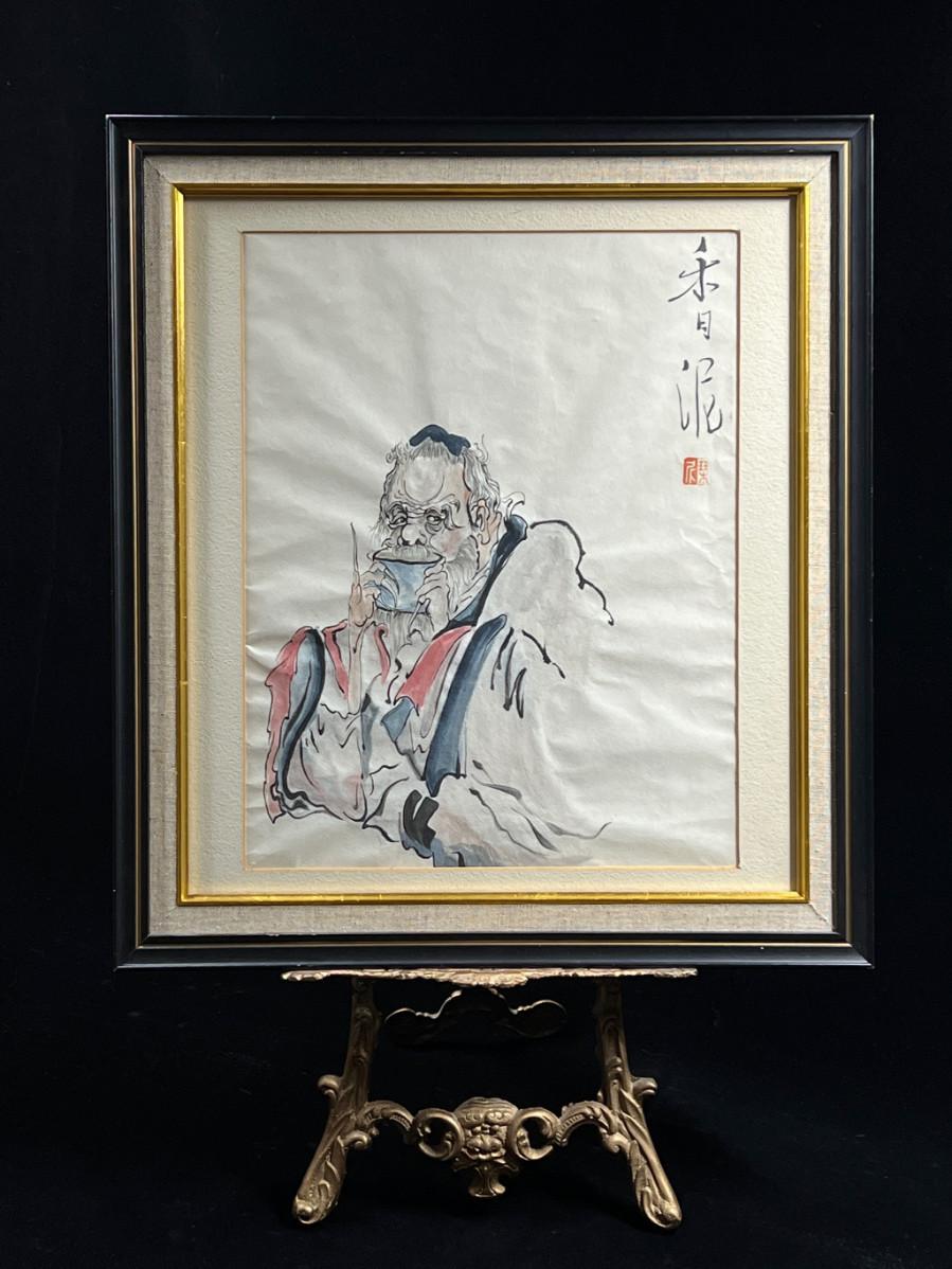 DESCRIPTION: The subject item is an original mixed media work. The oriental artist has posed the Famous Chinese Esoteric Daruma in heavy robes holding a beggars cup at mouth level.
