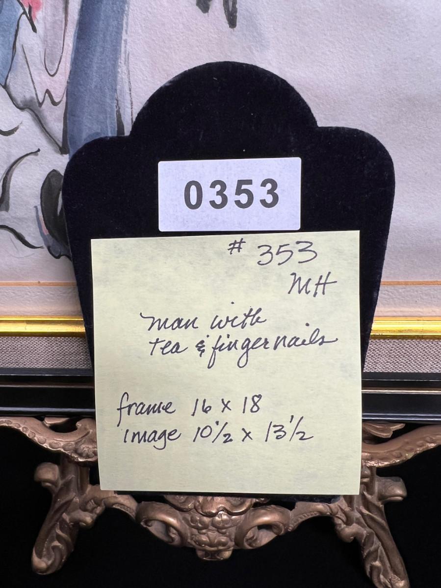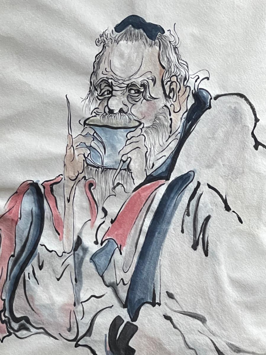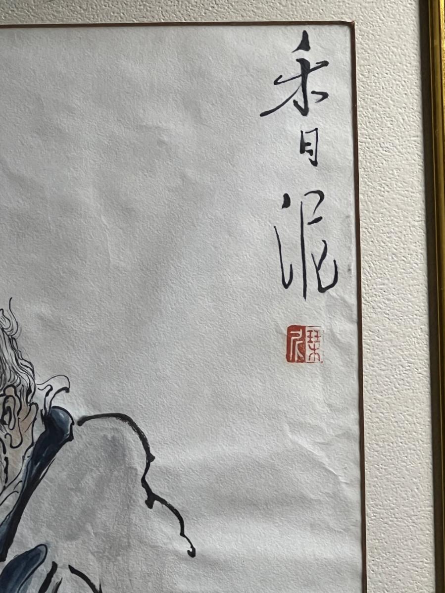 DESCRIPTION: The subject item is an original mixed media work. The oriental artist has posed the Famous Chinese Esoteric Daruma in heavy robes holding a beggars cup at mouth level.