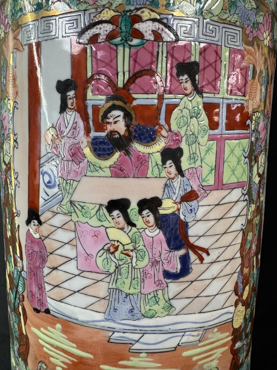 This pattern is also known as Rose Medallion. The panels on this piece depict Chinese figures in courtly or domestic scenes. There is age related wear. Measurement: 23.5”H x 8.5”W. [JP]