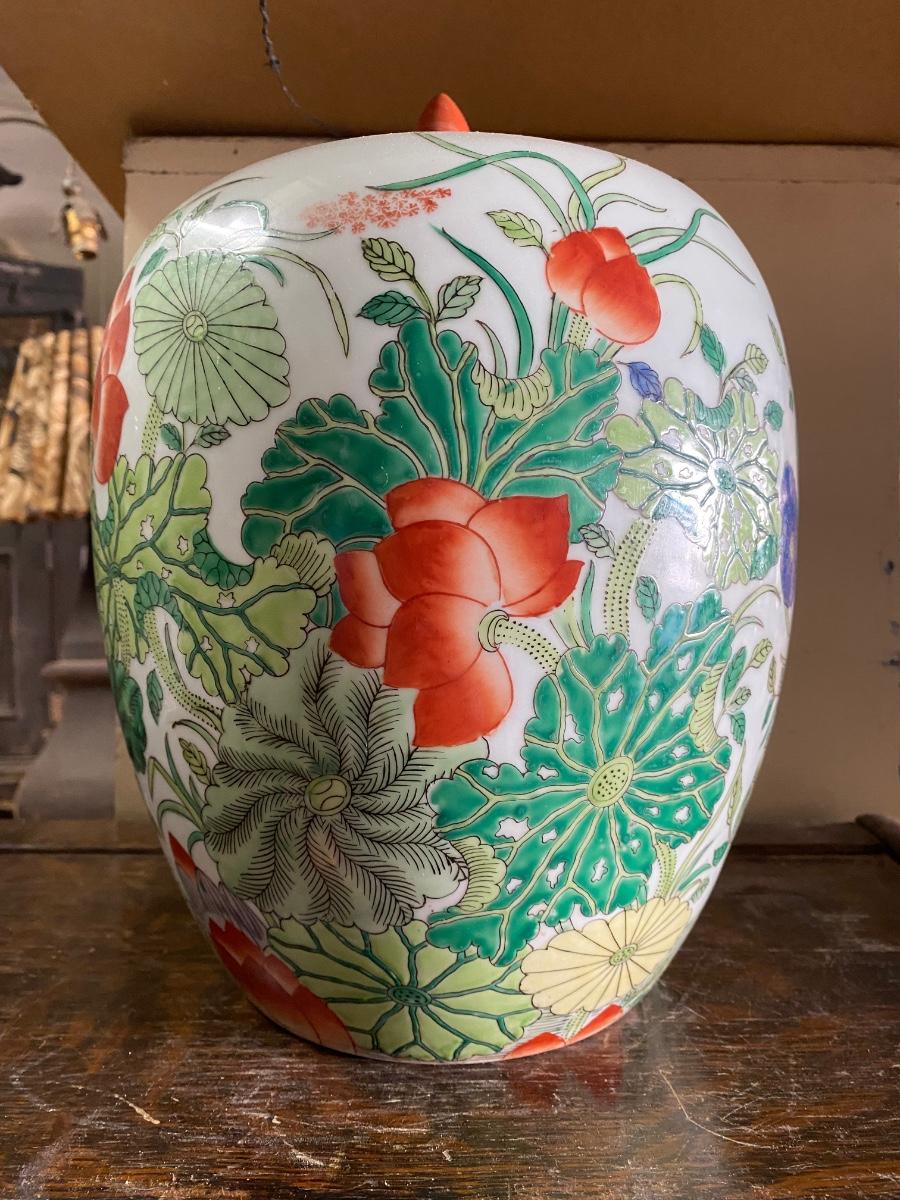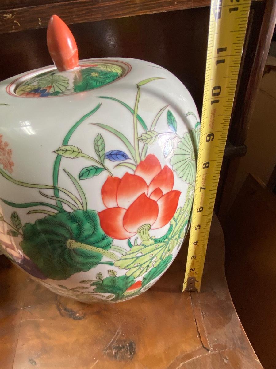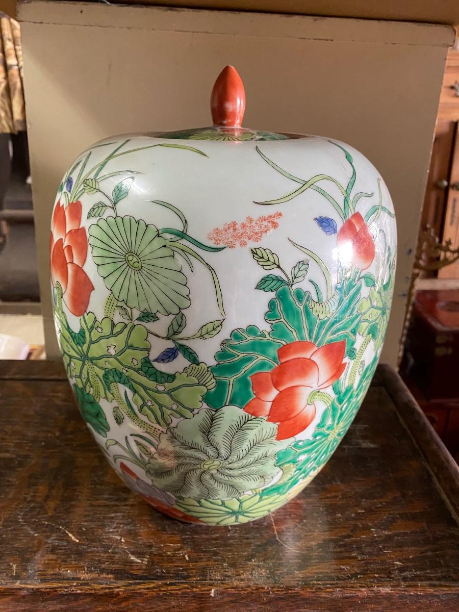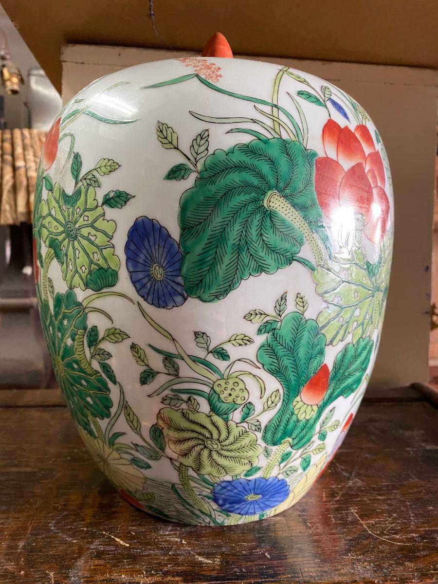 Chinese Export Porcelain Ginger Jar with lid. Beautiful floral design, possible handpainted, markd on bottom. IN excellent conditon. 12" high.
