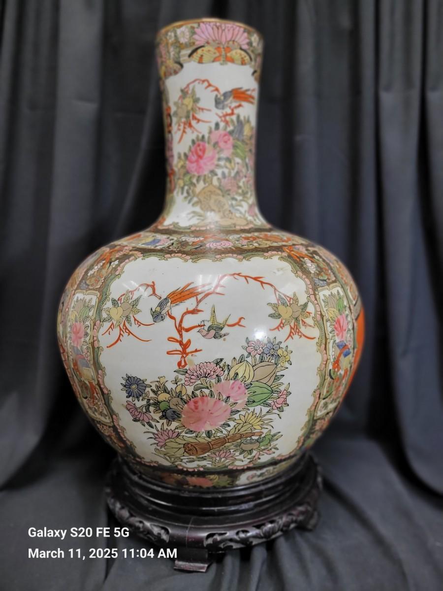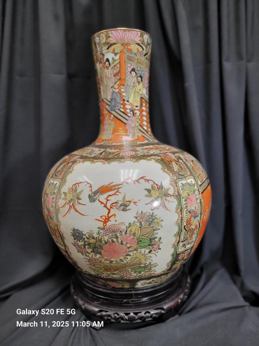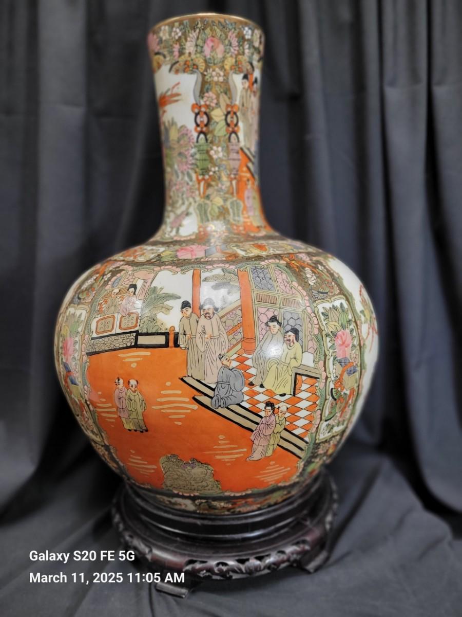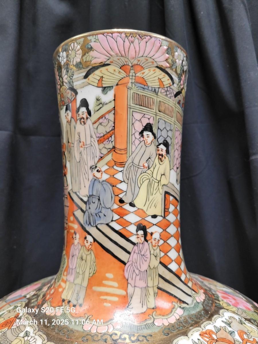 Beautiful porcelain vase with detailed scenes of figures and floral motifs showing the extravagant life of court officials. The vase stands 21 inches tall, the stand adds 3 inches. Raised painteddesign. Some light staining on the interior. It weighs 29 pounds. There are no chips or cracks. Local pickup only.