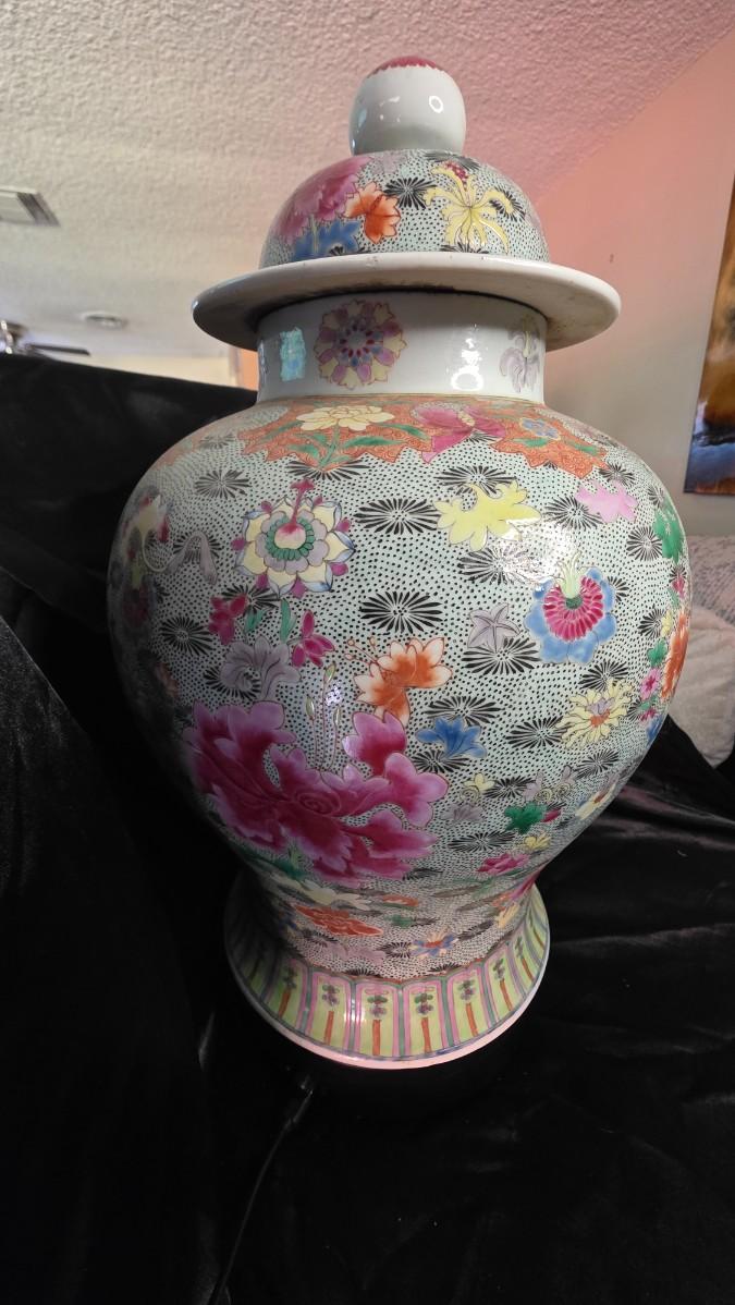 Its grand silhouette, crowned with a domed lid and soft rounded shoulders, evokes the timeless grace of Qing-era artistry. Black pin-dot detailing and layered floral patterns create depth and movement, making this jar an heirloom-worthy centerpiece that commands both attention and admiration.
