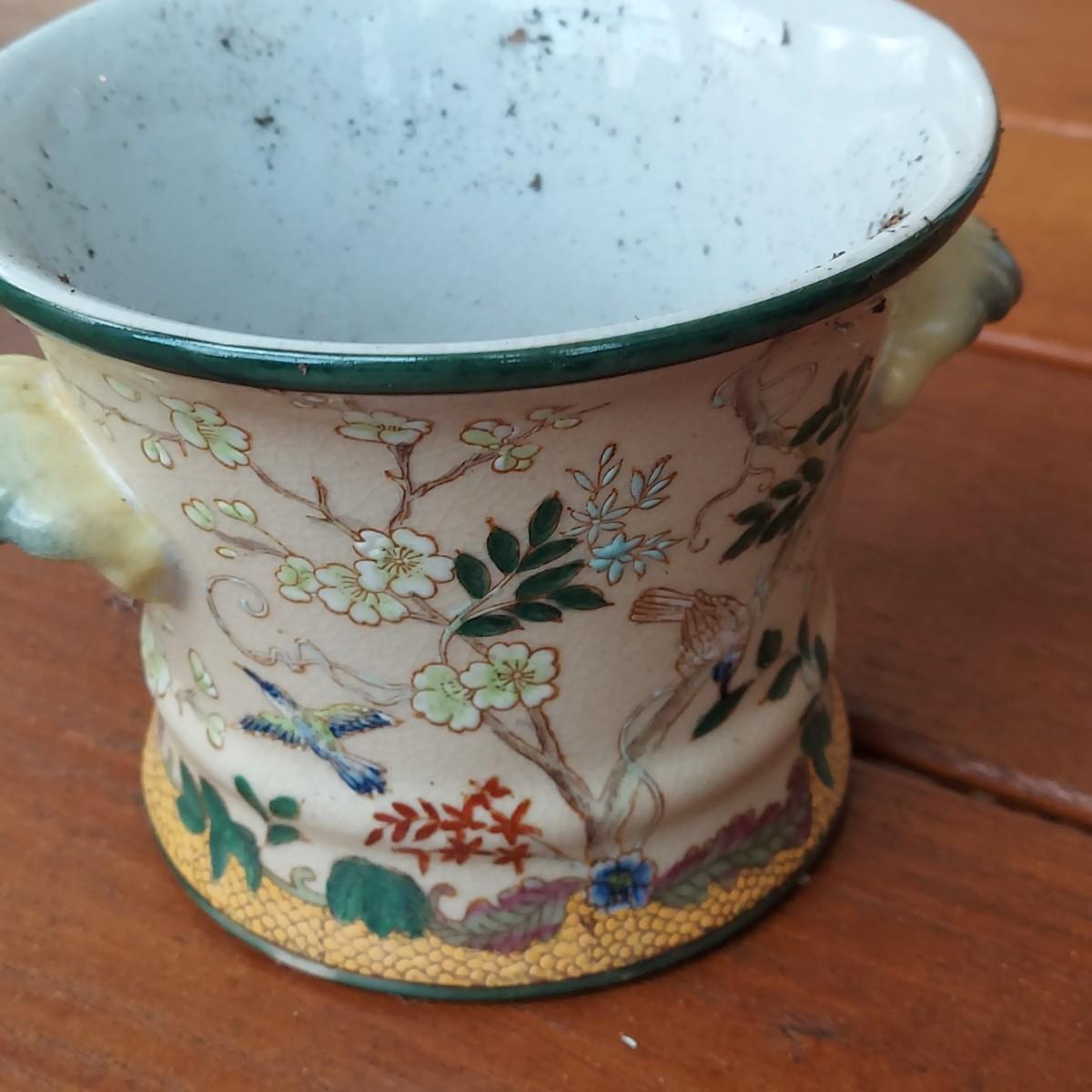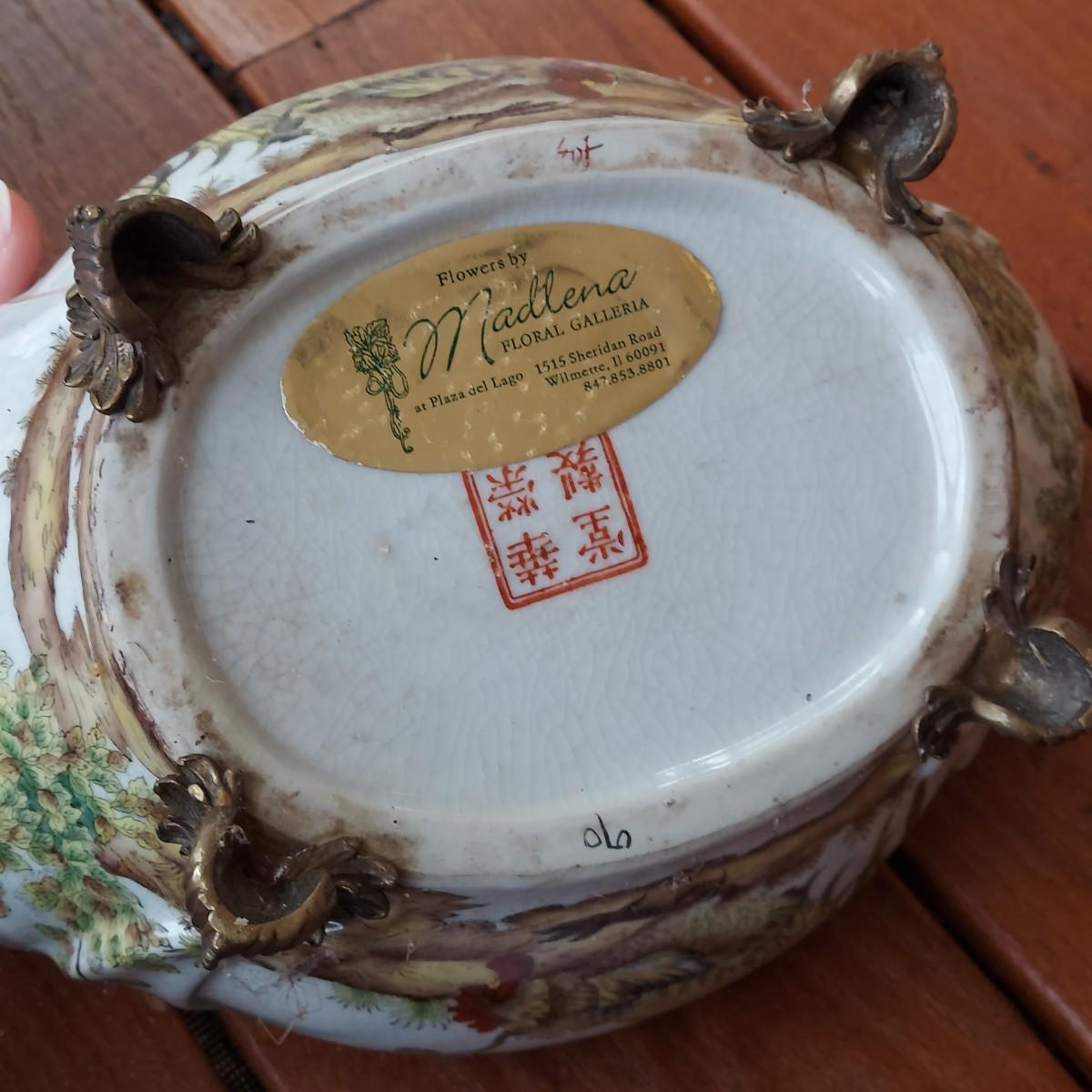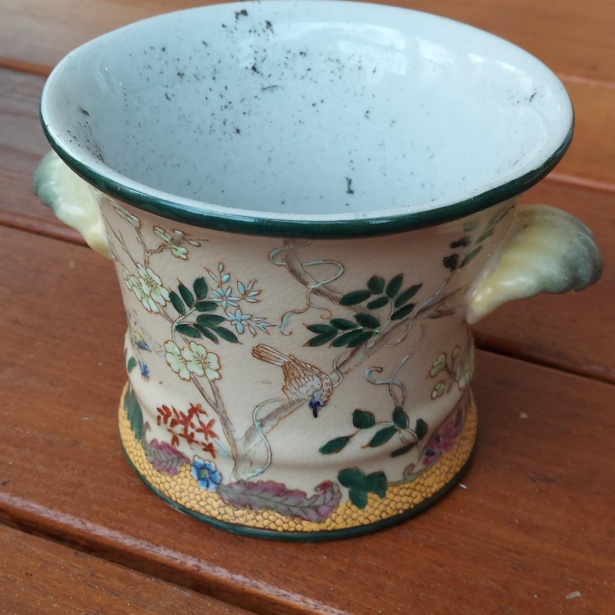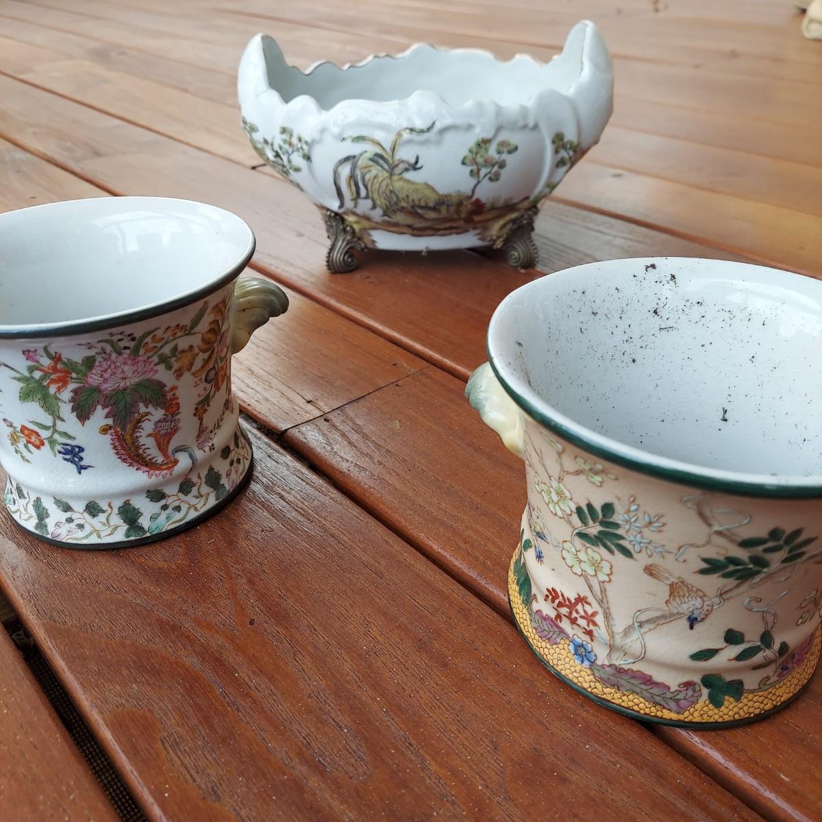 Lot includes three pots in a Chinese Famille porcelain style. The glaze style has a crazing effect. The large, footed pot measures 10” x 7” x 6"H. Please see photos for details. Shipping available