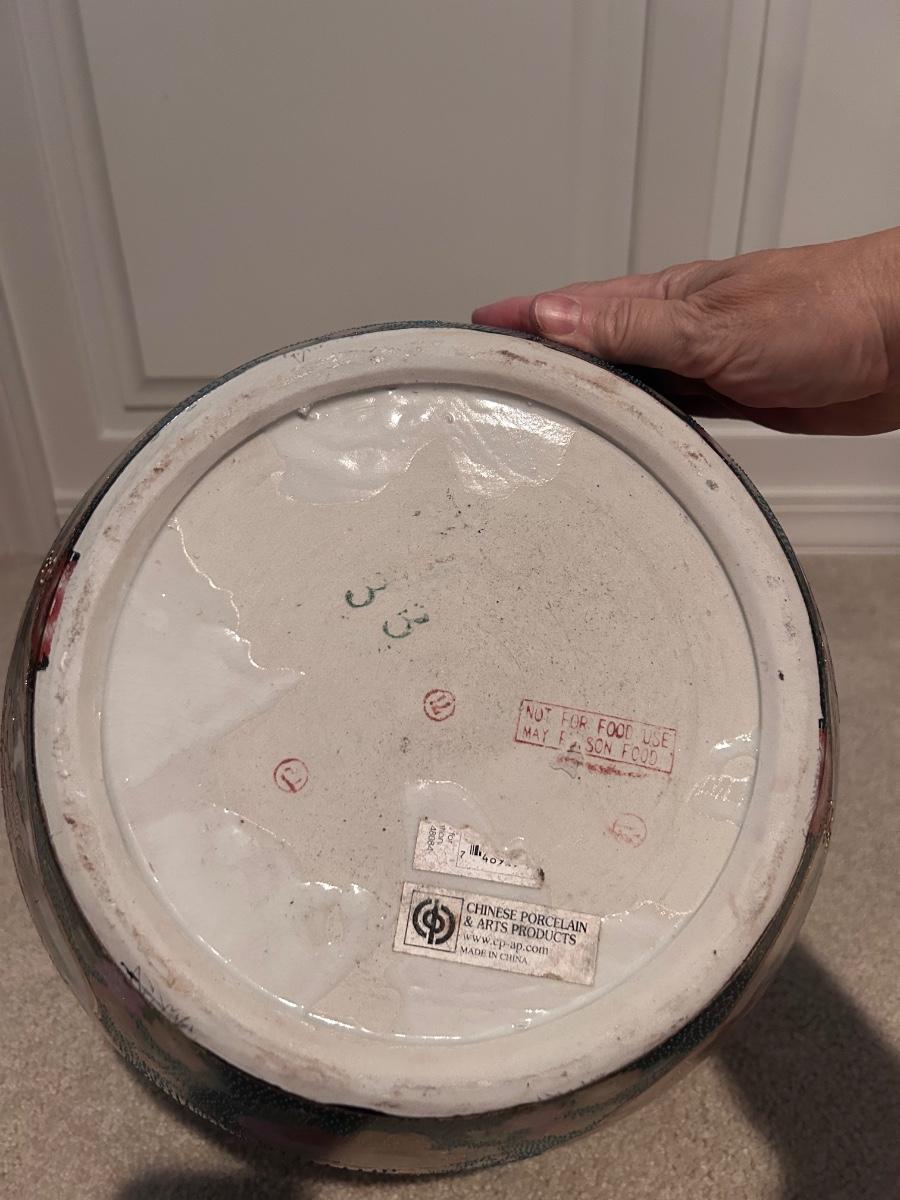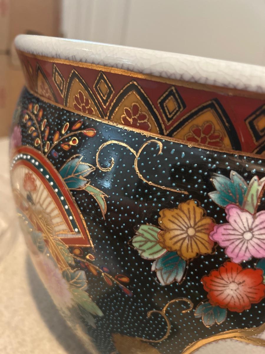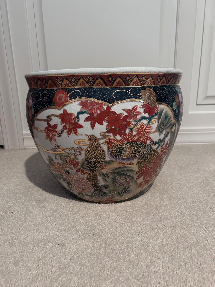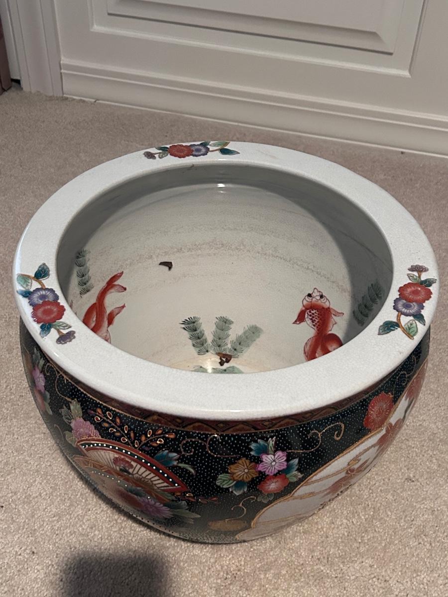 Ceramic Chinese Fishbowl planter with no known blemishes. Piece measures 14"D x 11.5”H. The dots and gold are raised giving the surface texture. Shipping available. Shipping can be costly. We suggest contacting our preferred local shipping provider, Postage Express, with dimensions and getting an estimate before bidding: (828) 255-9250 or shipping@postageexpressnc.com.