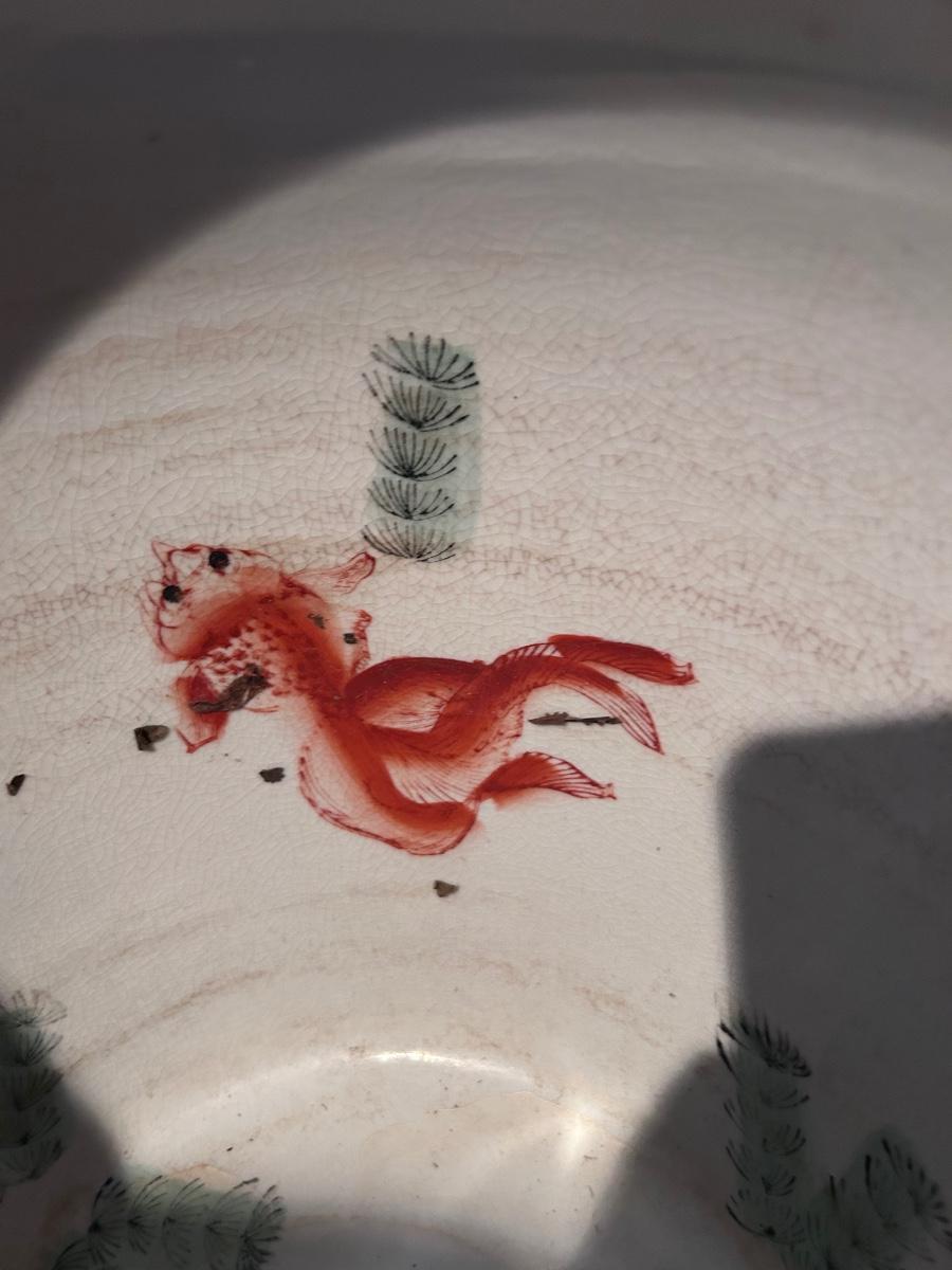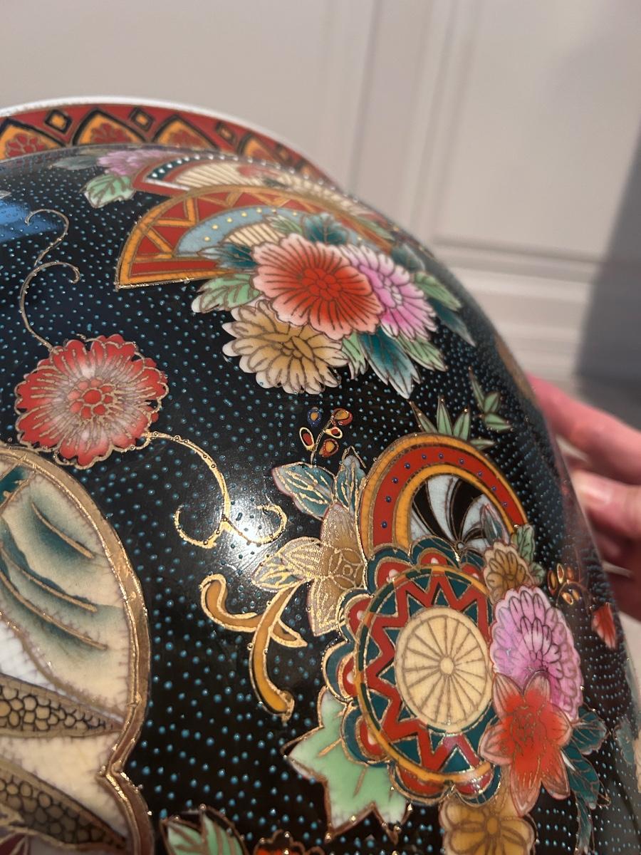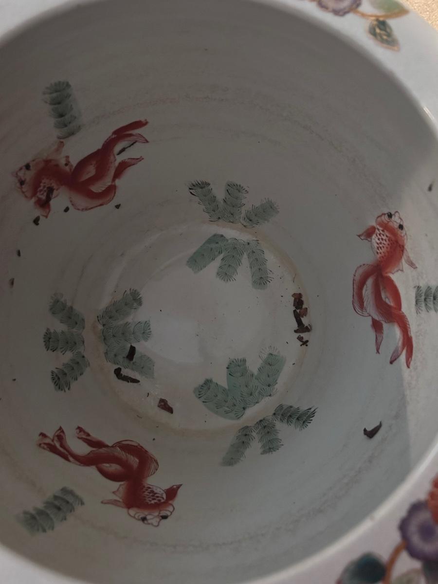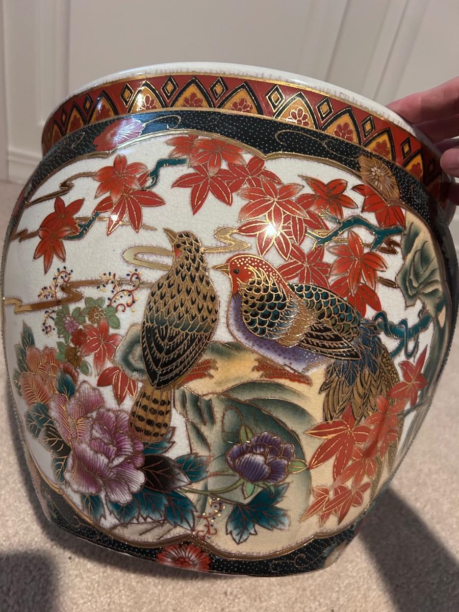 Ceramic Chinese Fishbowl planter with no known blemishes. Piece measures 14"D x 11.5”H. The dots and gold are raised giving the surface texture. Shipping available. Shipping can be costly. We suggest contacting our preferred local shipping provider, Postage Express, with dimensions and getting an estimate before bidding: (828) 255-9250 or shipping@postageexpressnc.com.