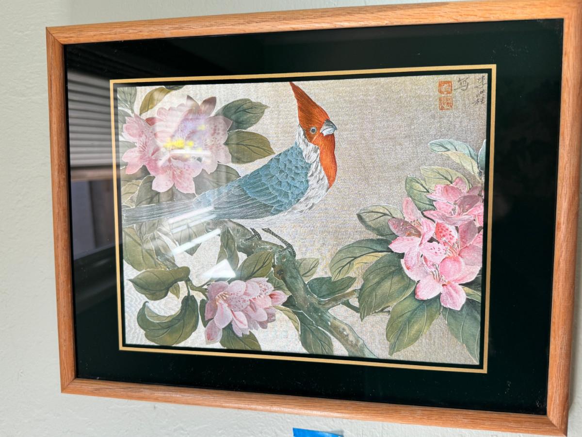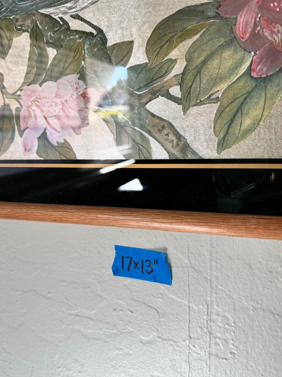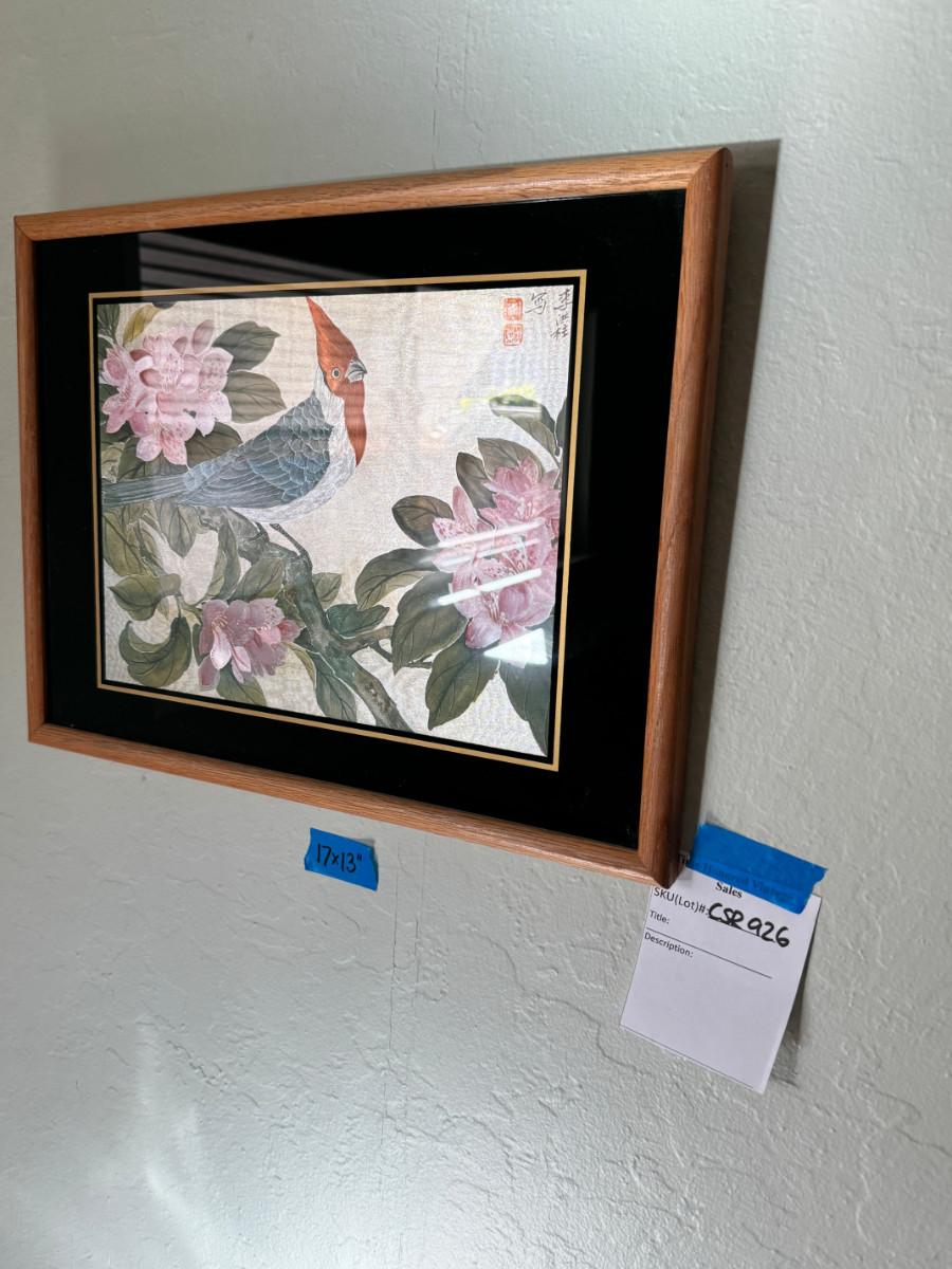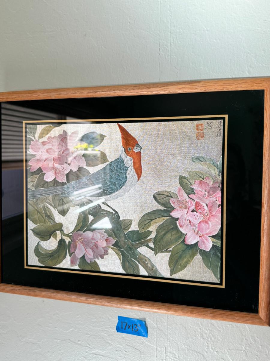 Beautiful handmade Chinese painting on silk and foil art picture with botanical and bird theme. The art work itself has a metallic sheen. wood frame and professional black mat in good condition with very minor wear. Measures 17 X 13" inches
