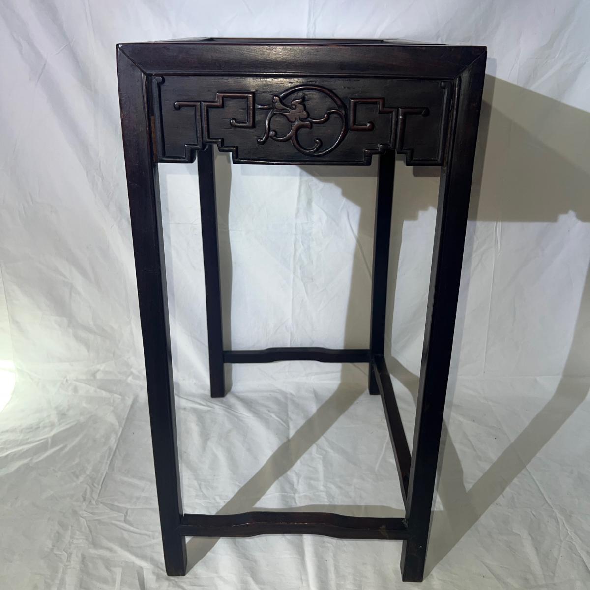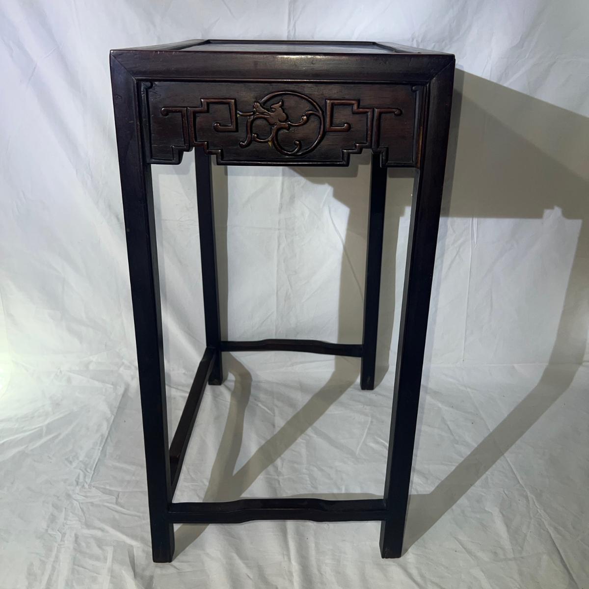 Chinese hand Carved Side table/ prayer table/ plant stand. Has a red hue to the wood, has slight separation of wood on top from sides. 17 1/2" x 12 1/2" x 24 1/2"