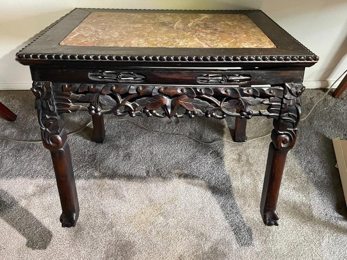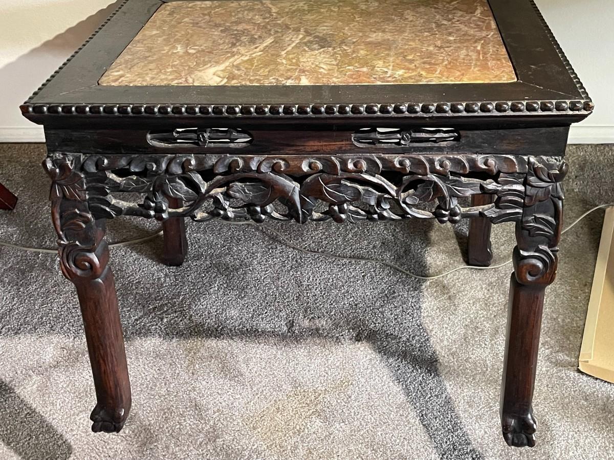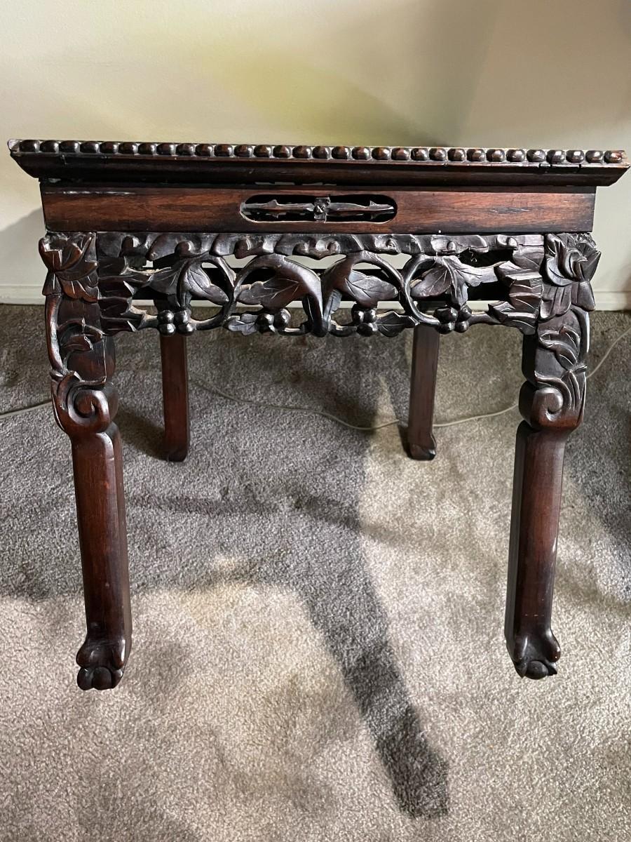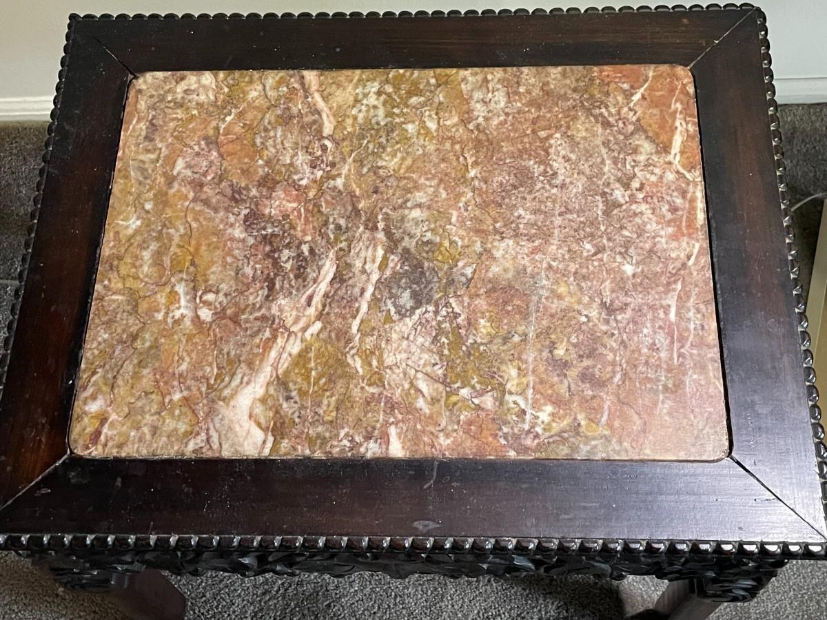 Chinese Hongmu Carved Side Table w/Agate/Marble Slab Top Qing Dynasty 19th Century 22" x 17" x 17.5" in Good Preowned Condition. (Pickup Only in Berlin, NJ 08009)