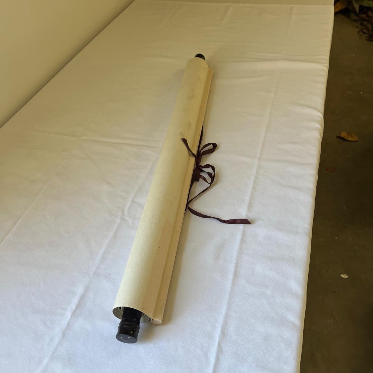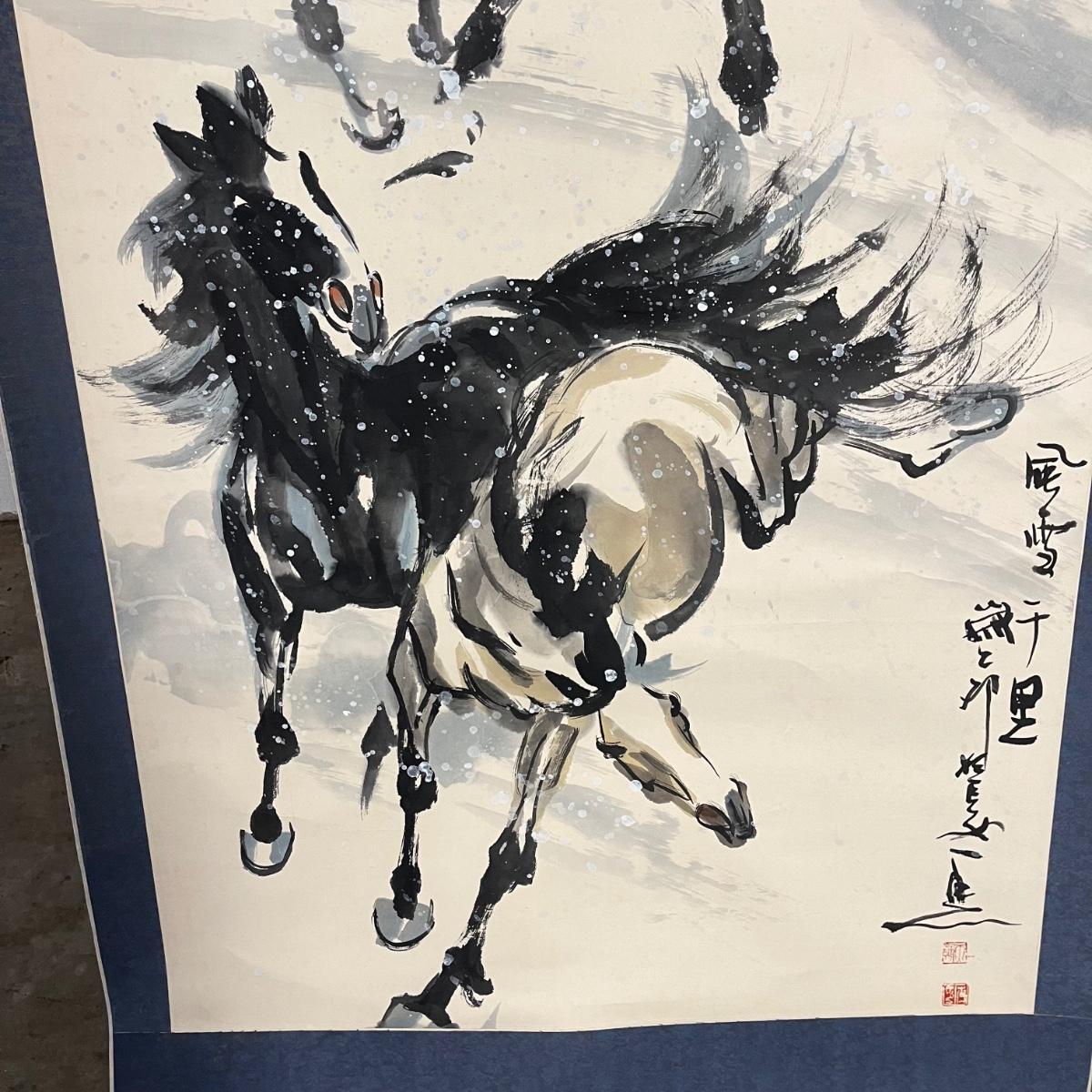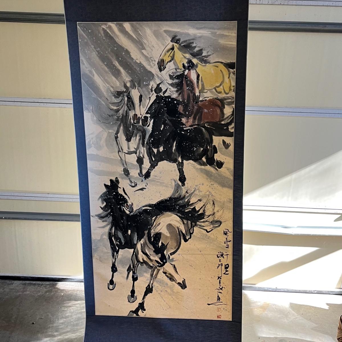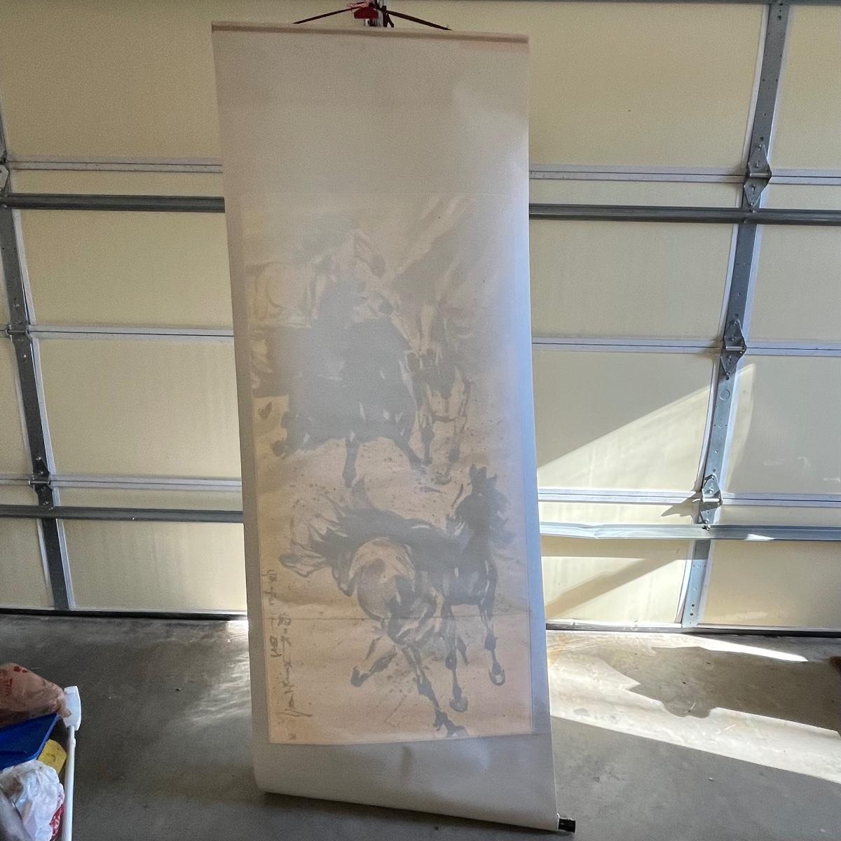 Scroll Painting done in a Chinese Ink Wash featuring galloping horses. Lovely details. Paper backing but feels “fabric-like” on the front. Measures 29” x 78”H. The attached wooden rods are 32.5”W.