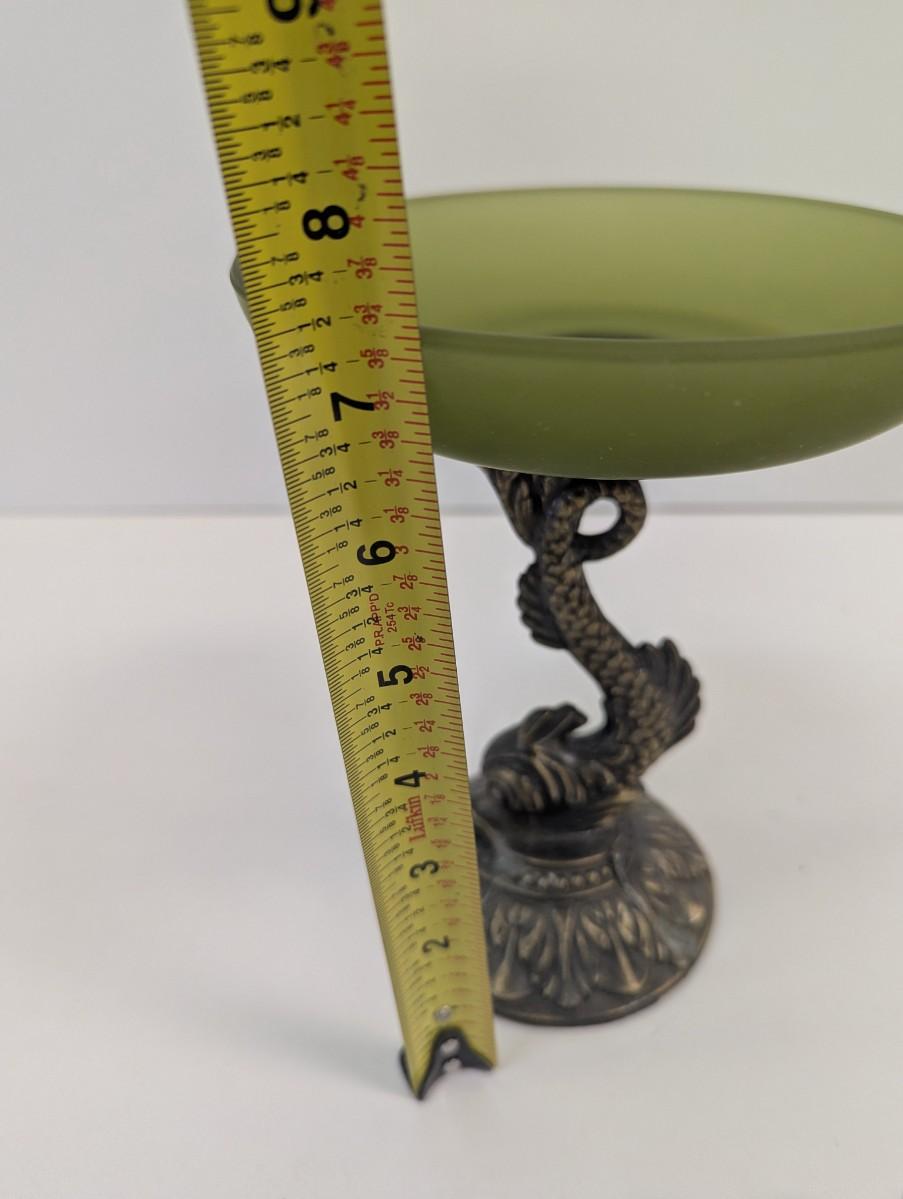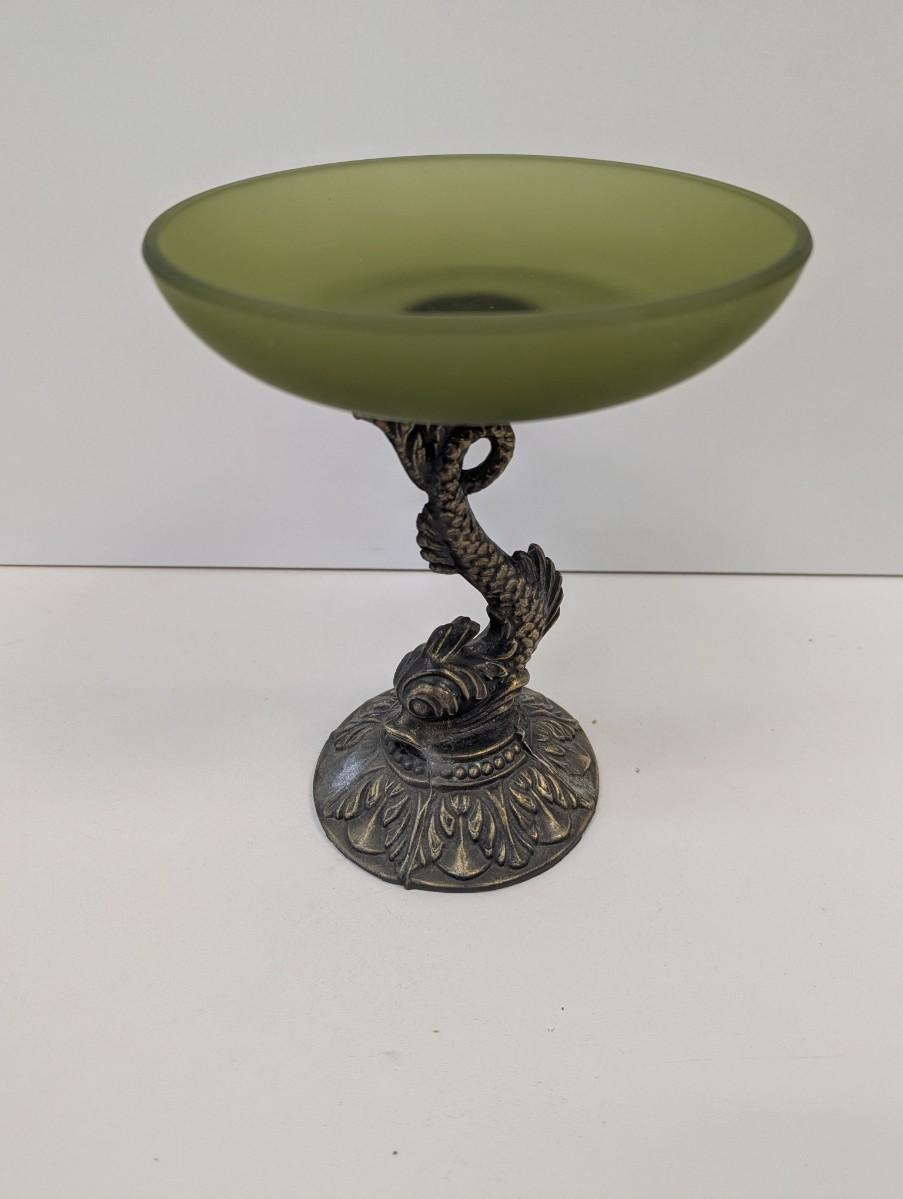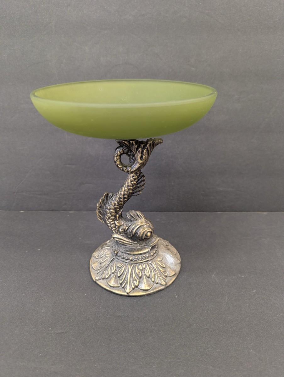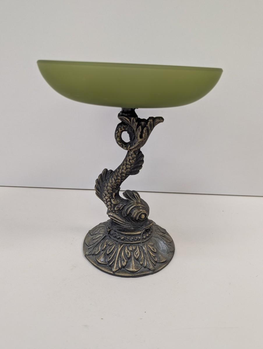 Chinese Koi Fish Bronze Metal Base With Green Trinket Dish 9 1/4" Tall