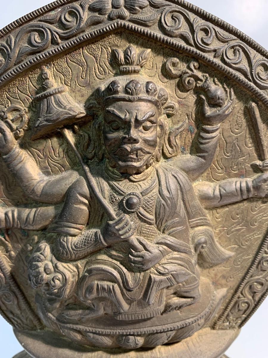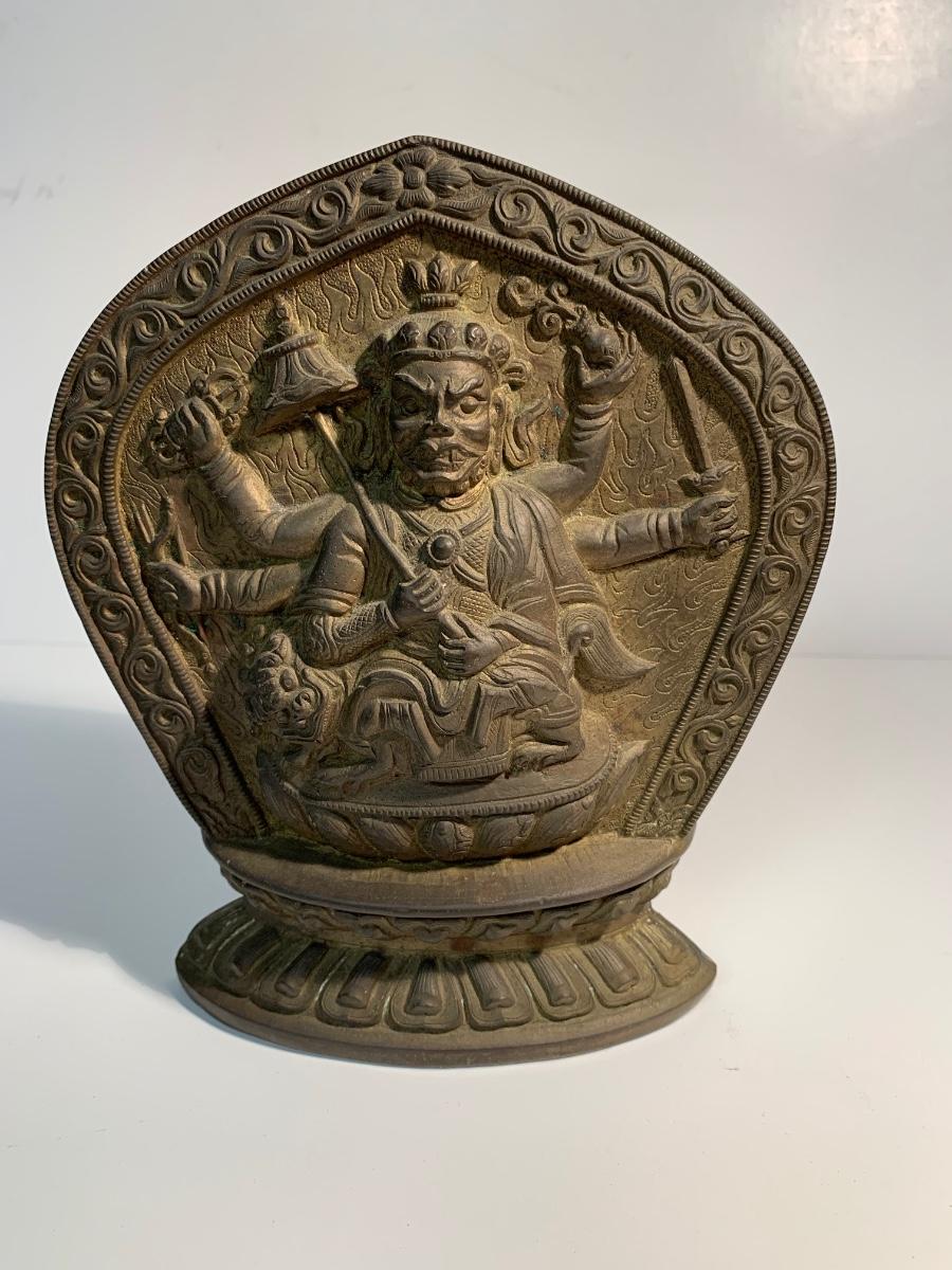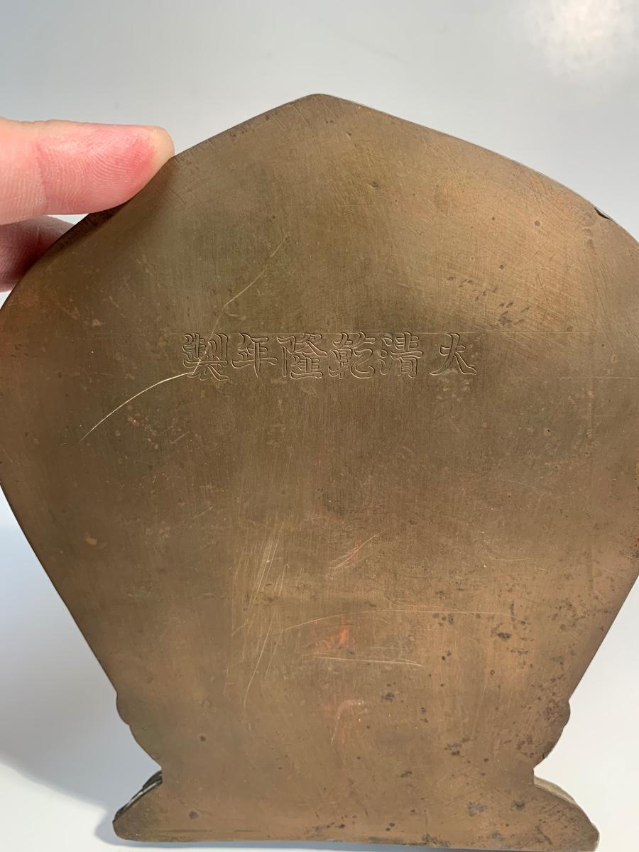 Antique metal Chinese deity beautifully cast showing great detail and signed on the back