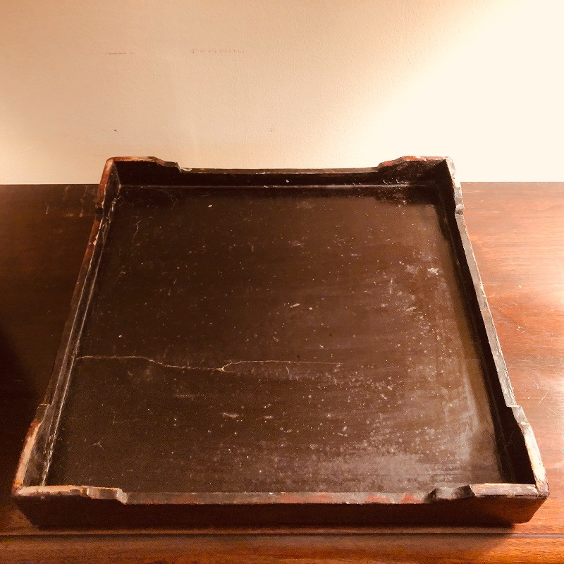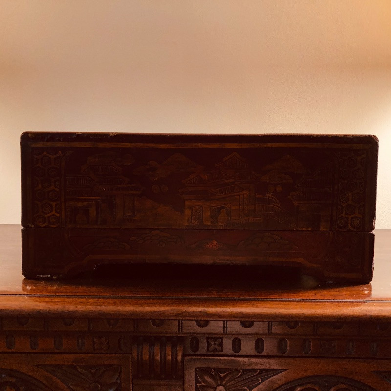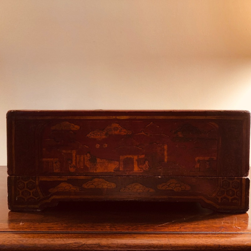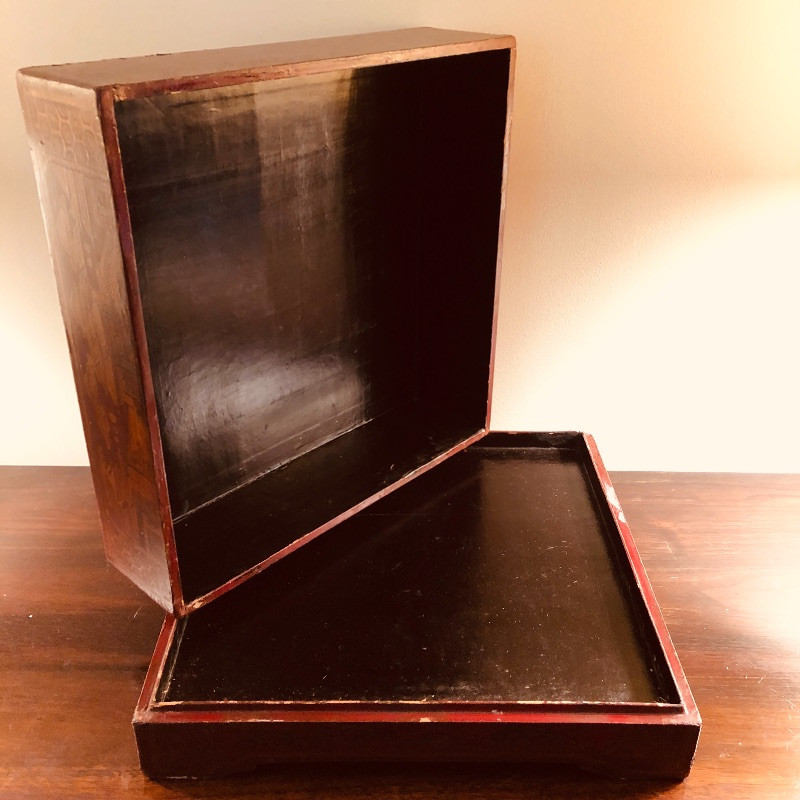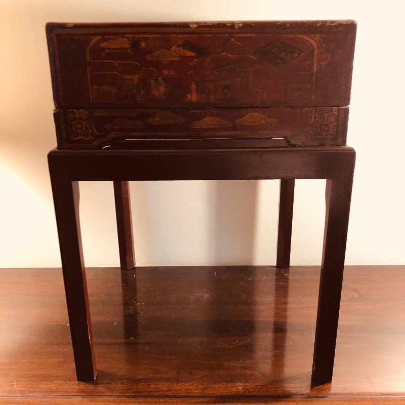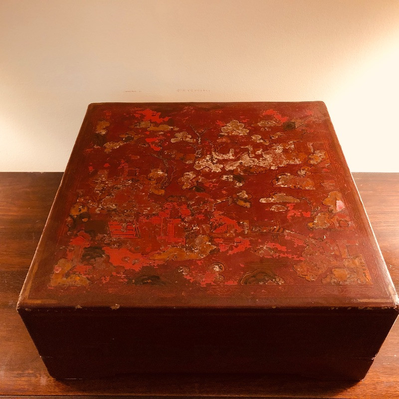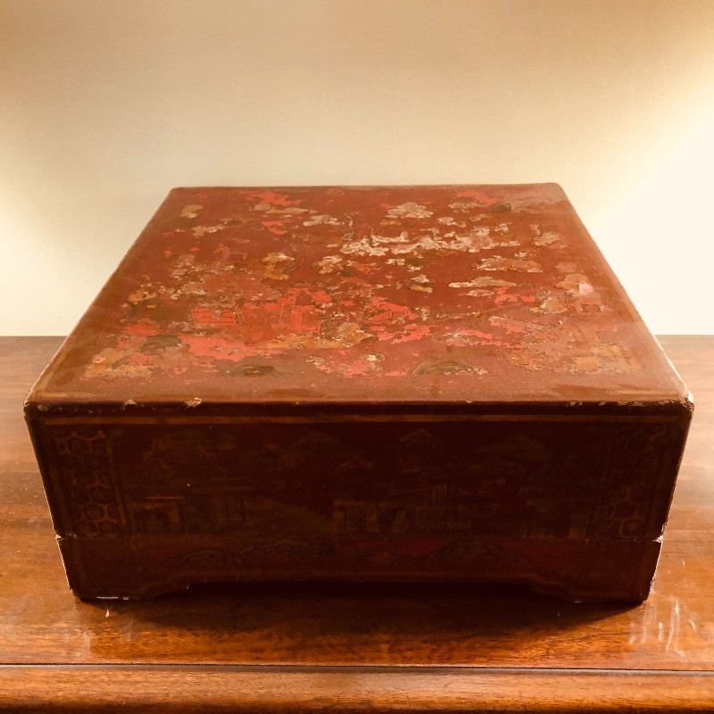 Red paint, some chipping due to age, size of box is 17-3/4” square, 17-1/2”h with stand 24-1/2”h