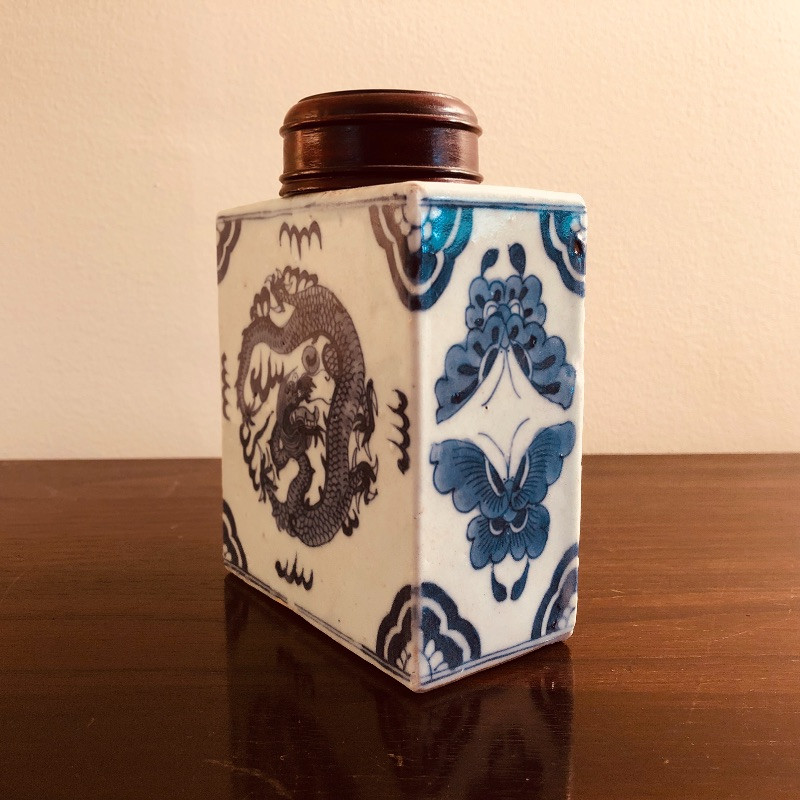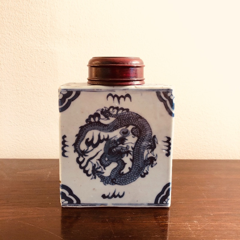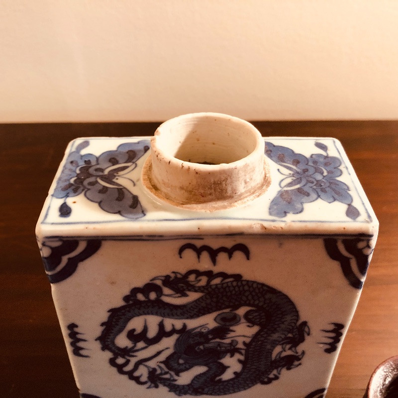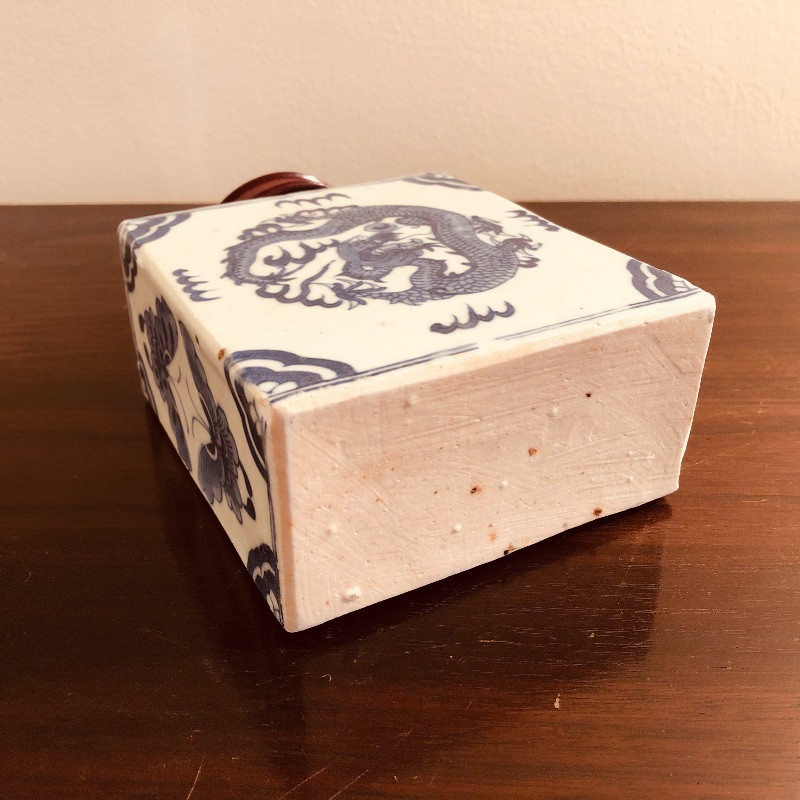 Antique porcelain flask with wood rop