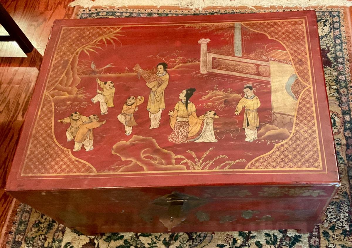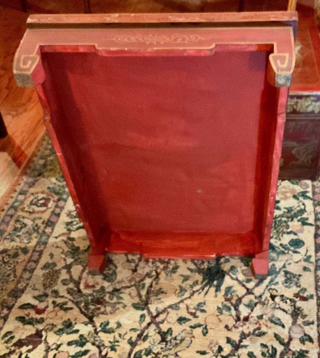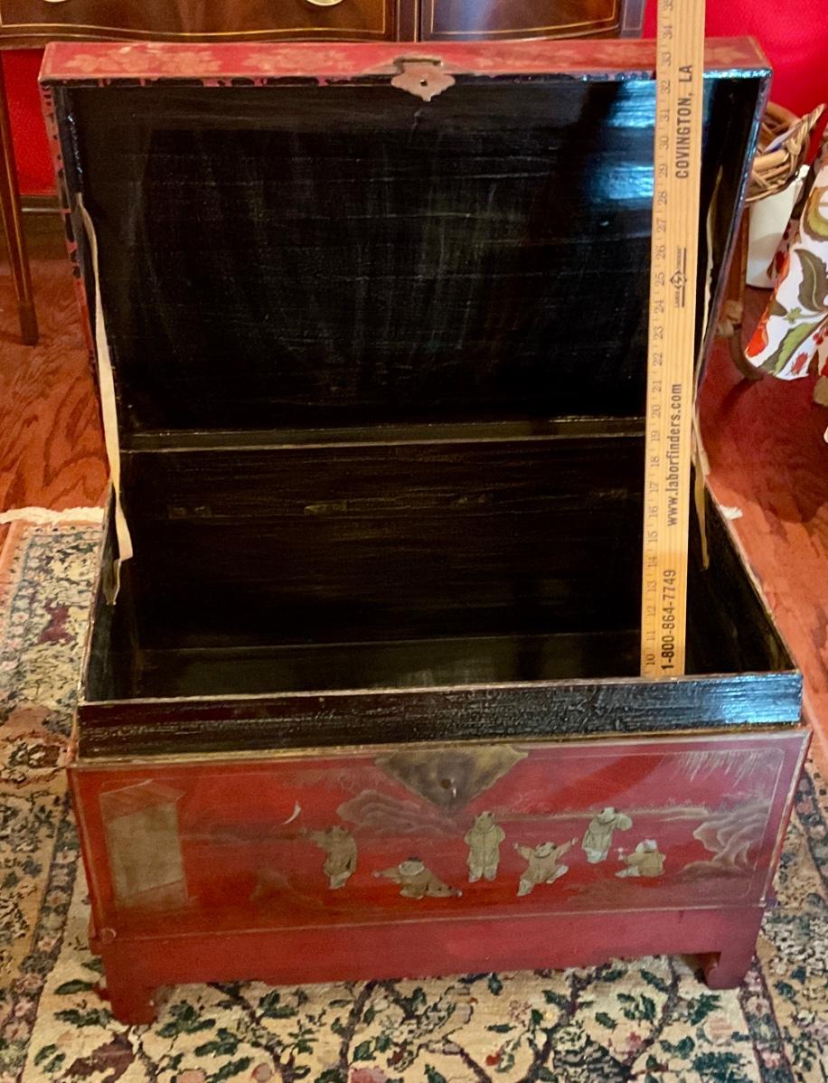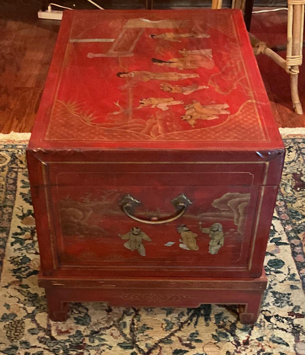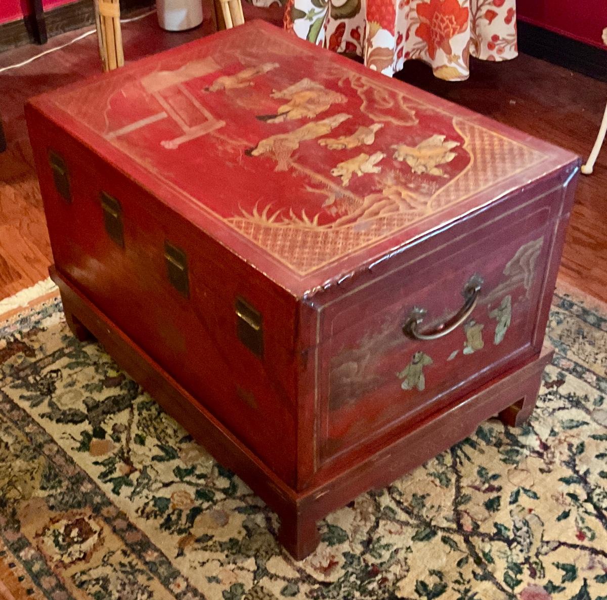 Chinese red lacquer chest on stand, used a coffee table, great storage