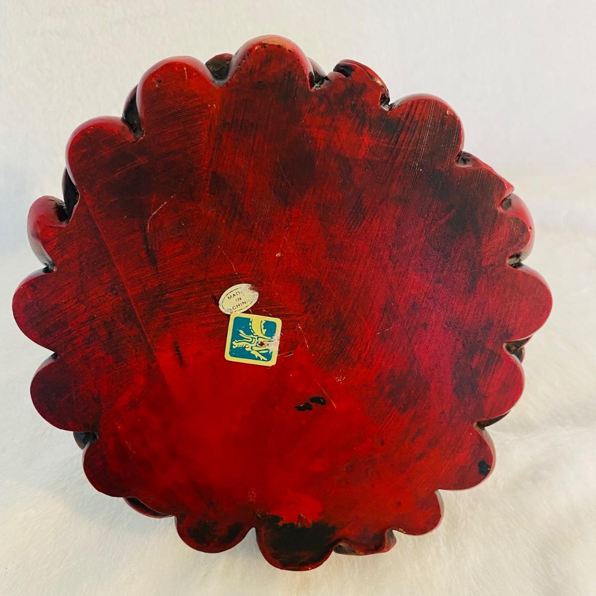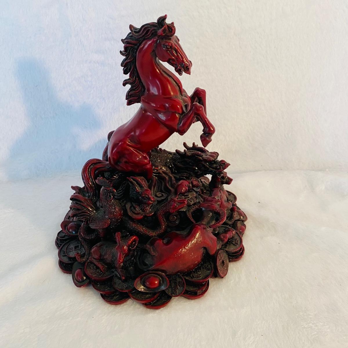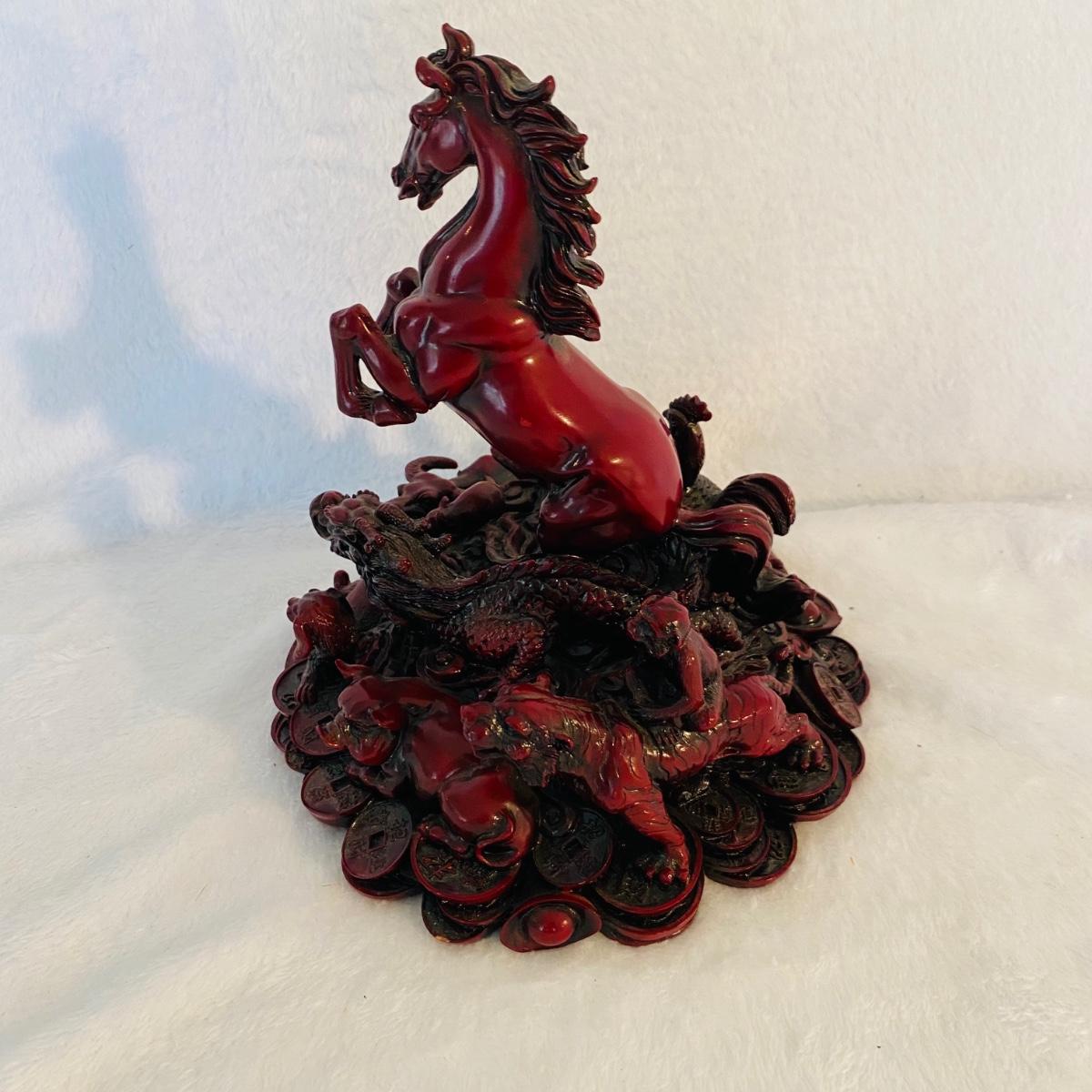 Chinese red resin galloping horse figurine/sculpture. Measures 7”L x 7”W x 8.5”H.