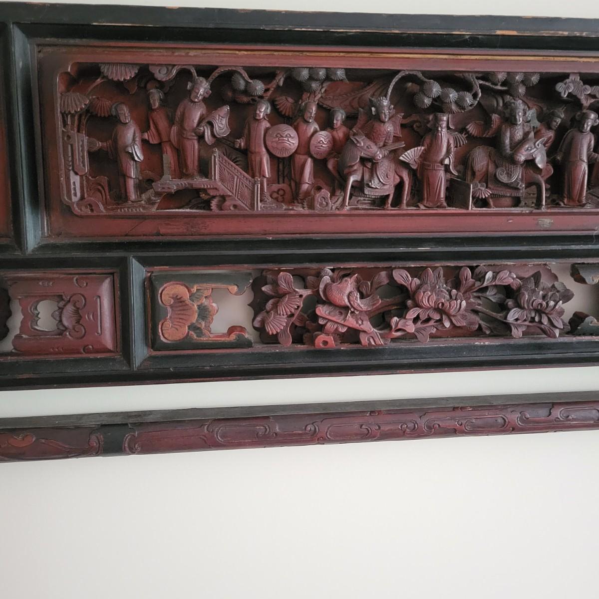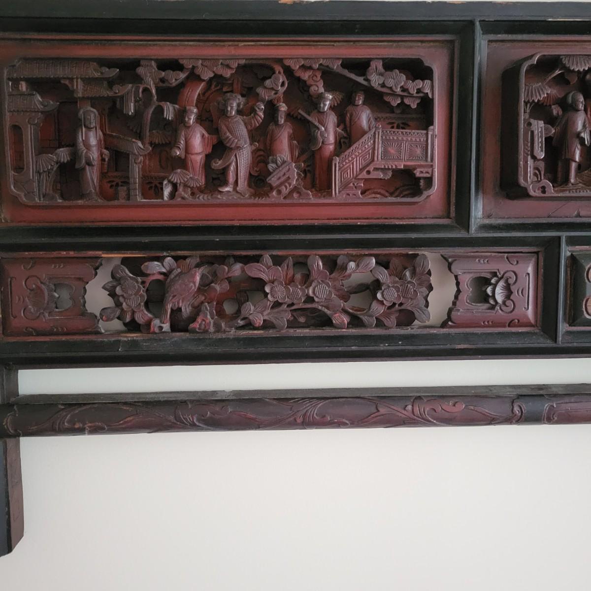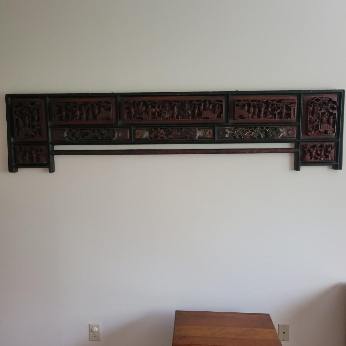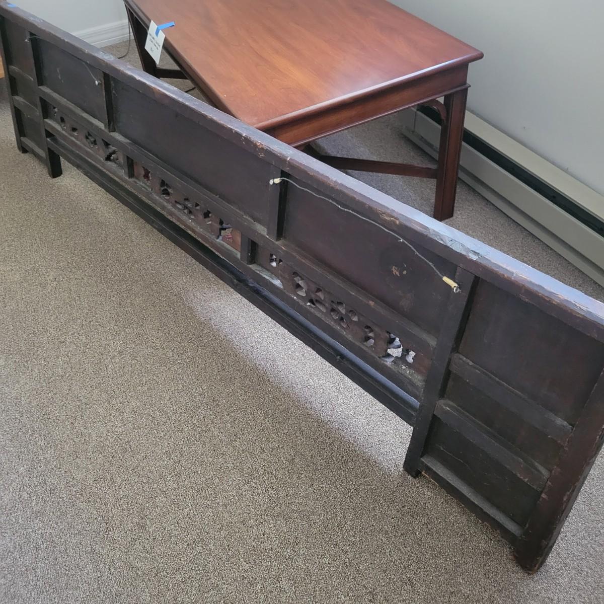 An exquisitely carved Oriental panel hand crafted from rosewood. This piece features 10 intricately carved panels and appears to be old. The bar in the middle could be used for hanging tapestries but is not removable. It measures approximately 78" x 2.5" x 18.5"H amd the horizontalbar measures approximately 58" in length. Local pickup only. Check out our Sterling Transitions You Tube channel for a nice video showing all the details on this piece!