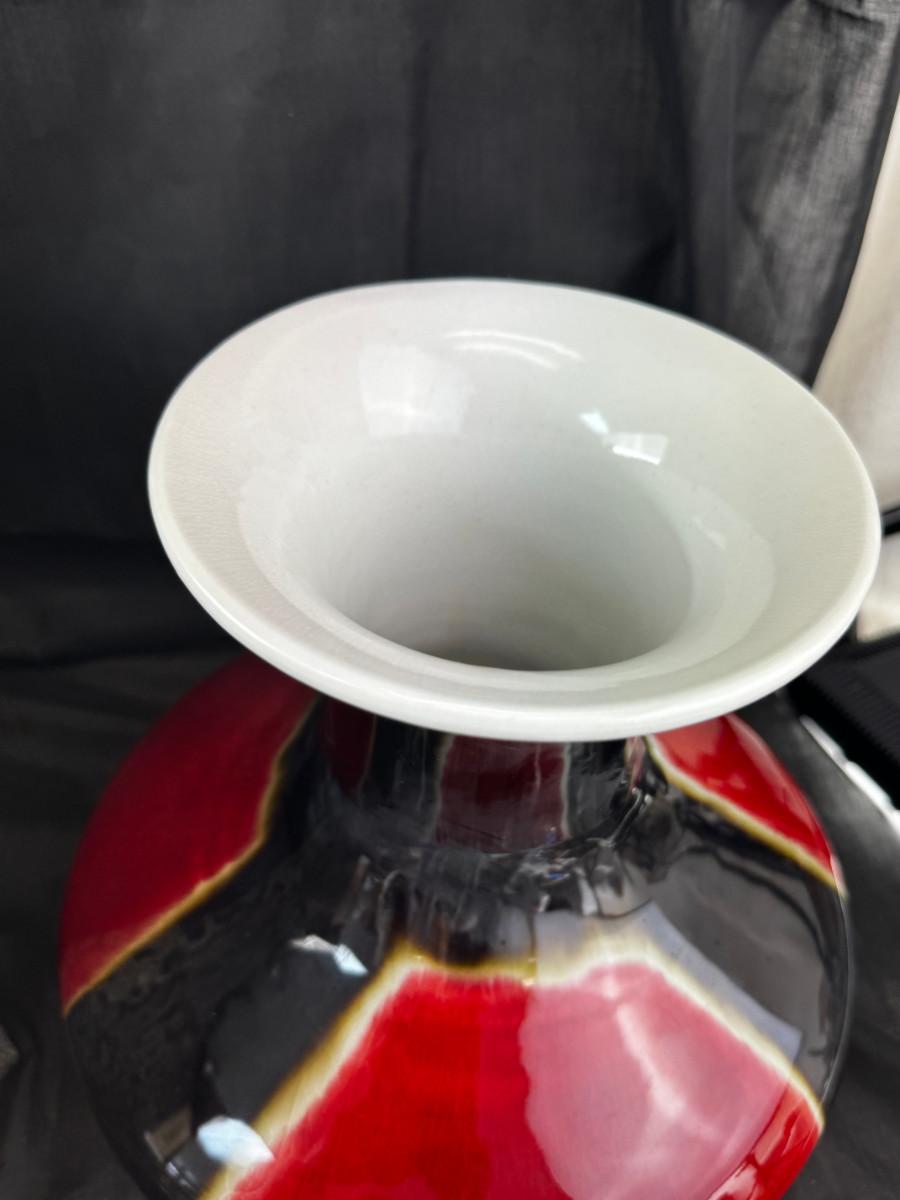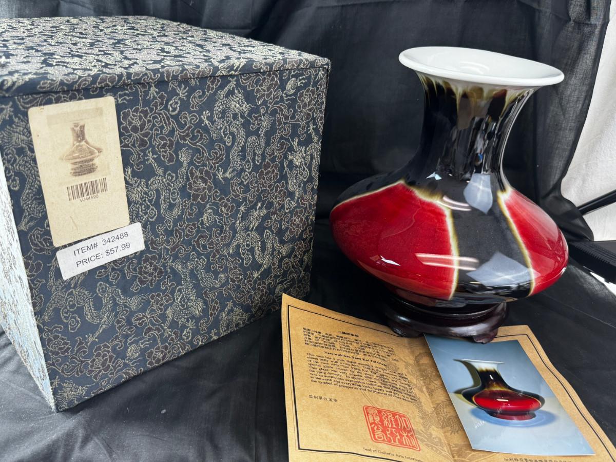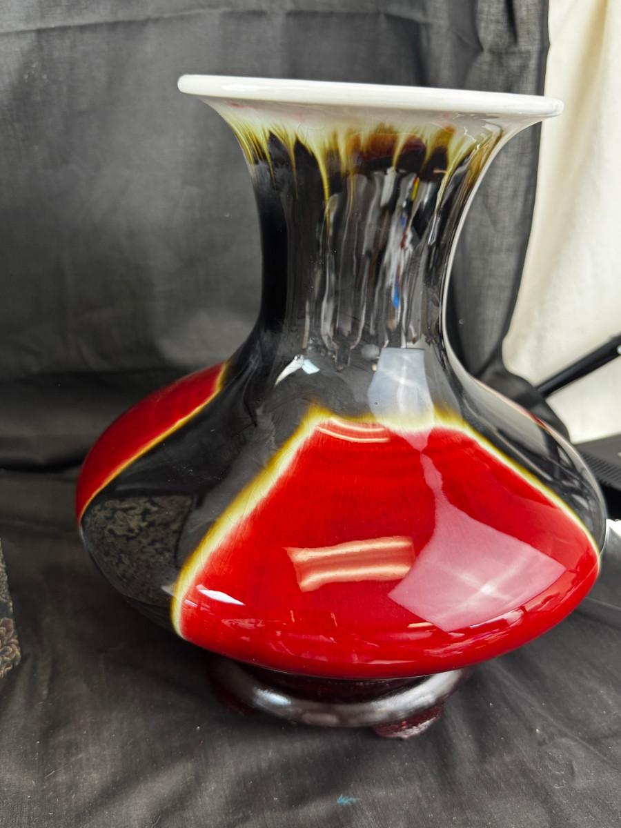 A beautiful, high quality Chinese porcelain 'Sang de Boeuf' and Black Flambe Vase in outstanding condition. With original box and paperwork. Chinese sang de boeuf" (oxblood) red, black, and yellow transmutation glaze, all under a fine and controlled crackle.. The vase has a squat, bulbous body and a flared neck with a white rim. It sits on a carved rosewood display stand. I have 2 of these in this auction on consignment from the estate of an Asian collector. This is the taller one.