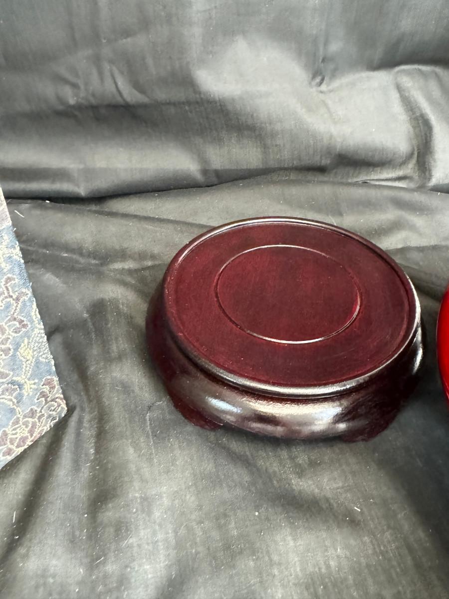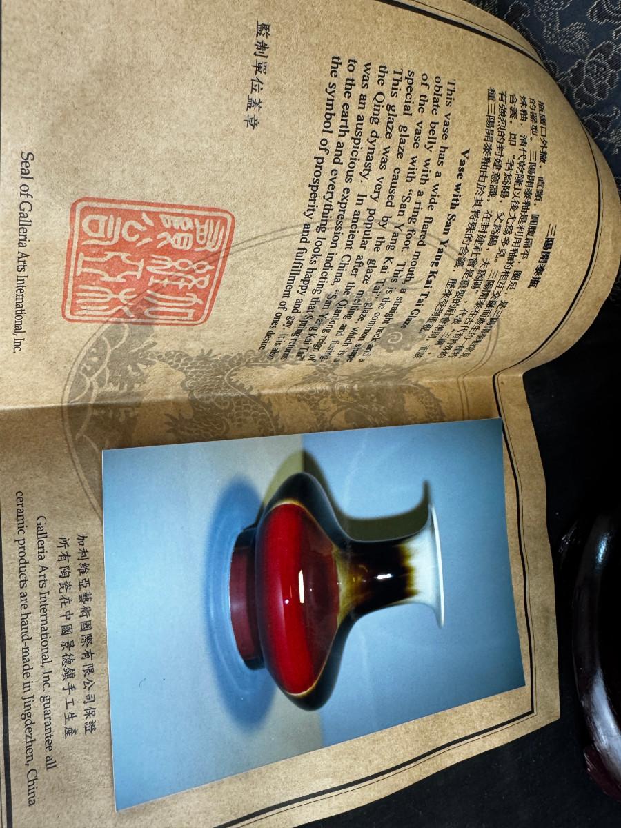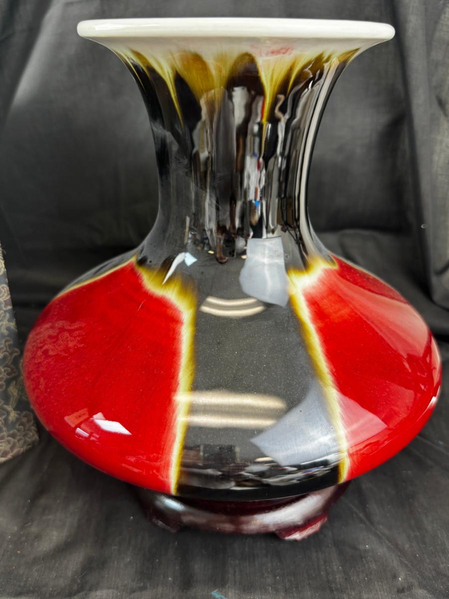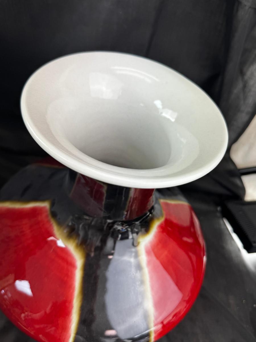 A beautiful, high quality Chinese porcelain 'Sang de Boeuf' and Black Flambe Vase in outstanding condition. With original box and paperwork. Chinese sang de boeuf" (oxblood) red, black, and yellow transmutation glaze, all under a fine and controlled crackle.. The vase has a squat, bulbous body and a flared neck with a white rim. It sits on a carved rosewood display stand. I have 2 of these in this auction on consignment from the estate of an Asian collector. This is the taller one.