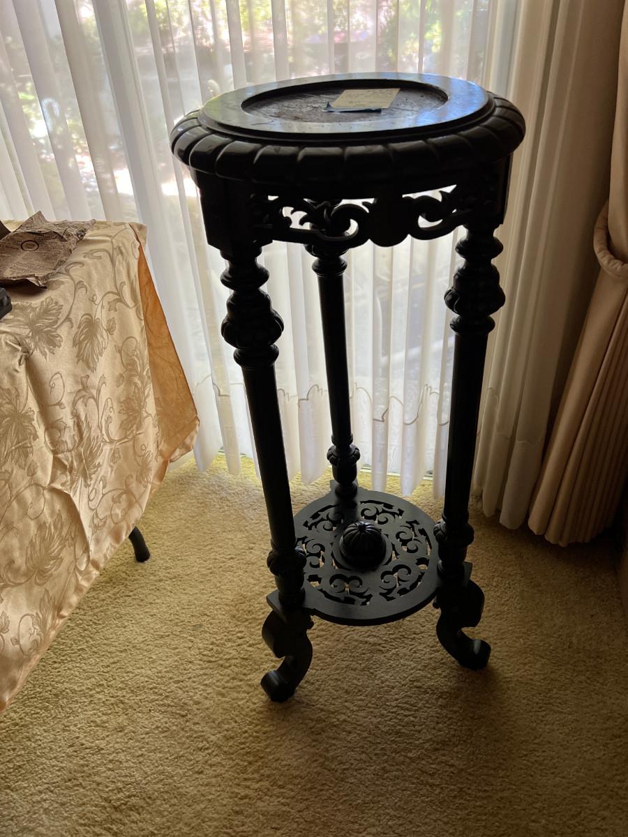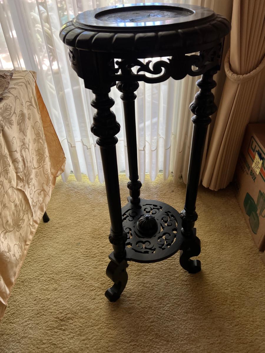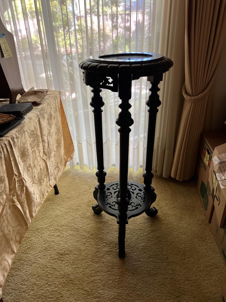 Dark wood with one top side panel missing , some wear, may be Rosewood. 15" across and 39" tall