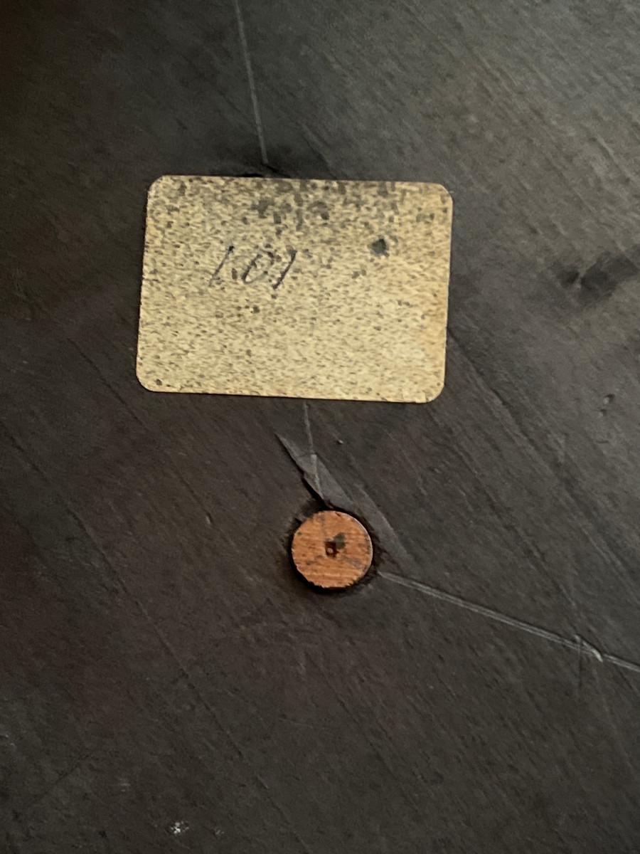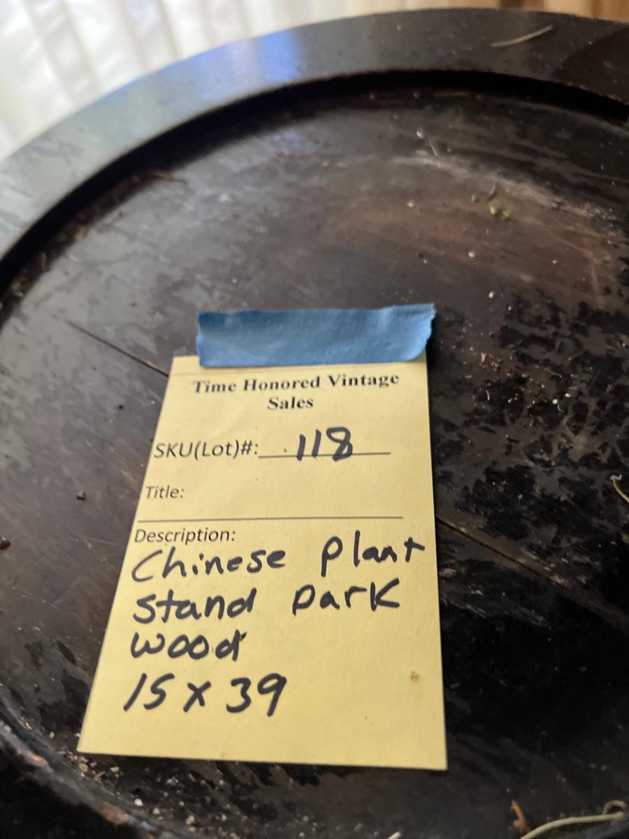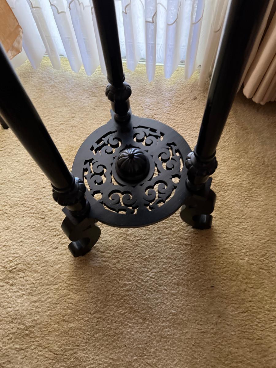 Dark wood with one top side panel missing , some wear, may be Rosewood. 15" across and 39" tall