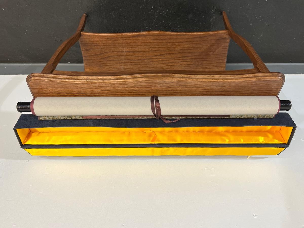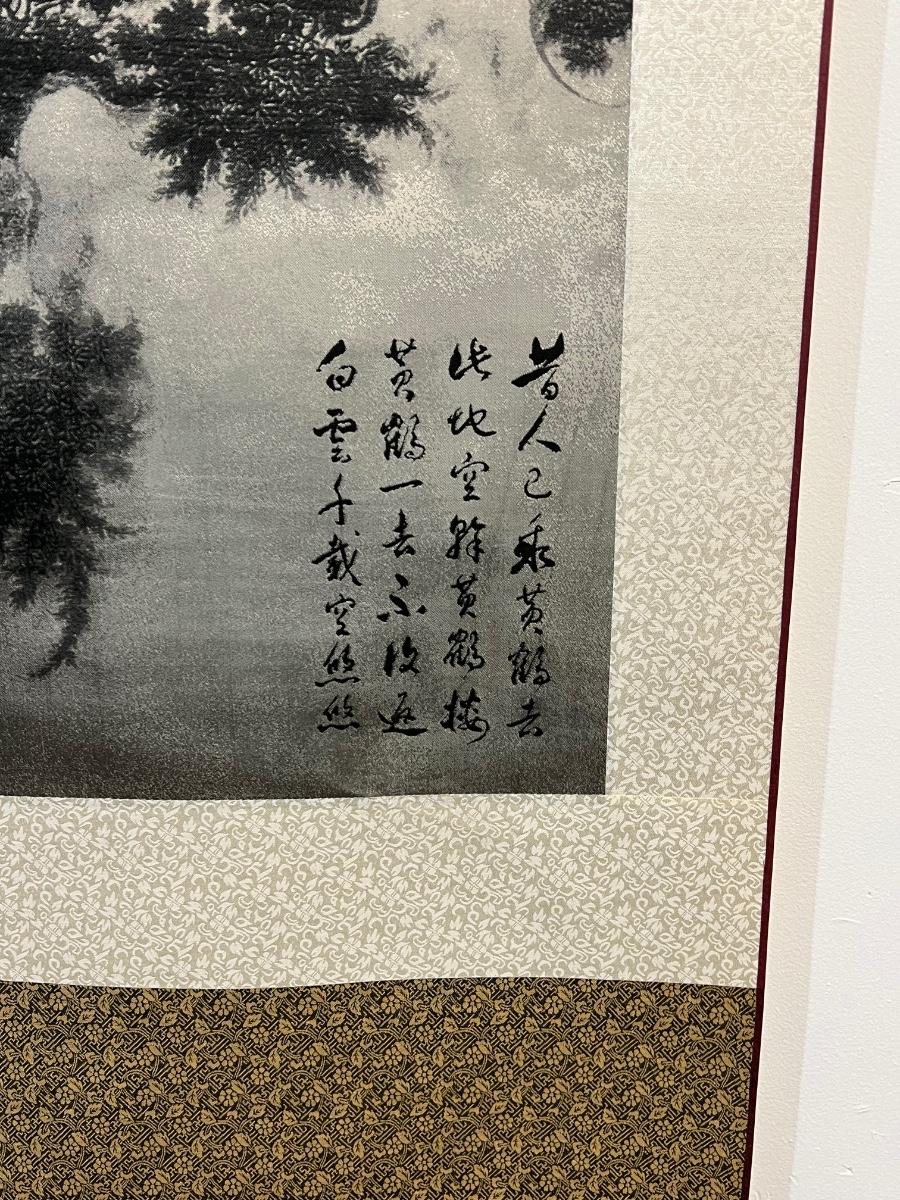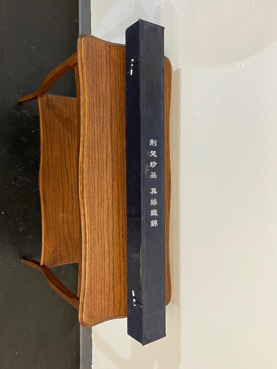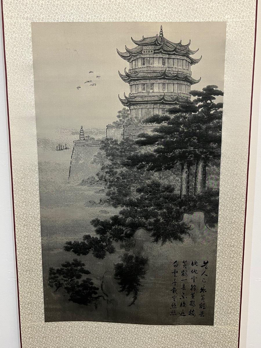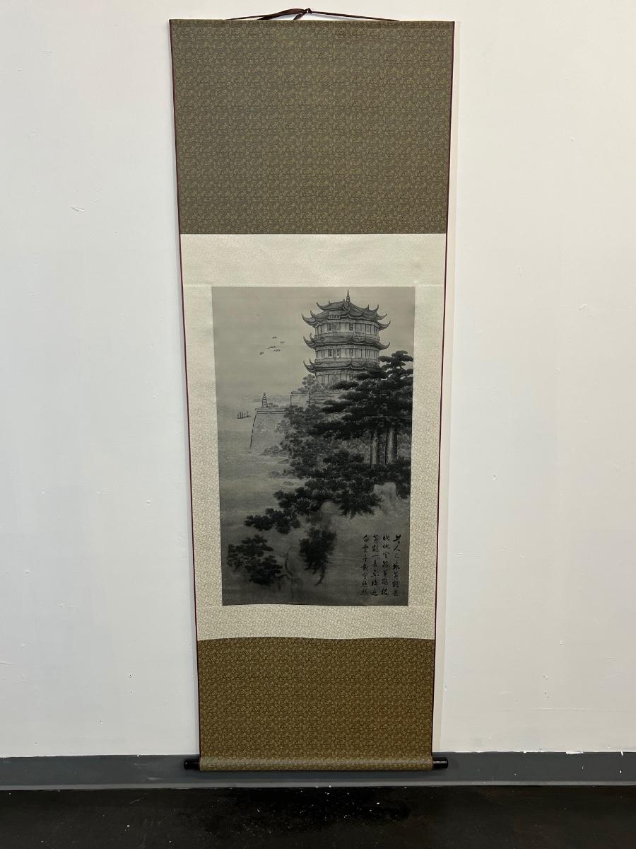 Chinese Tan & Blue Silk Scroll of Temple 26"x77"