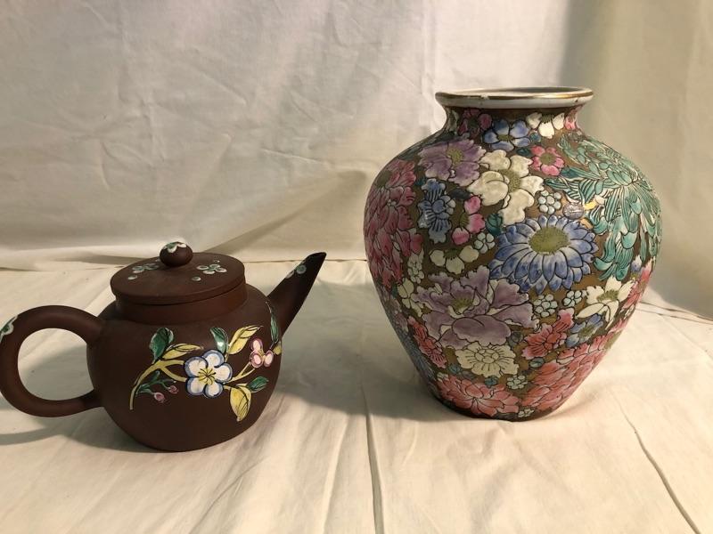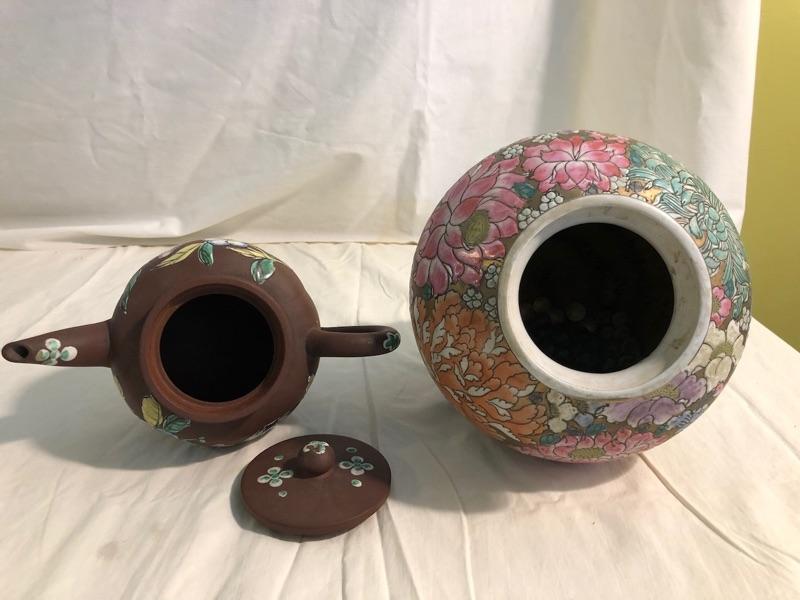ceramic Chinese teapot with floral decoration and floral design ceramic ginger jar 9in tall ginger jar and 4.5in tall teapot x 8.5 spout to handle
