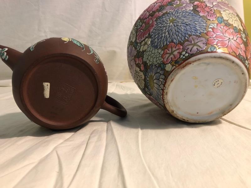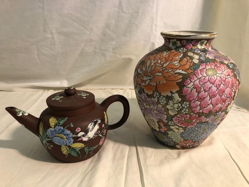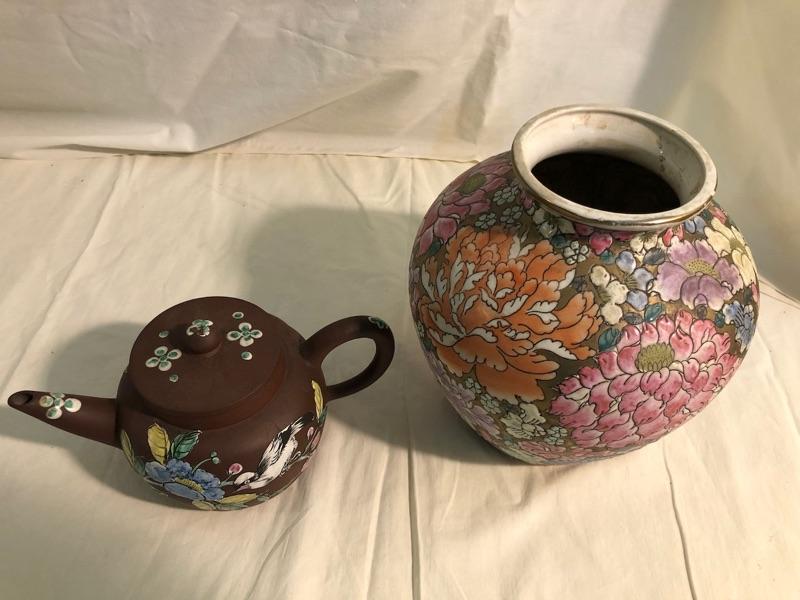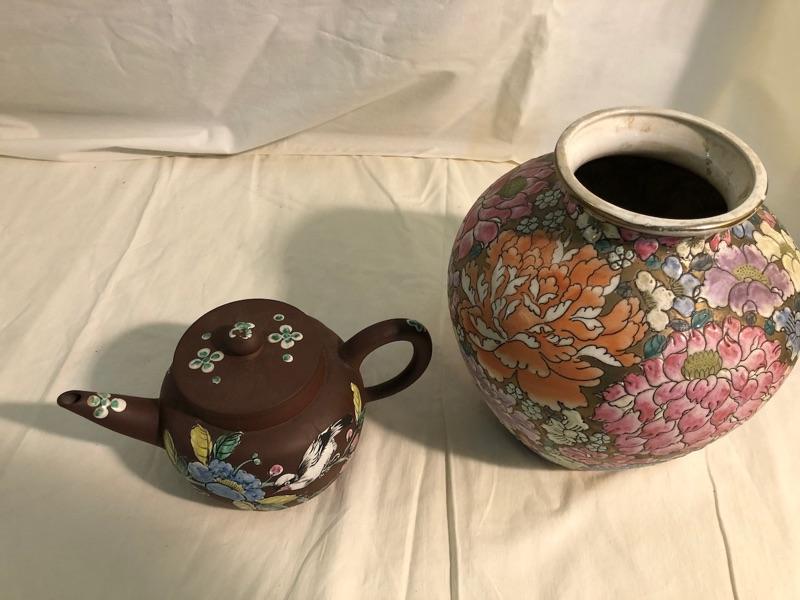 ceramic Chinese teapot with floral decoration and floral design ceramic ginger jar 9in tall ginger jar and 4.5in tall teapot x 8.5 spout to handle