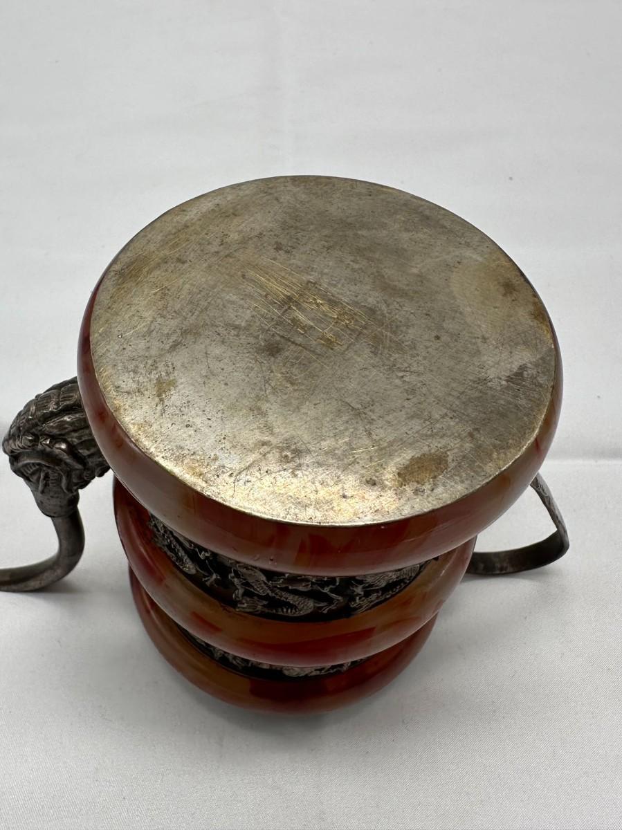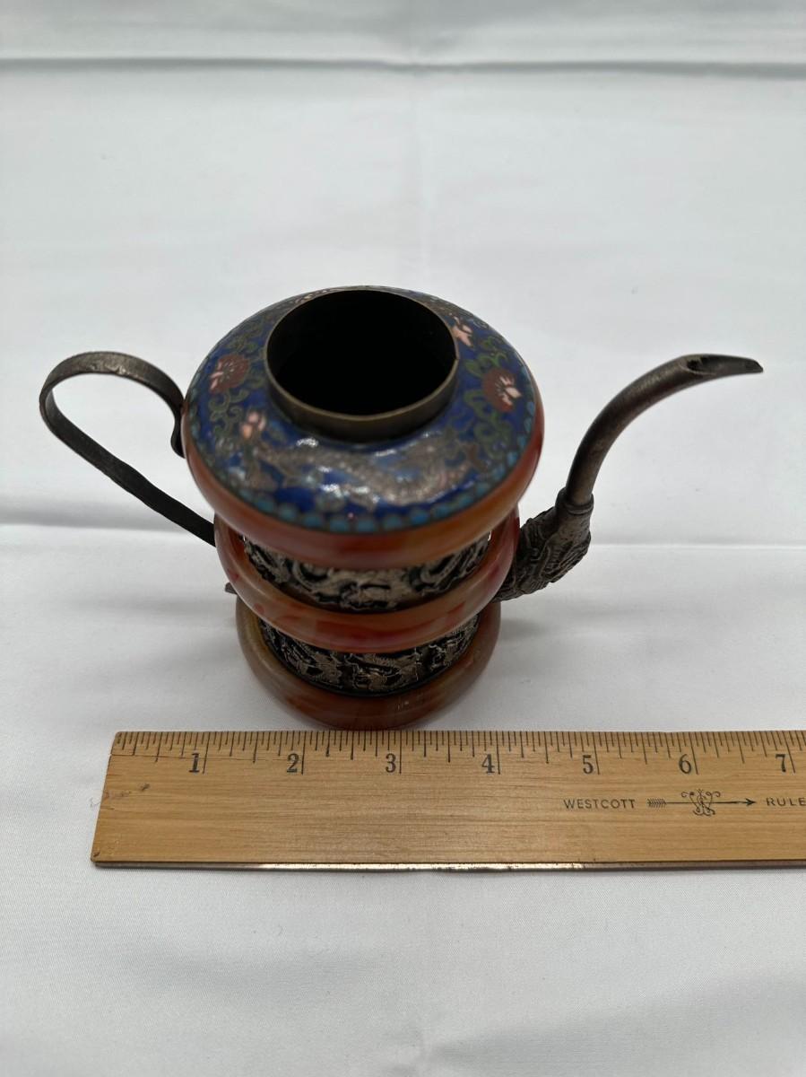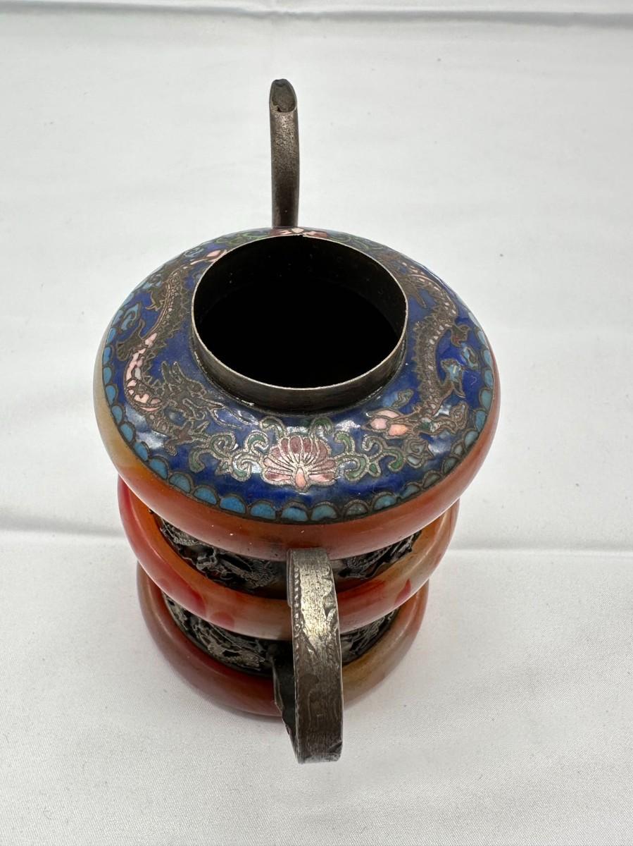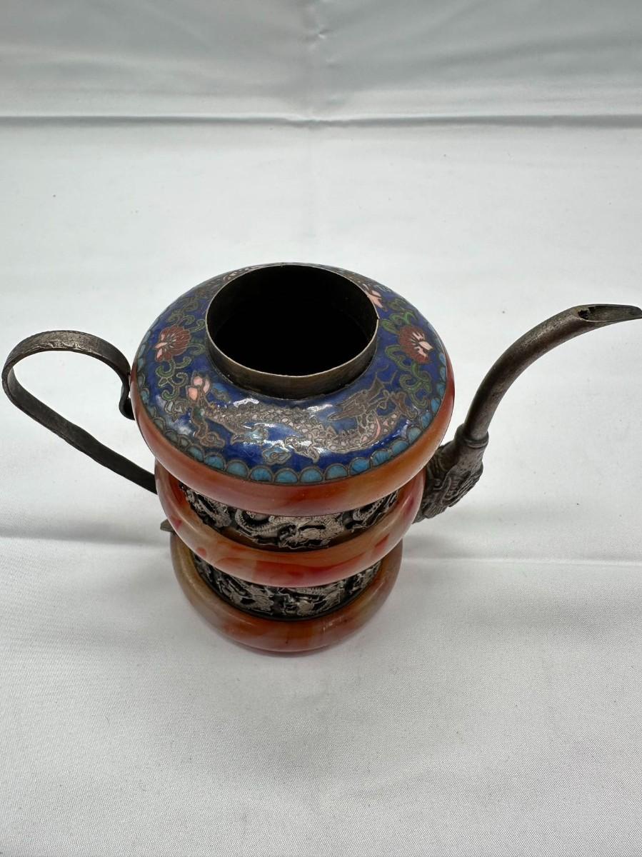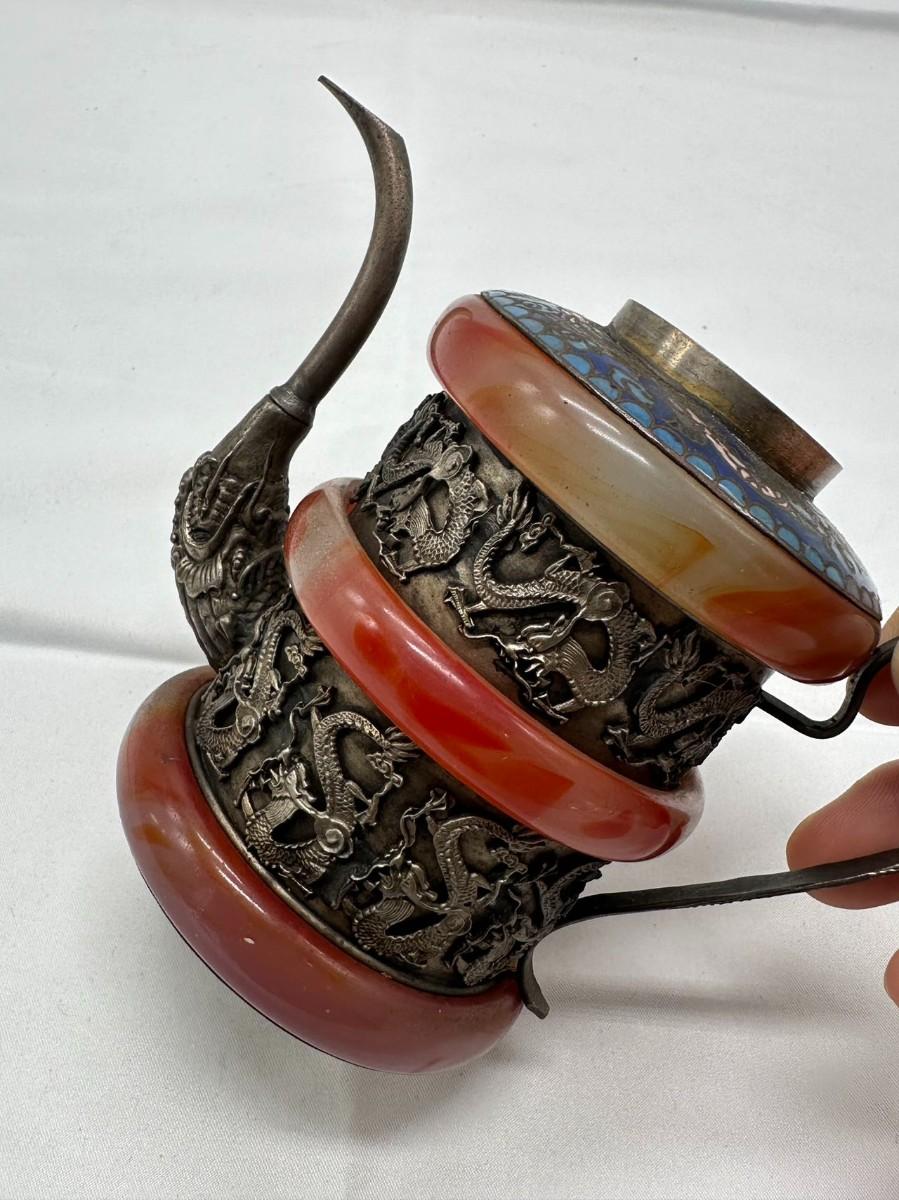 CHINESE TIBETAN SILVER CARVED JADE ENAMEL TEA POT