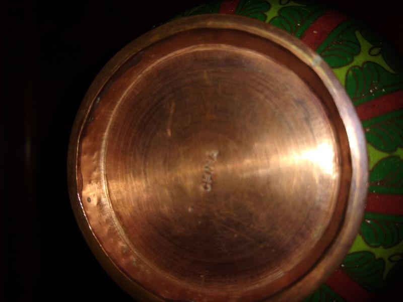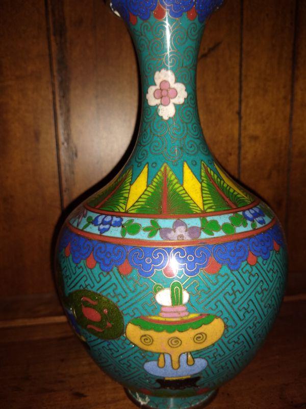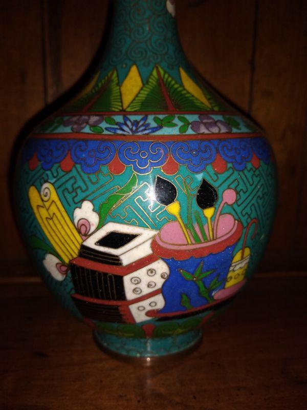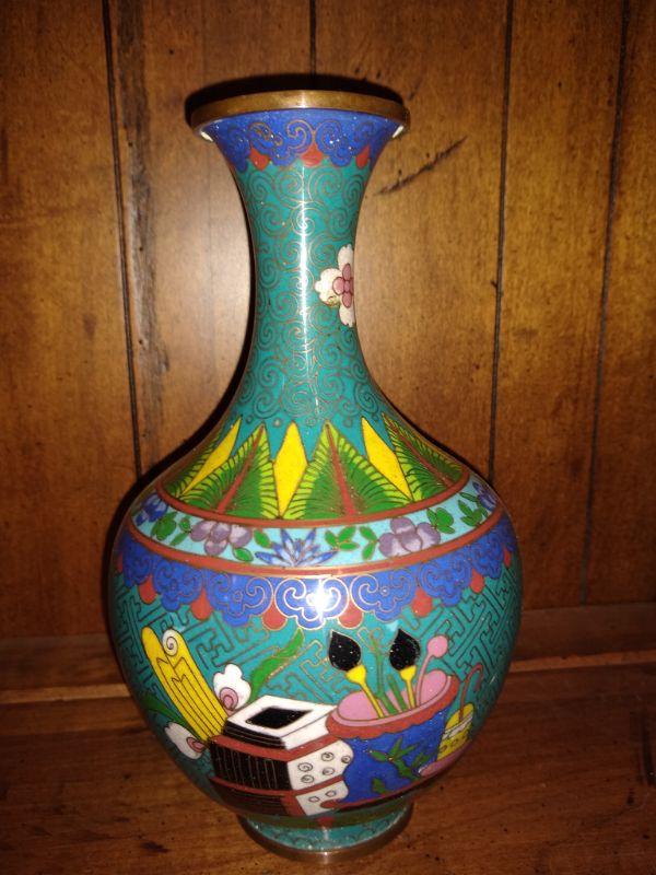 This vase has unique enamel decoration of artists tools and other items it is a narrow neck vase and it's marked China on the bottom brass. Excellent condition with no flaws or missing enamel. 9 in tall.
