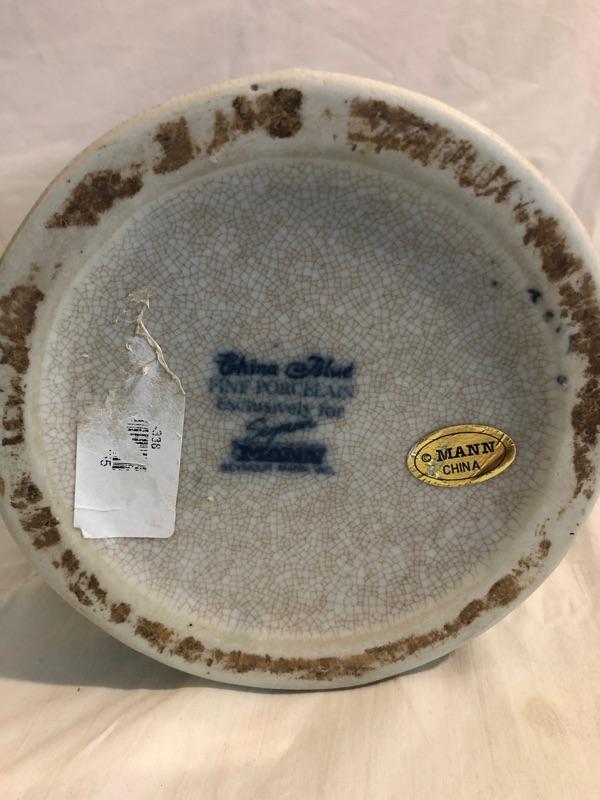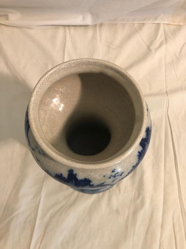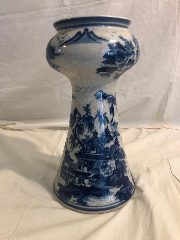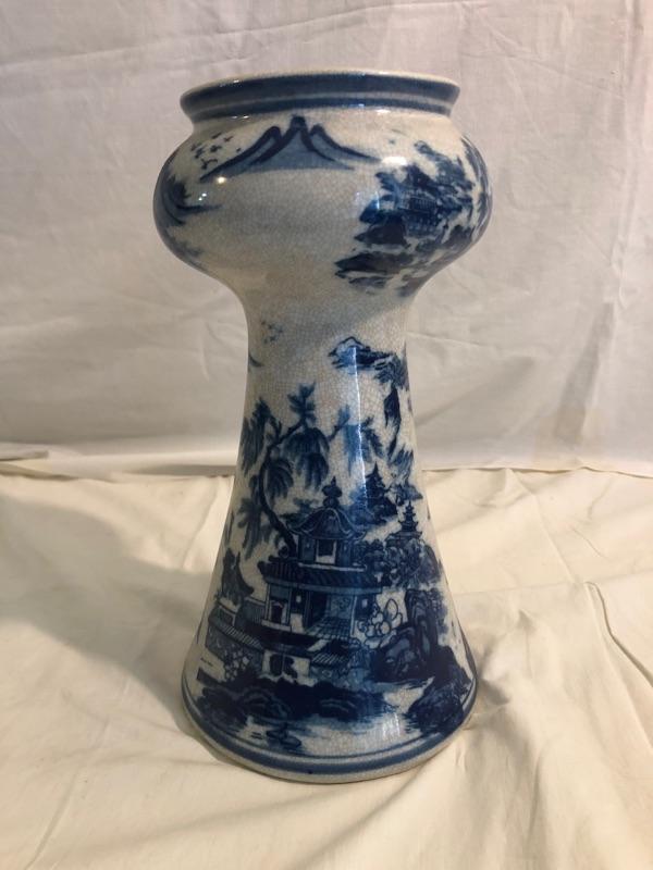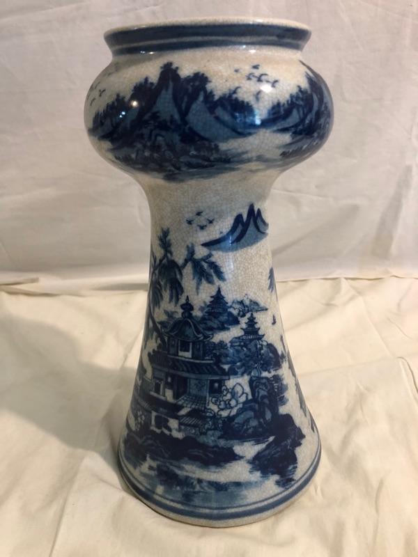 Classic Chinese style ceramic vase in blue and white with pagoda scenes 12 inches tall with 4in diameter opening Seymour Mann Chinese porcelain