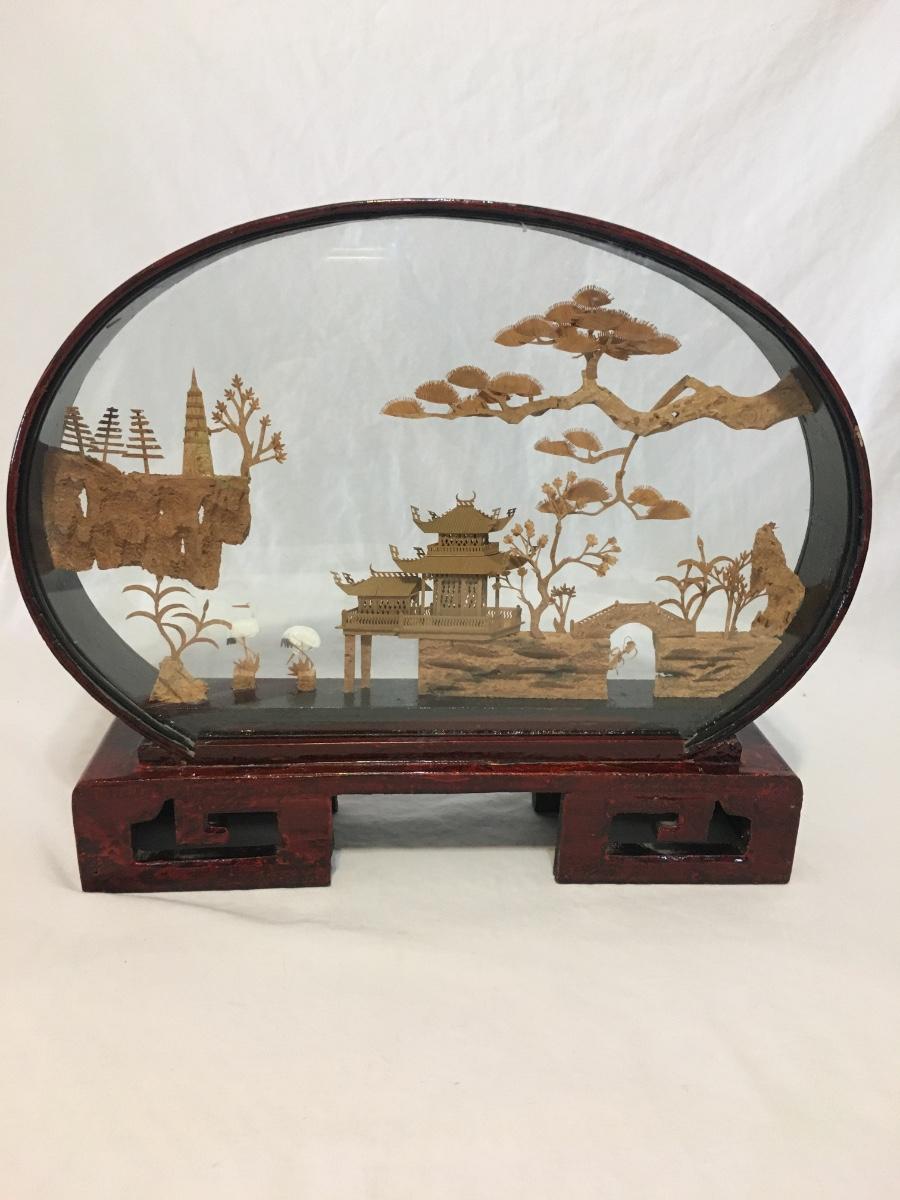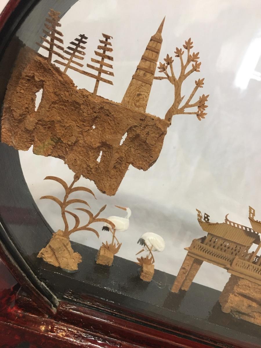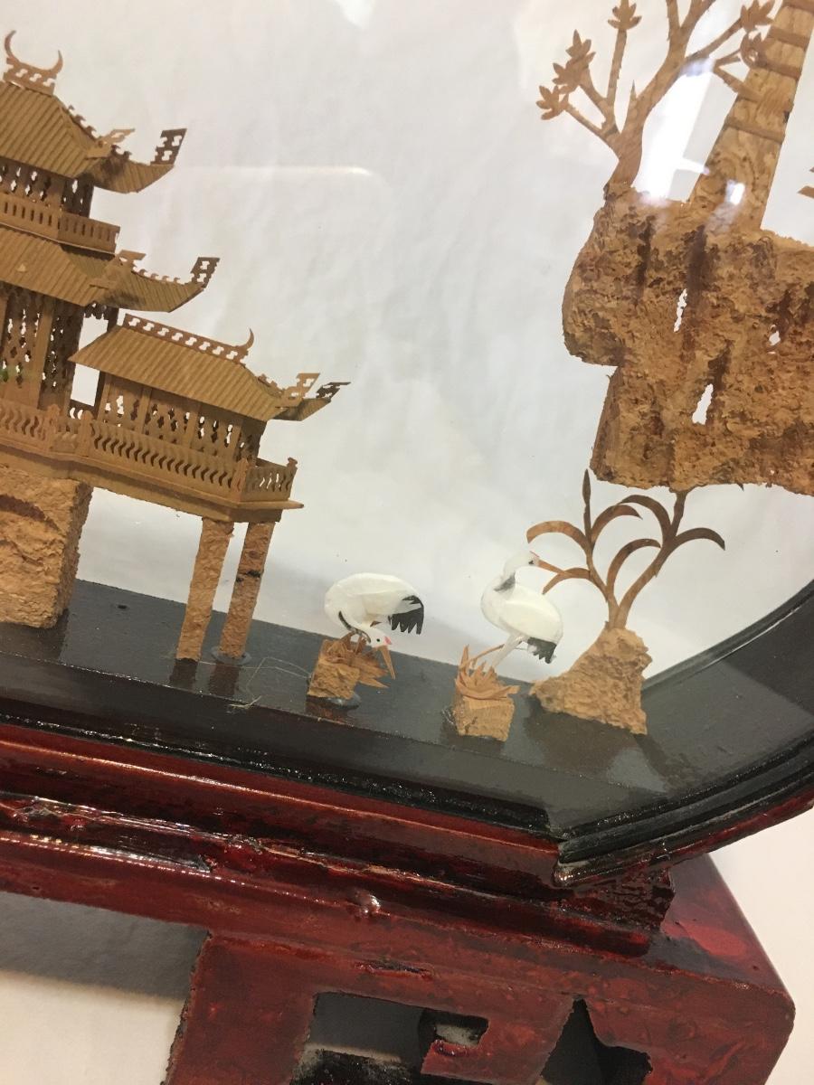Chinese Vintage Cork Art In Lacker Glass Display pagoda with birds