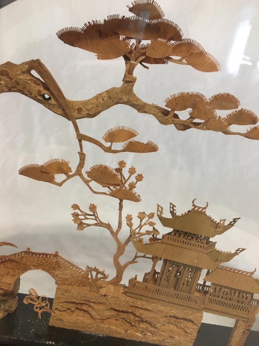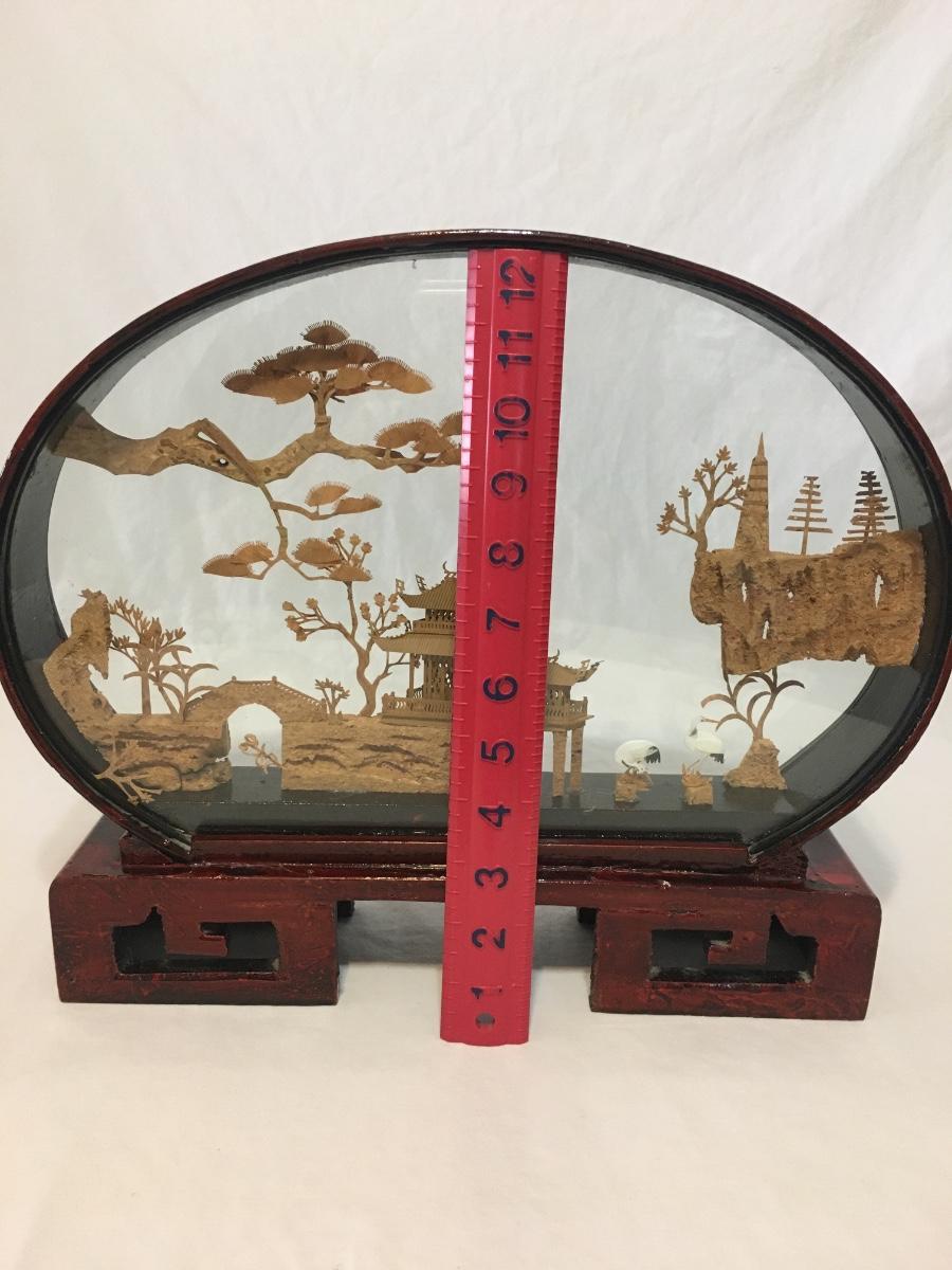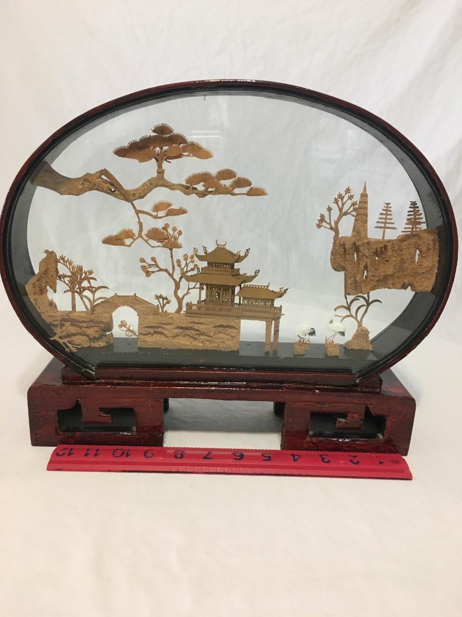 Chinese Vintage Cork Art In Lacker Glass Display pagoda with birds