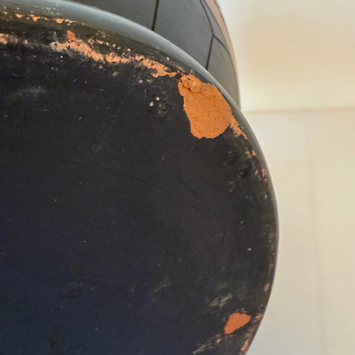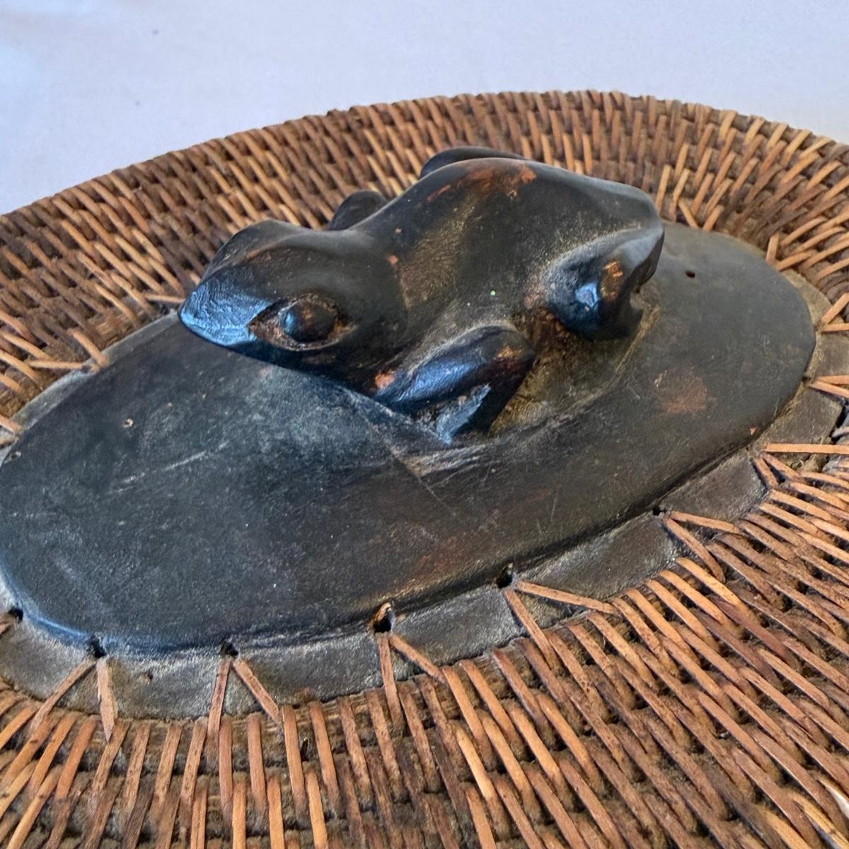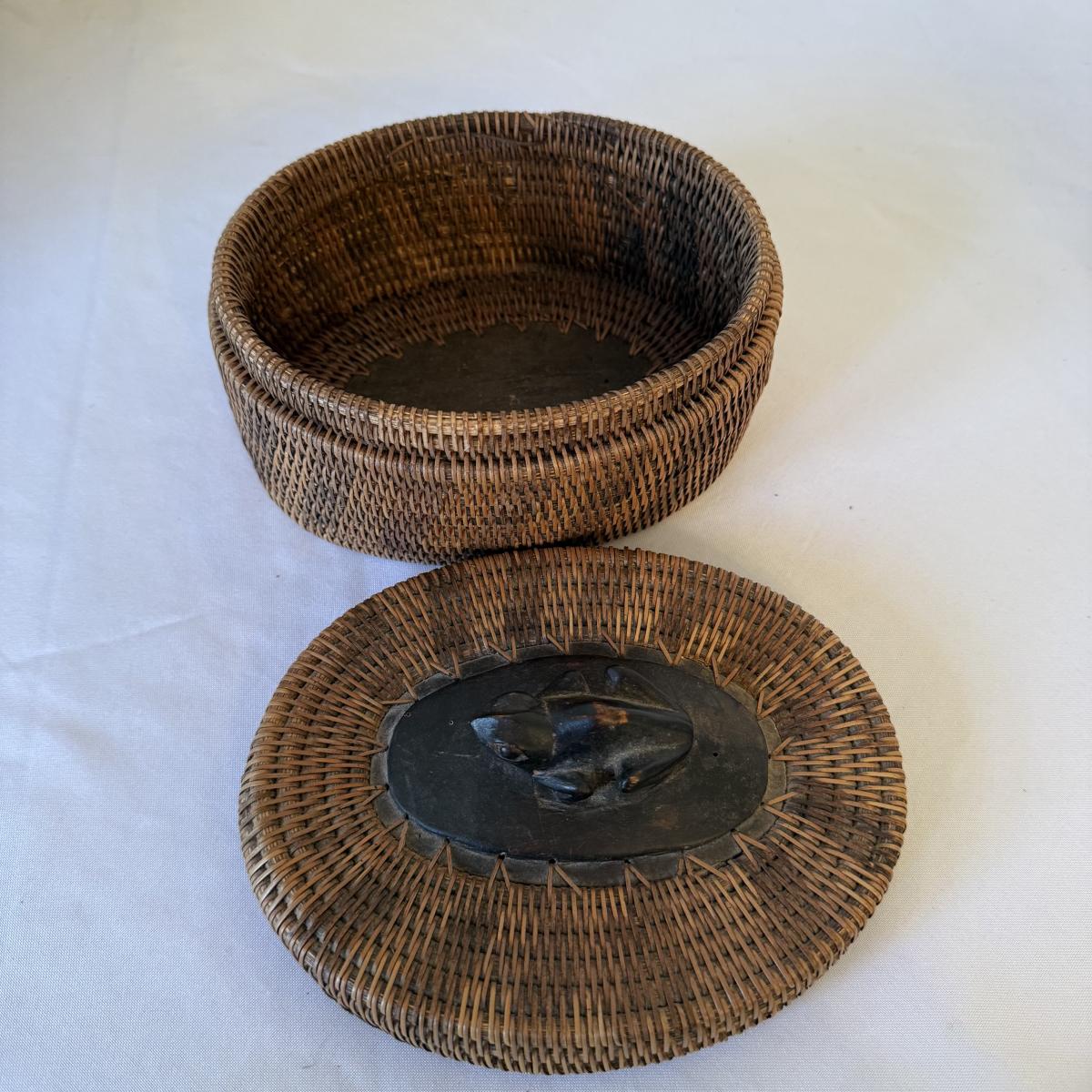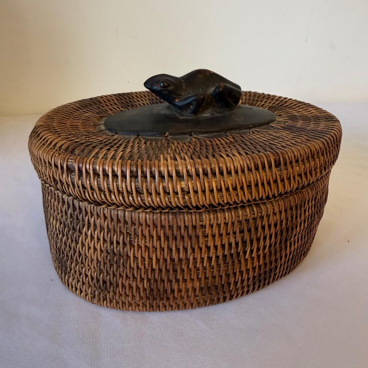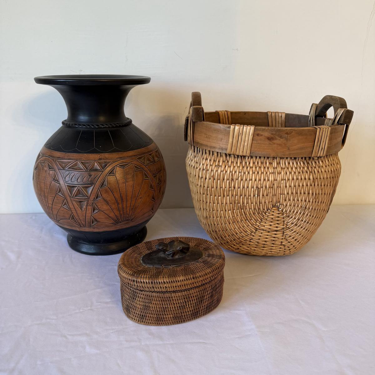 The large basket with wooden rim and handles is in the style of a Chinese woven willow basket. It measures approximately 12”D x 13”H. The small lidded basket is in the style of an Indonesian reed basket. It has a carved wooden frog on the lid and wood on the base of the basket. The large urn has a “Made in Indonesia” sticker. It is ceramic and measures approximately 11”D x 14.5”H.