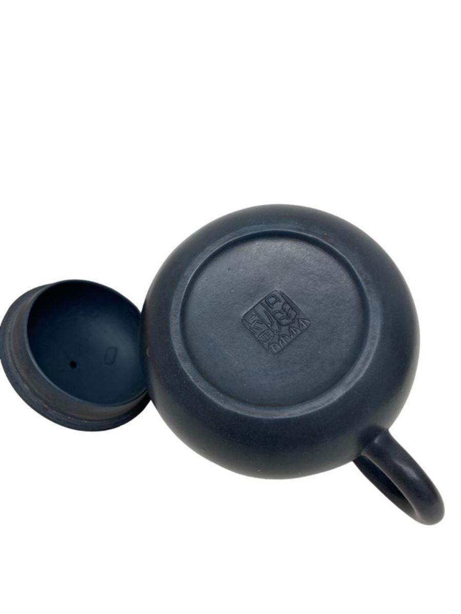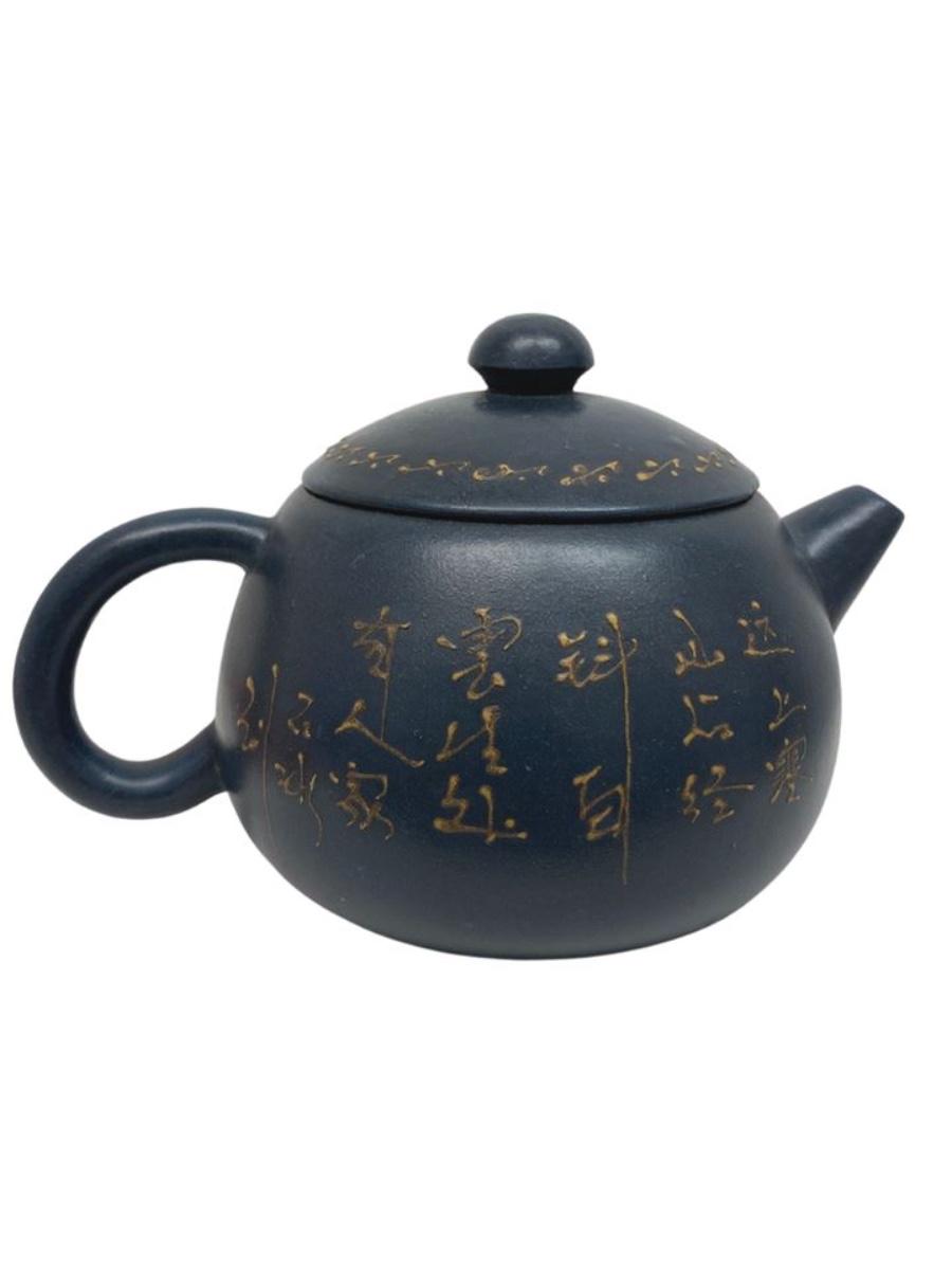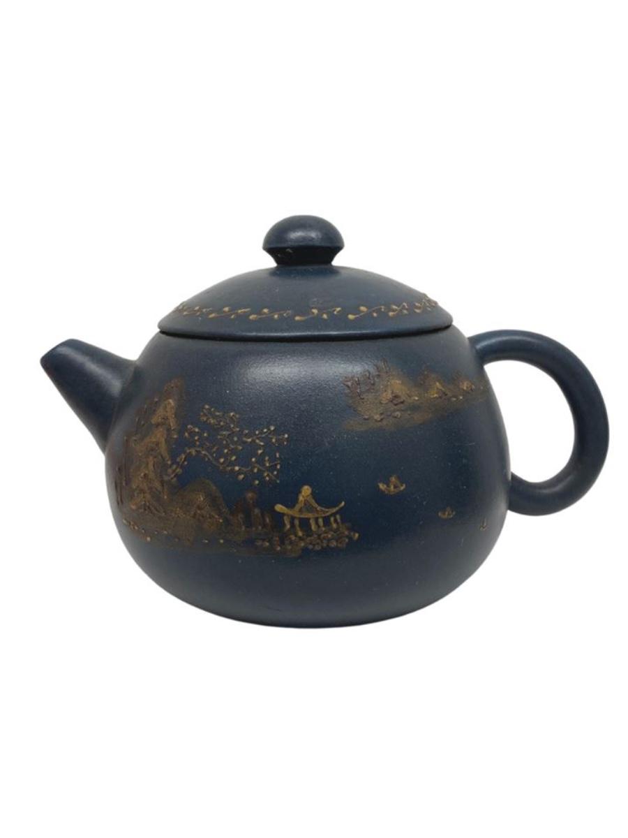 Likely Yixing. Hand painted. One side calligraphic, other scenic. Has stamp seal on bottom and in lid. Measures approx. 6"W x 4"H x 4"D.