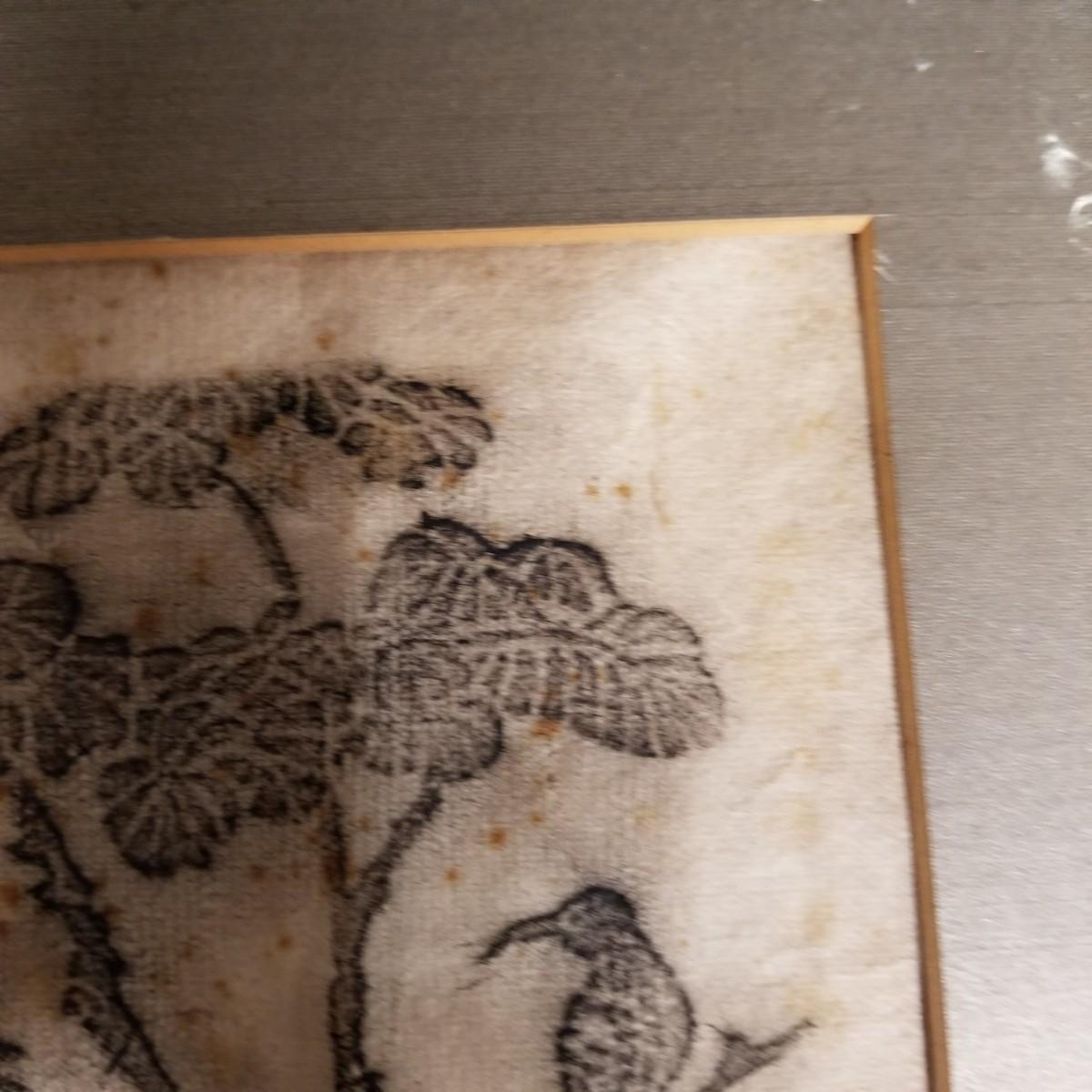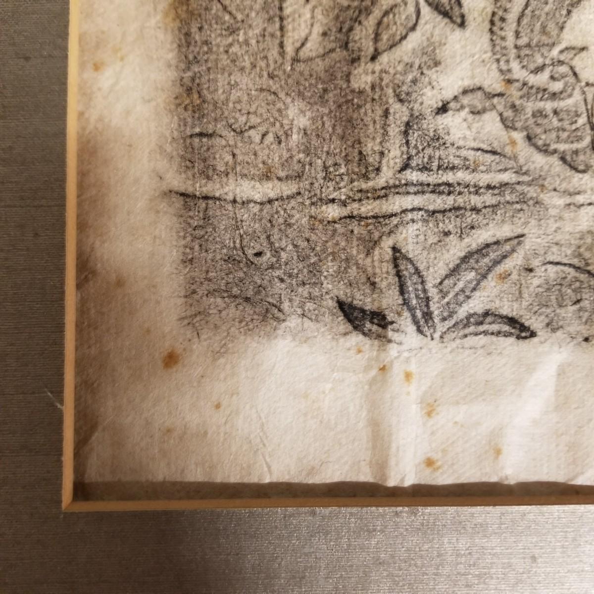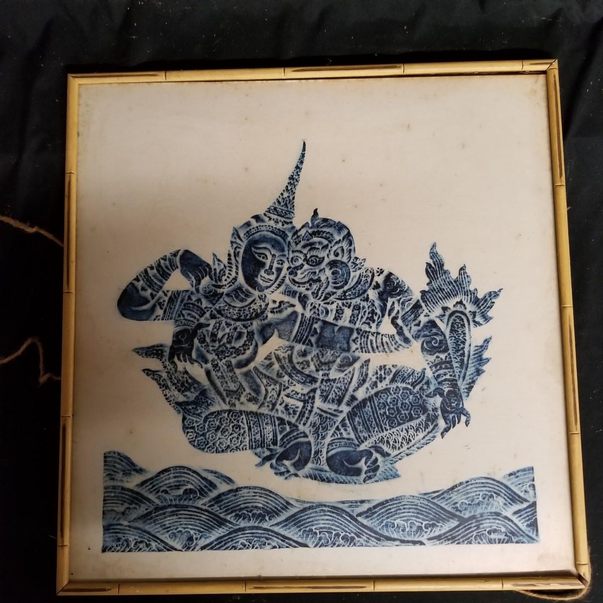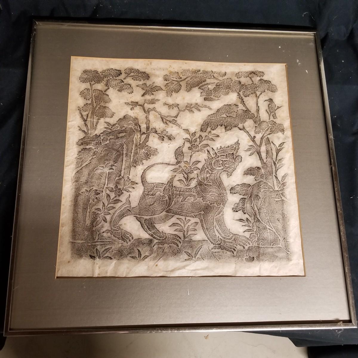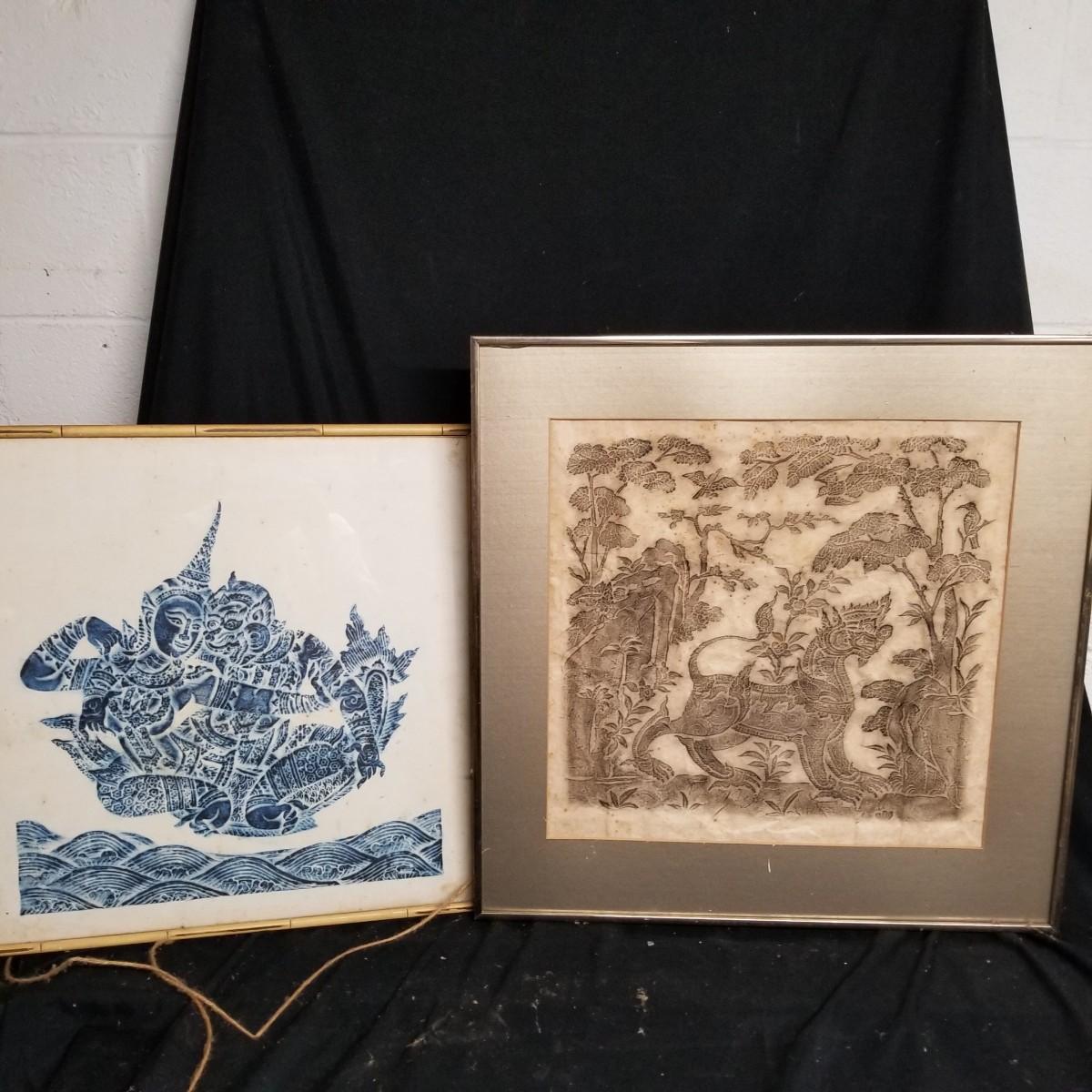 Two pieces artwork.  Chinese themed piece is 24 1/2" sq, has metal frame but no glass.  May be rubbing or print on rice paper.  Other piece is 20 1/2" x 21", simulated bamboo frame in need of tlc. Thai/Siam temple rubbing, may be on rice paper.  Both pieces have background discoloration.  See photos.  Shipping available.  Shipping Art can be costly please call UPS store at 828-252-6930 for quote.