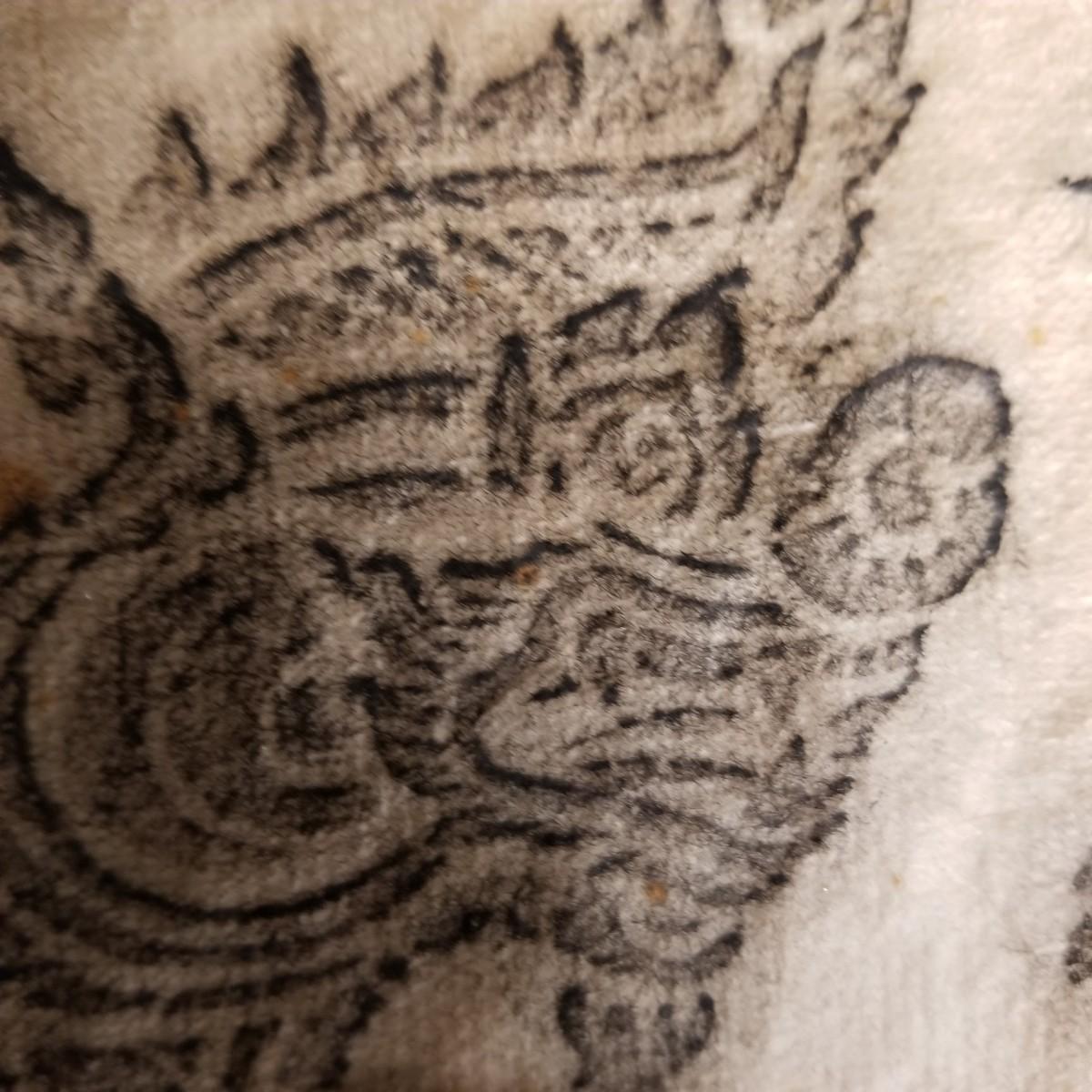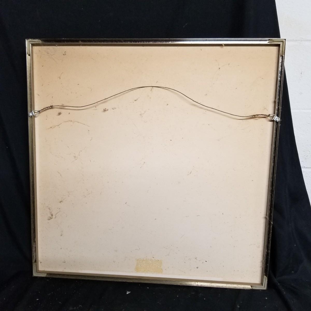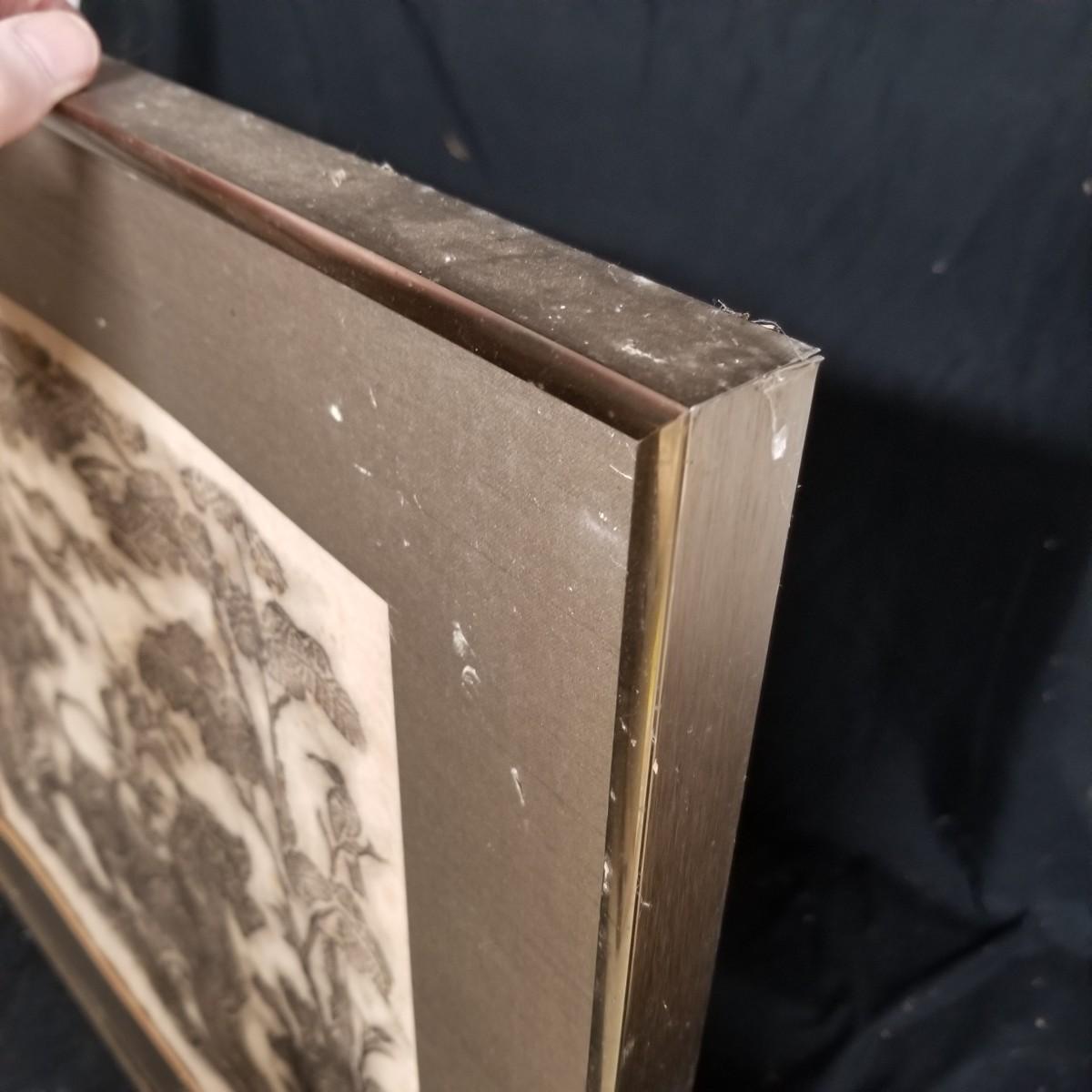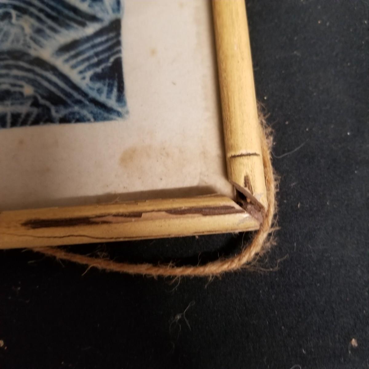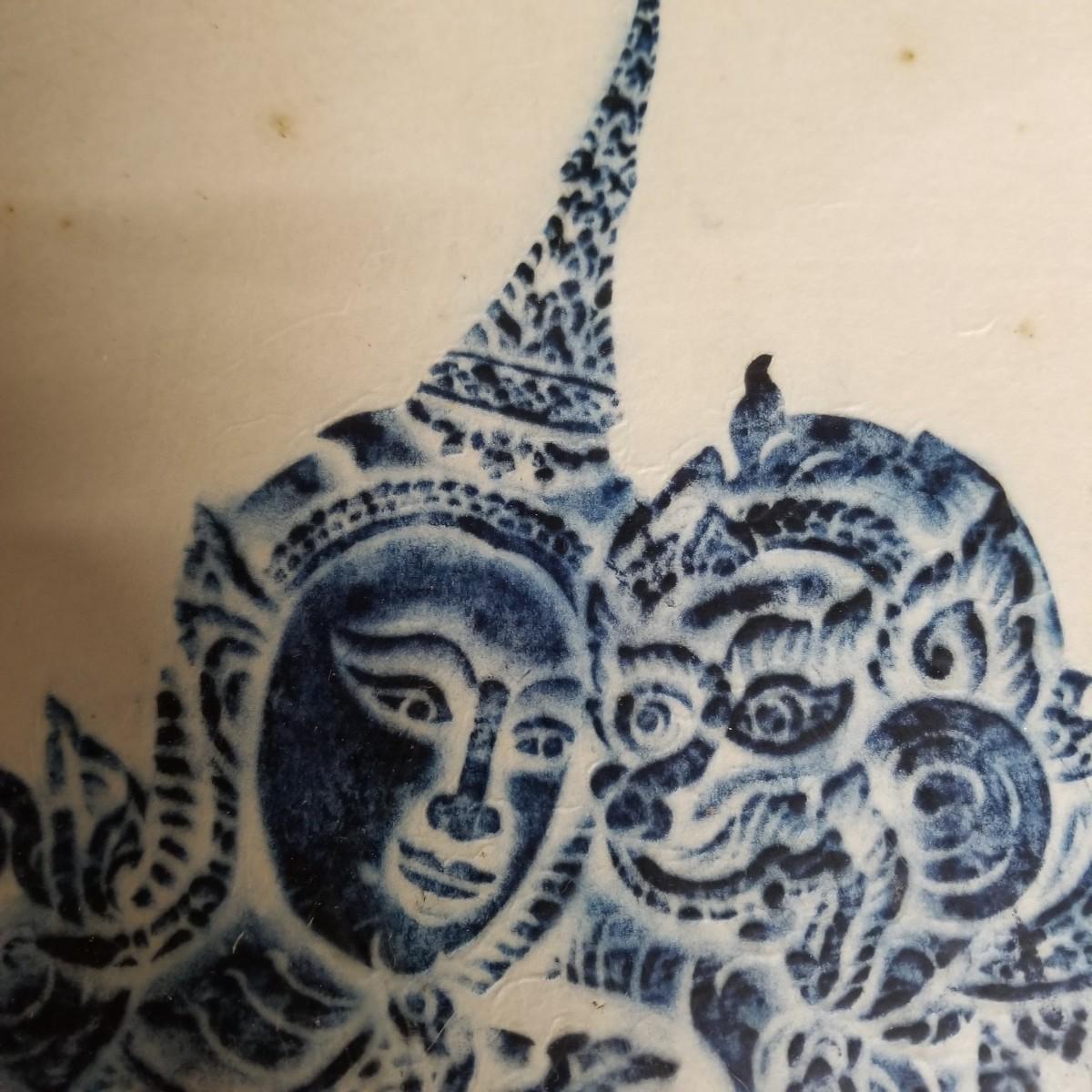 Two pieces artwork.  Chinese themed piece is 24 1/2" sq, has metal frame but no glass.  May be rubbing or print on rice paper.  Other piece is 20 1/2" x 21", simulated bamboo frame in need of tlc. Thai/Siam temple rubbing, may be on rice paper.  Both pieces have background discoloration.  See photos.  Shipping available.  Shipping Art can be costly please call UPS store at 828-252-6930 for quote.