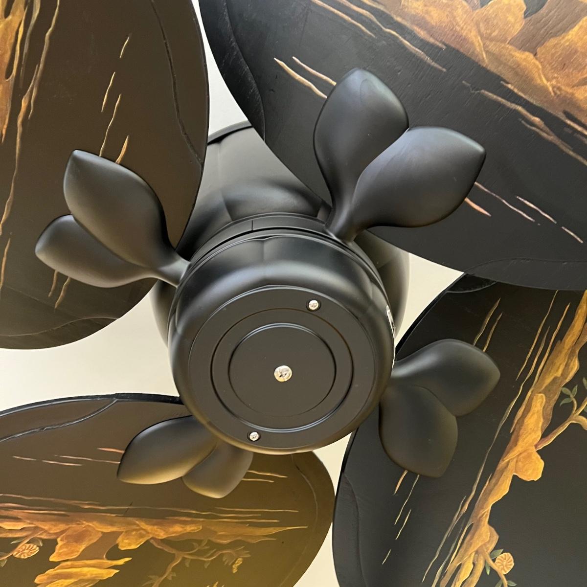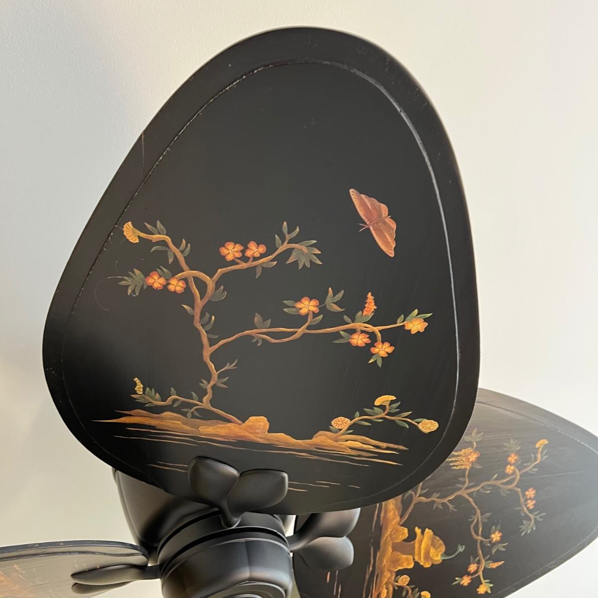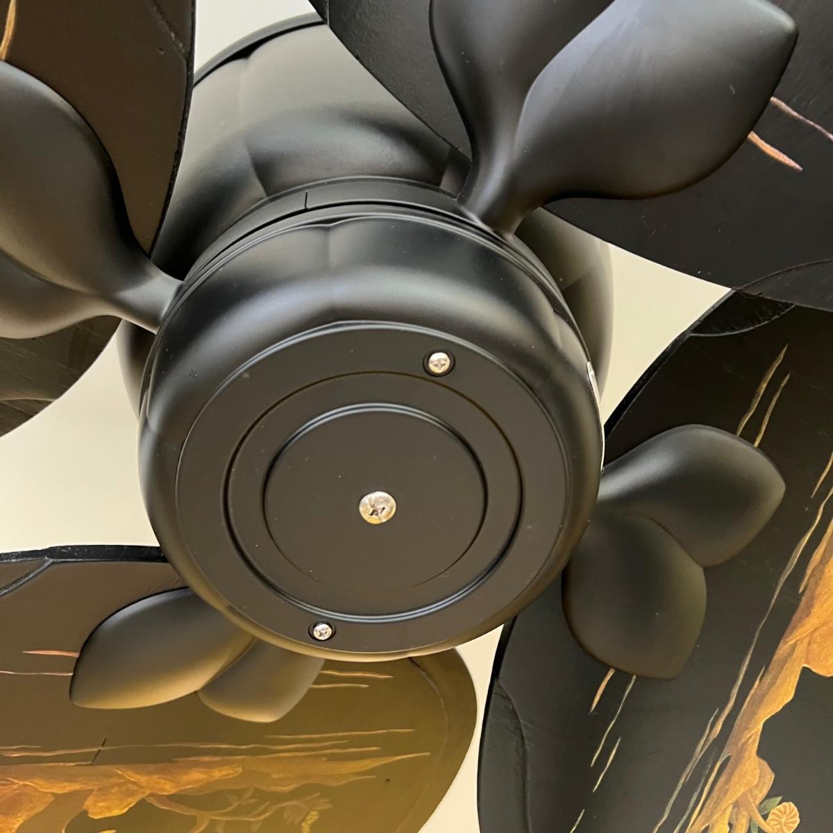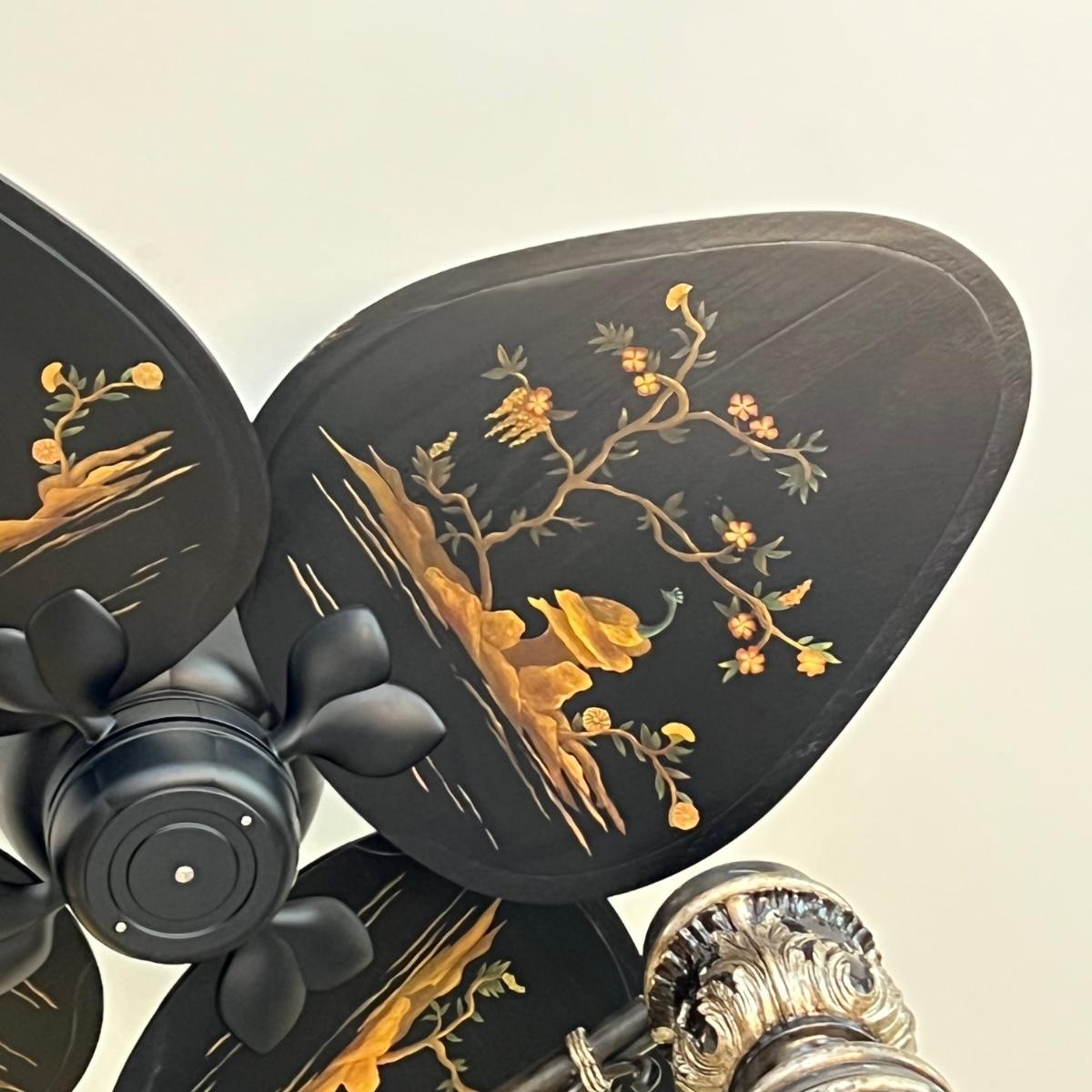 Wooden four blade Chinese-esque painted ceiling fan. The fan drops 17 inches from the ceiling and is a total of 52” in diameter.