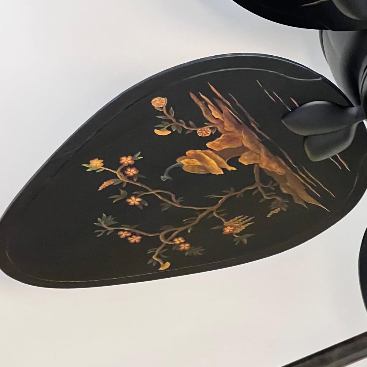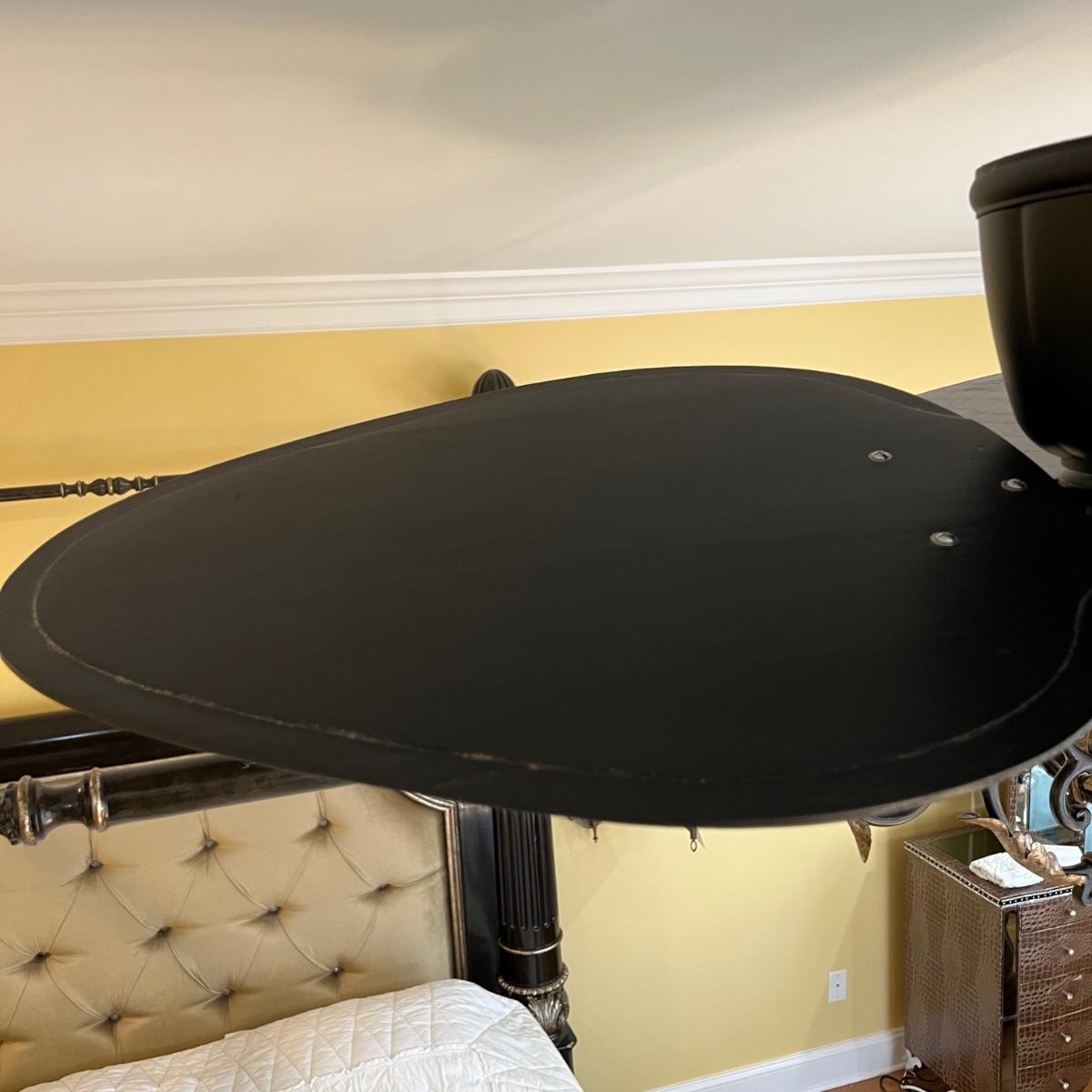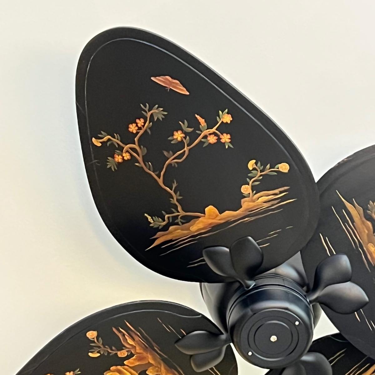Wooden four blade Chinese-esque painted ceiling fan. The fan drops 17 inches from the ceiling and is a total of 52” in diameter.