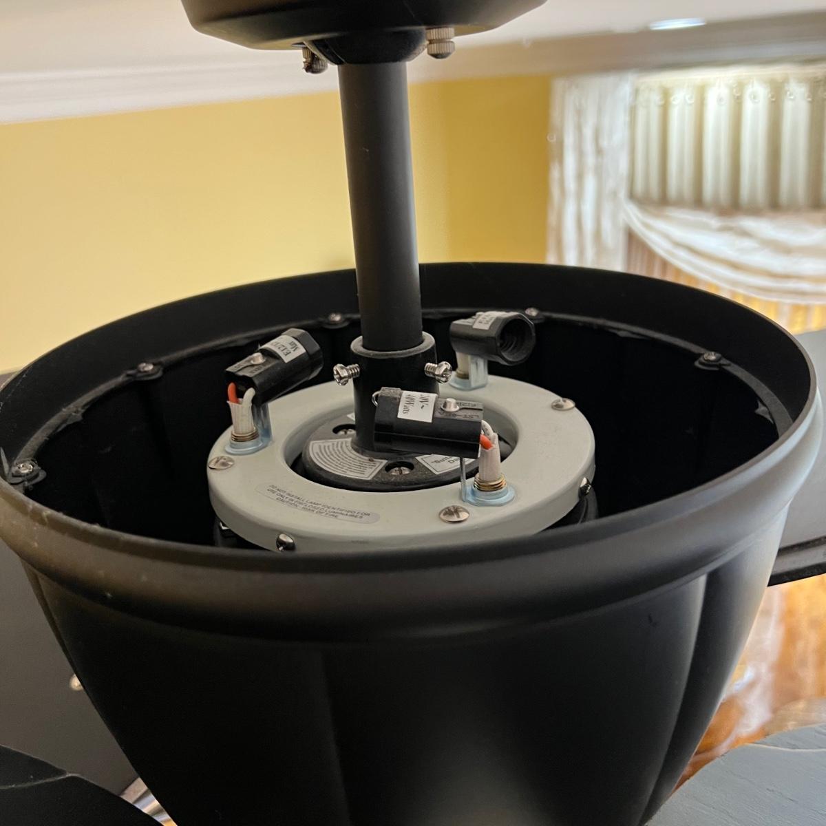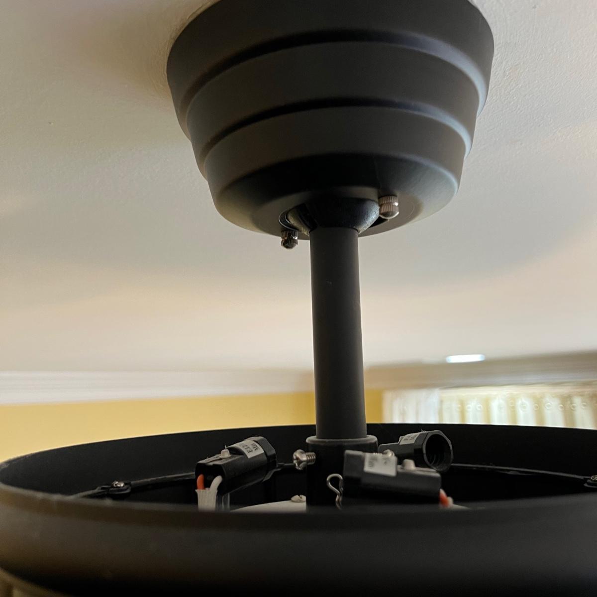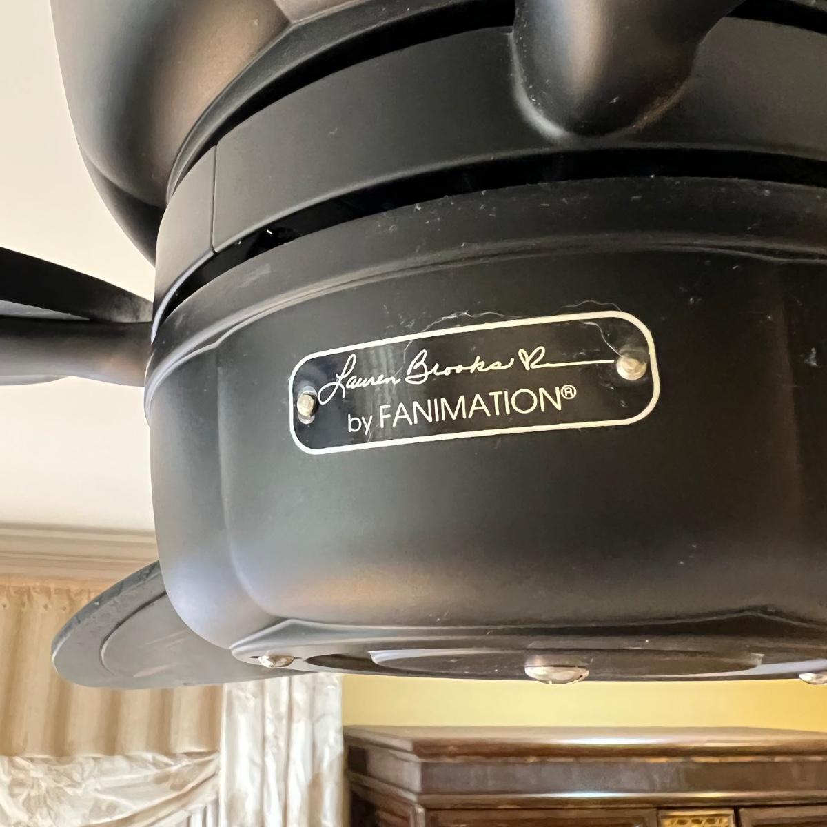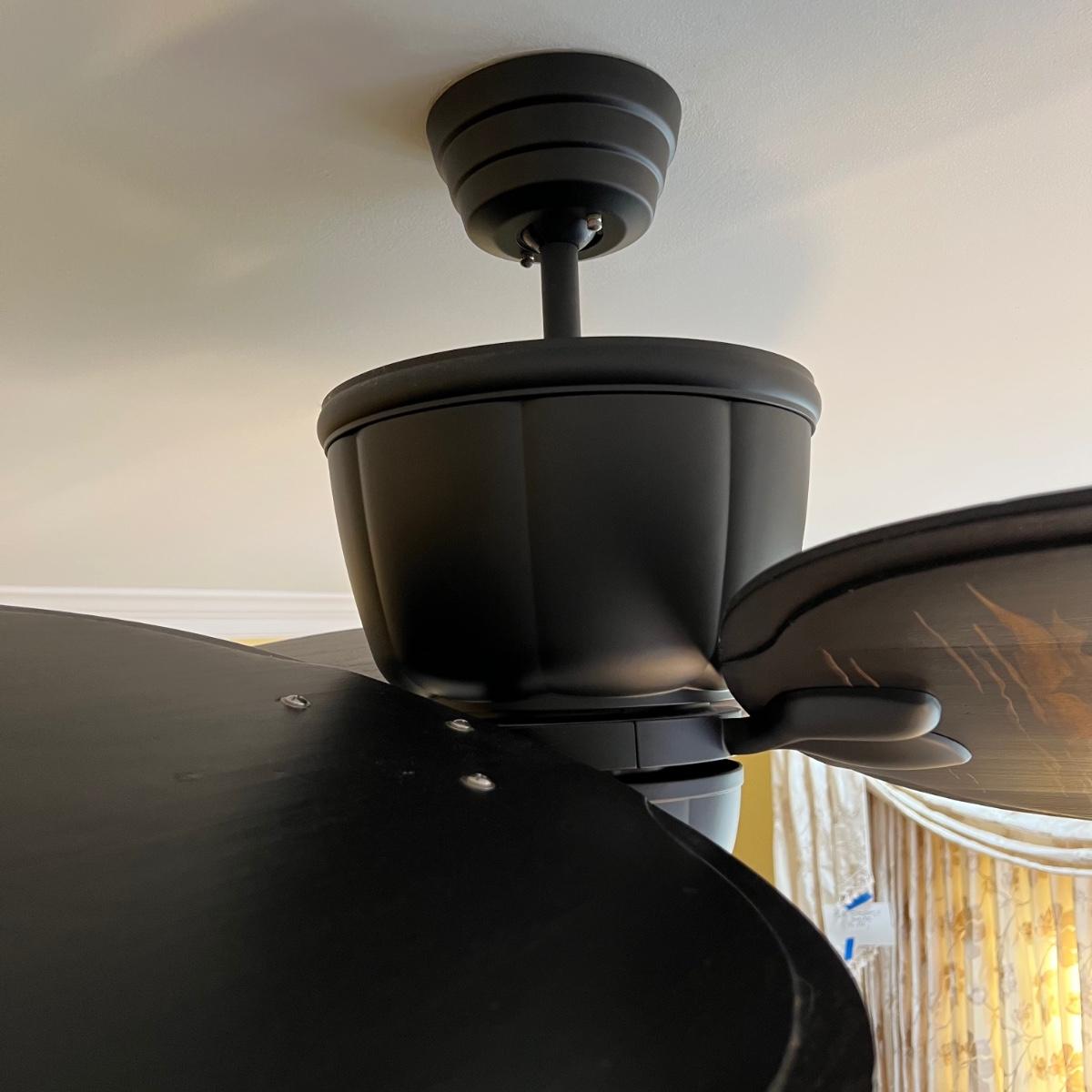 Wooden four blade Chinese-esque painted ceiling fan. The fan drops 17 inches from the ceiling and is a total of 52” in diameter.