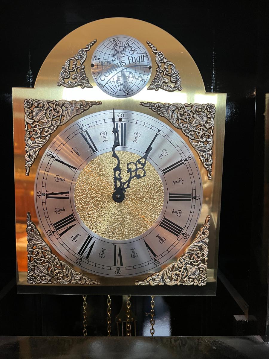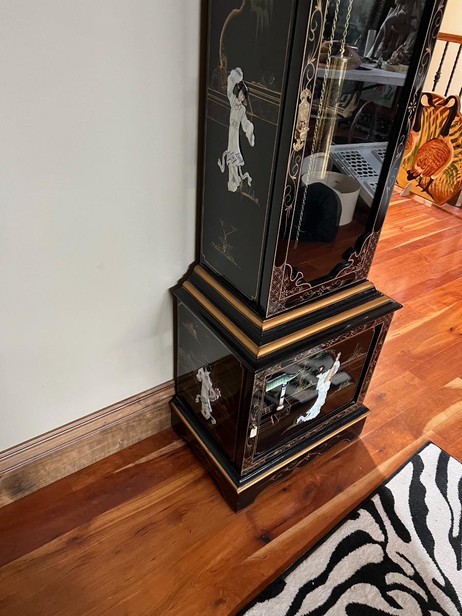 Clock is in working condition, keeps accurate time, black lacquer finish with gold trim and mother of pearl appliques. Measures: 85" tall 20" wide and 14" deep.