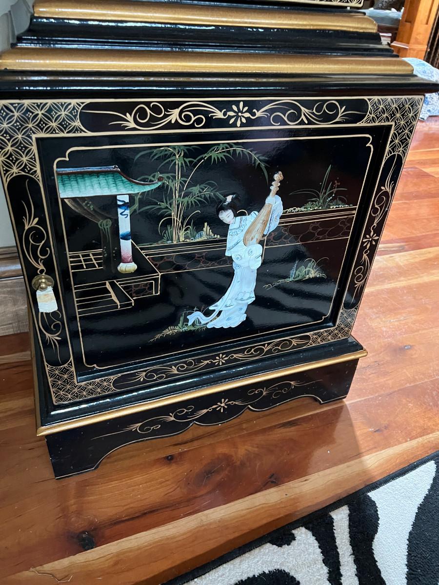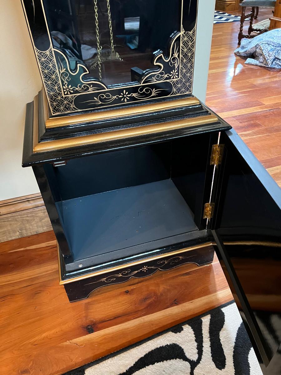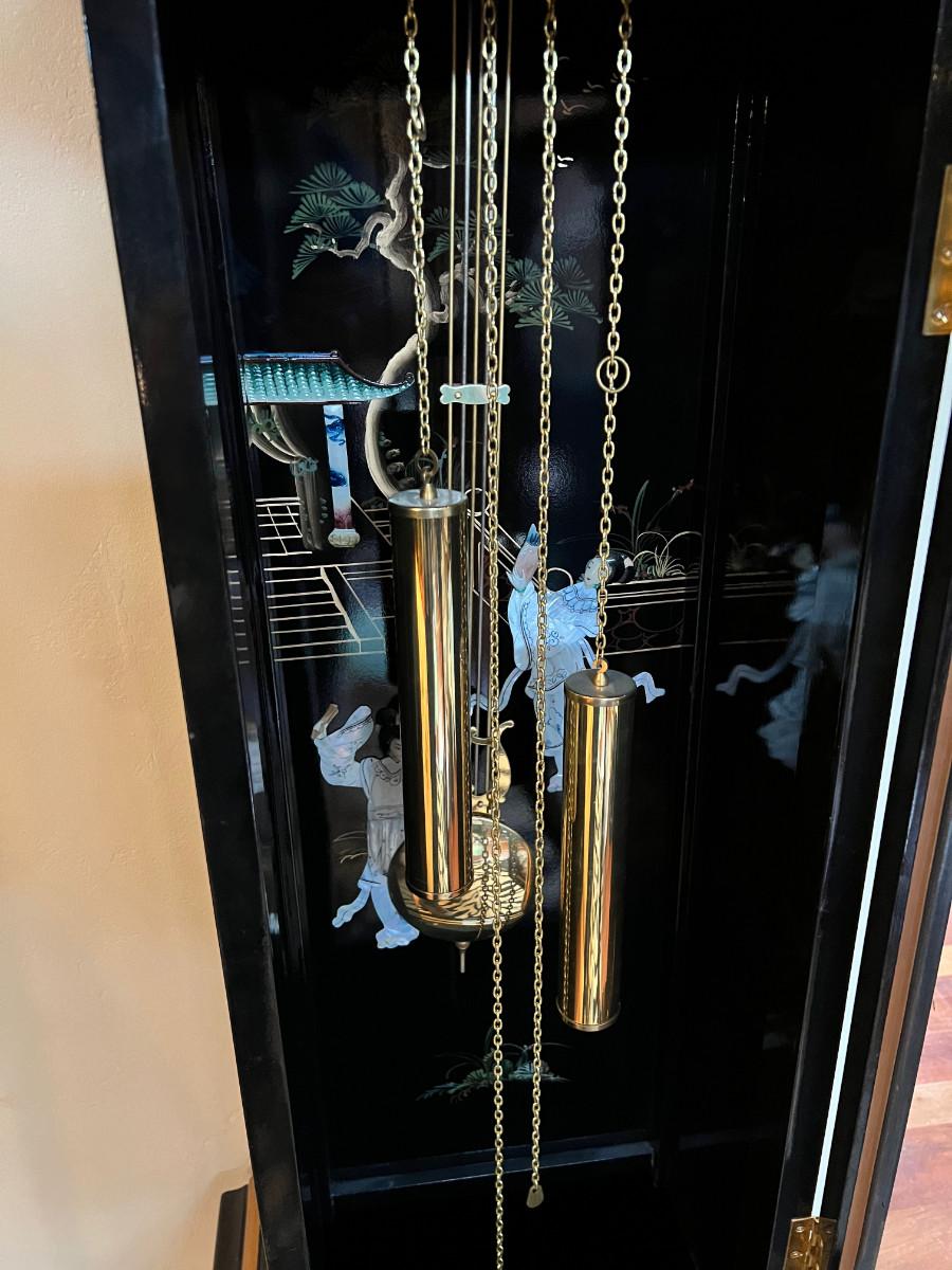 Clock is in working condition, keeps accurate time, black lacquer finish with gold trim and mother of pearl appliques. Measures: 85" tall 20" wide and 14" deep.