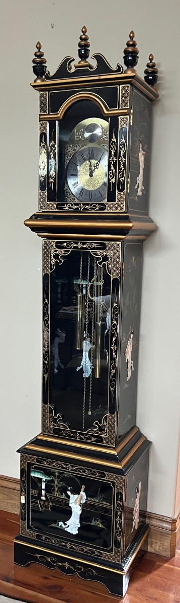 Chinoiserie Grandfather Clock Mother of Pearl Black Laquer