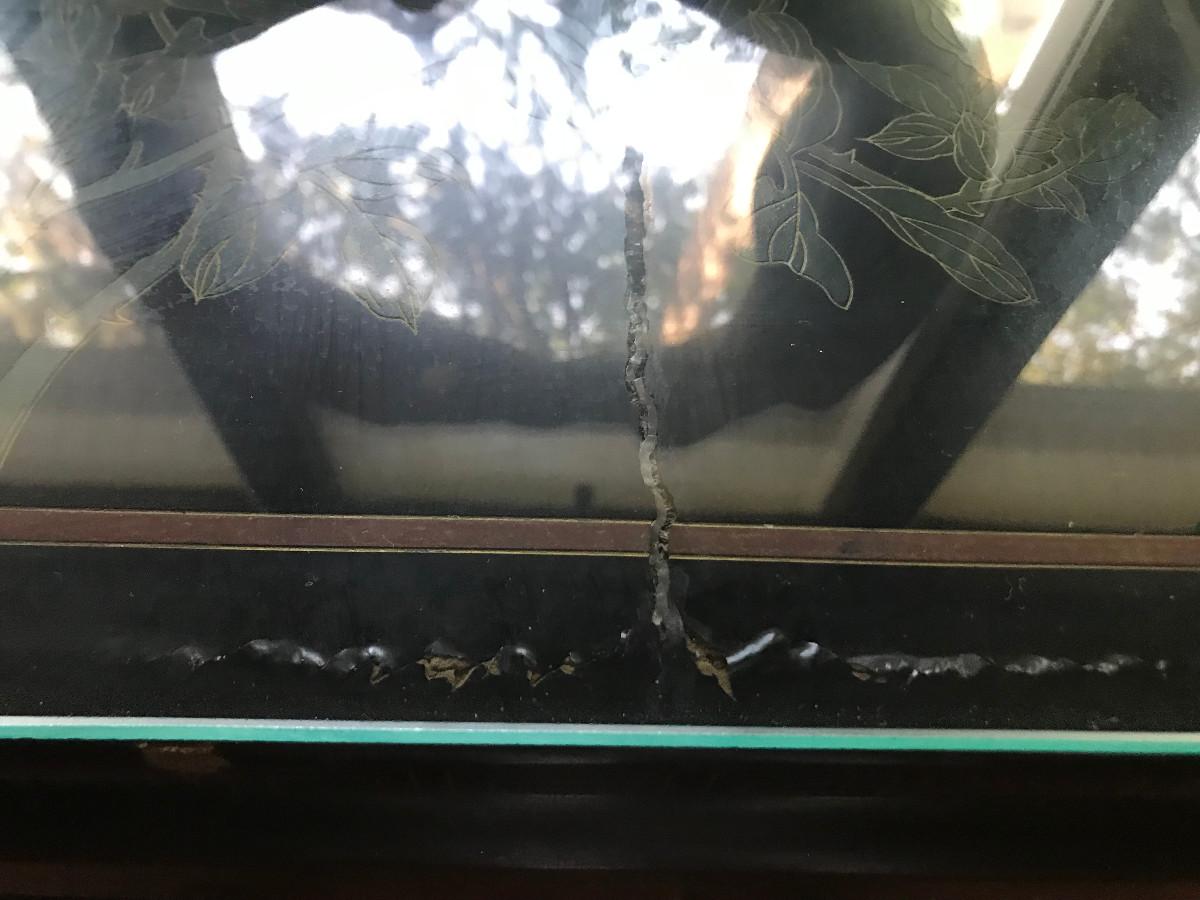 14.5" SQ X 18"H, LARGE NATURAL CRACK DOWN TOP CENTER, SOME SCRATCHES, VINTAGE WEAR, GLASS TOP WAS ADDED DID NOT COME WITH.