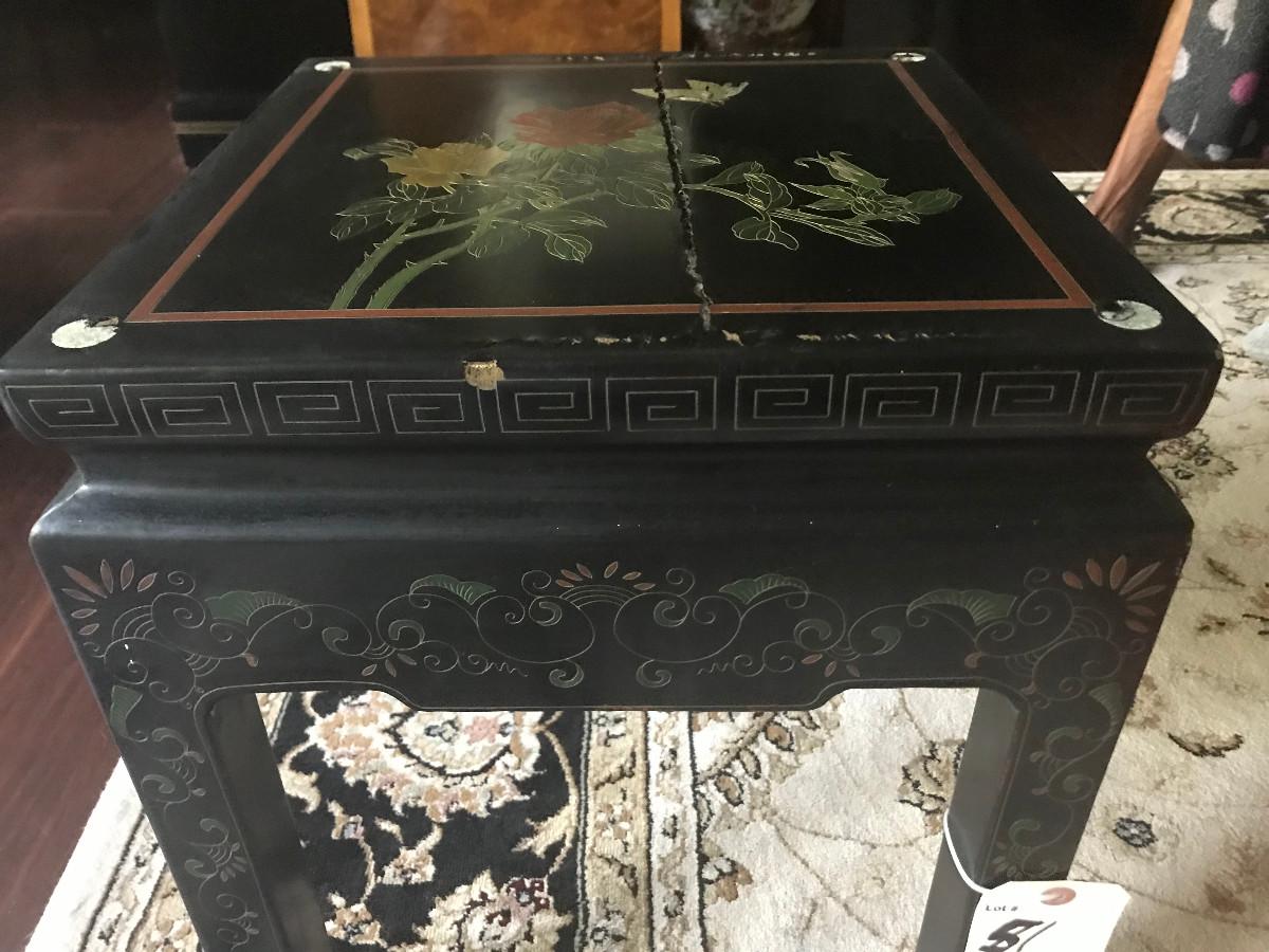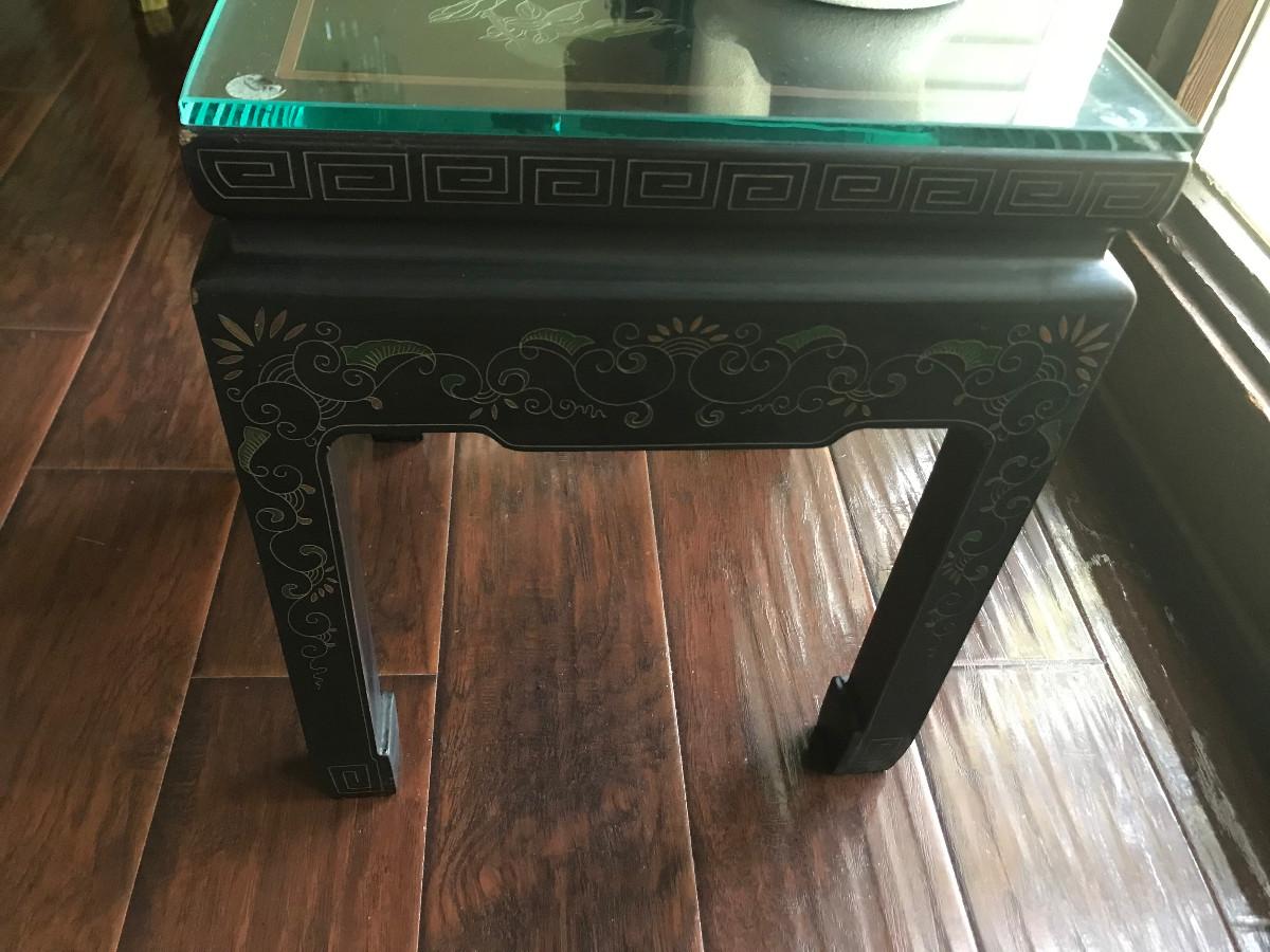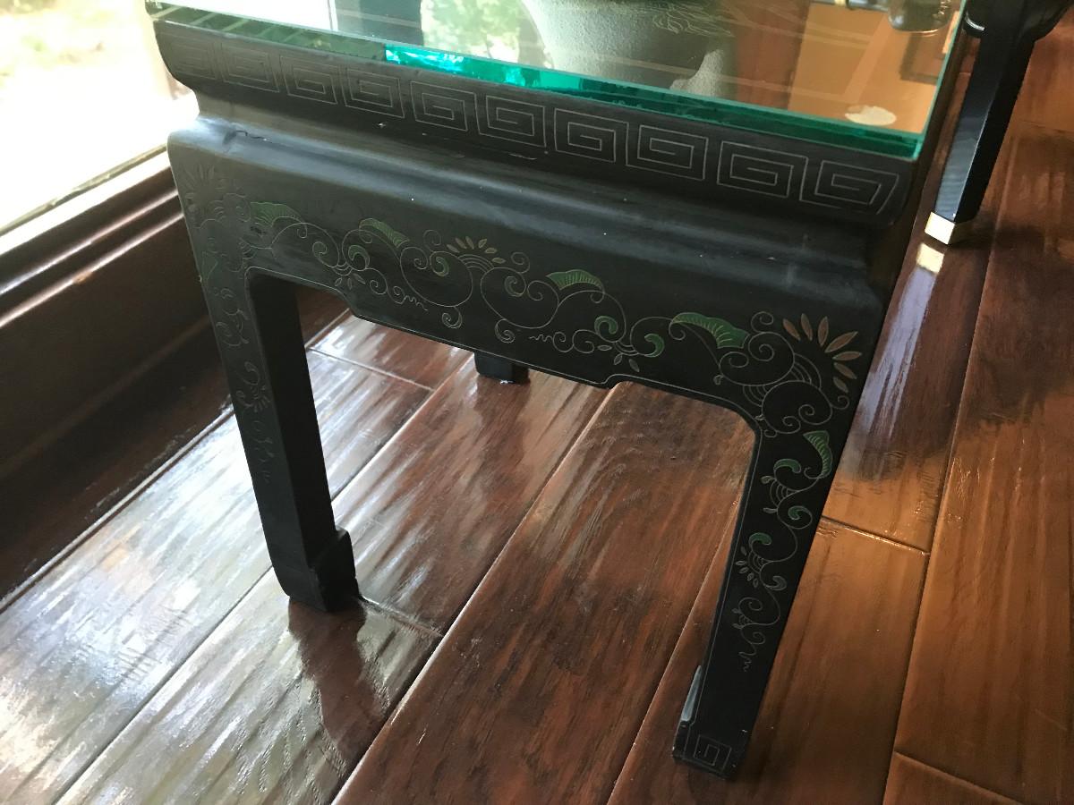 CHINOISERIE ROSES/BLACK LAQUER GLASS TOP SIDE TABLE