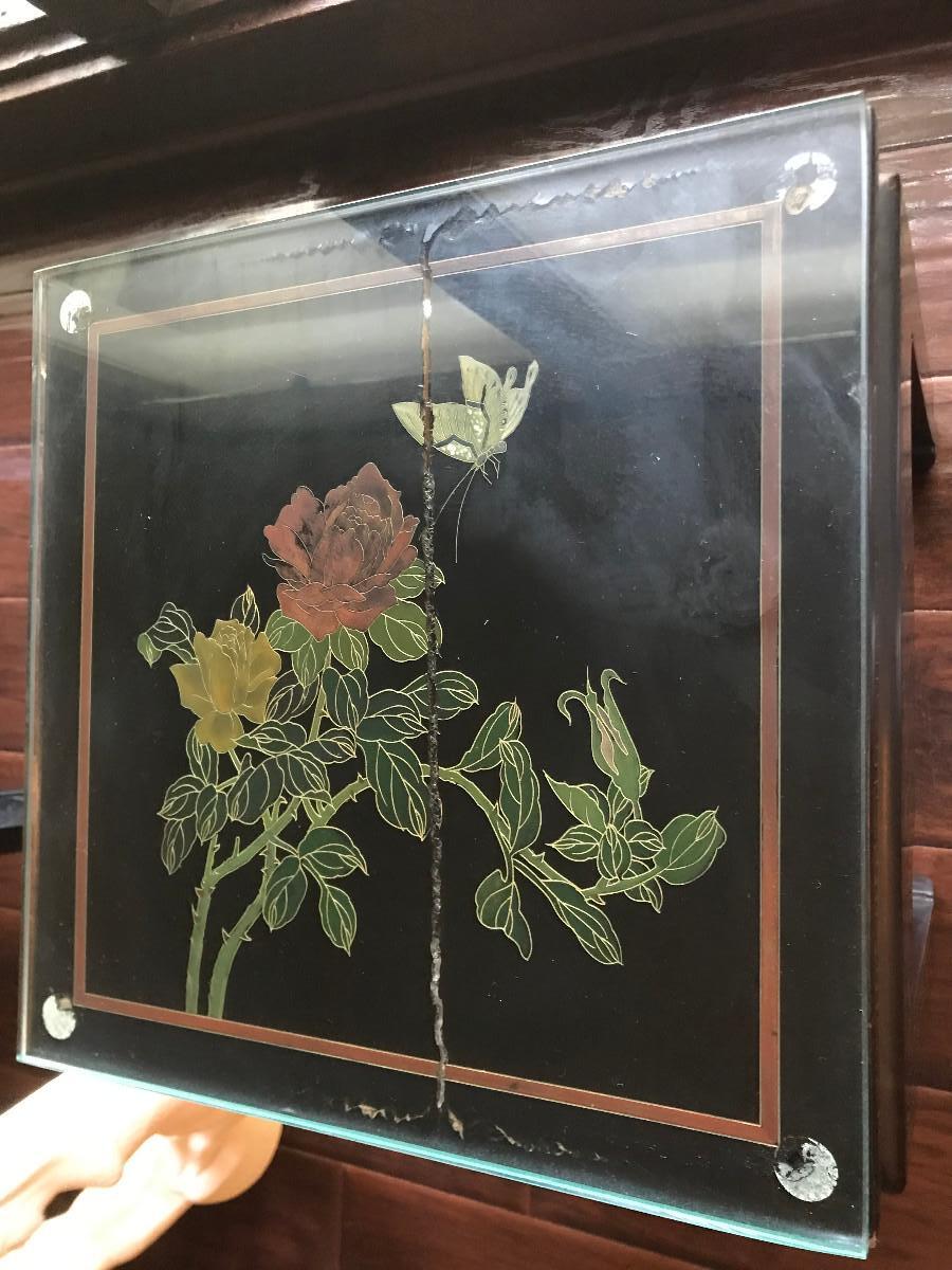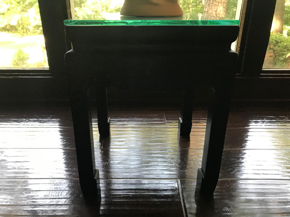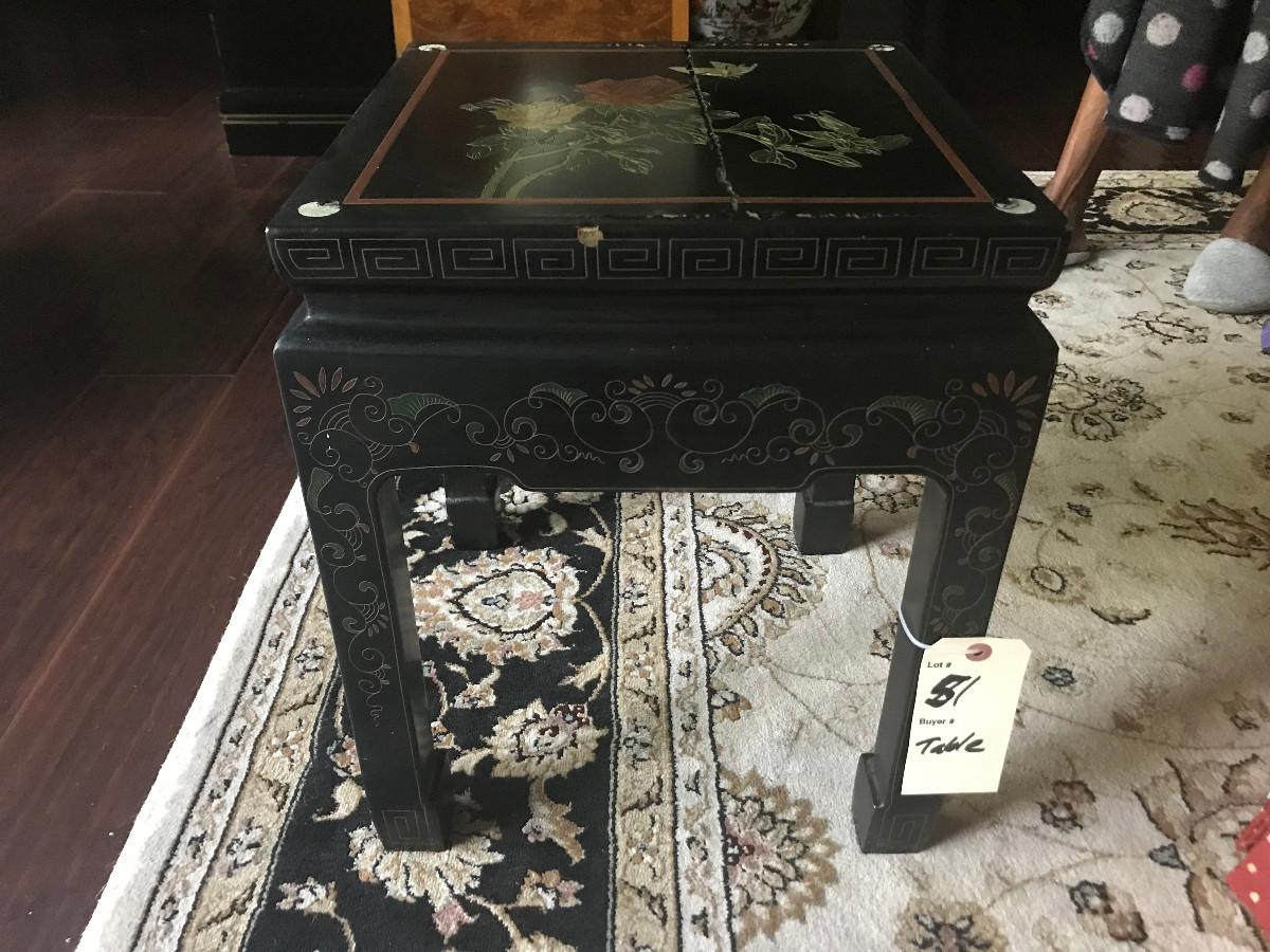 CHINOISERIE ROSES/BLACK LAQUER GLASS TOP SIDE TABLE