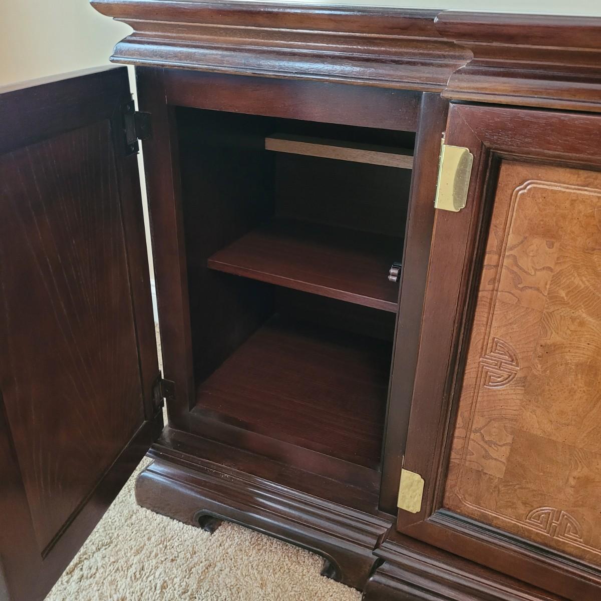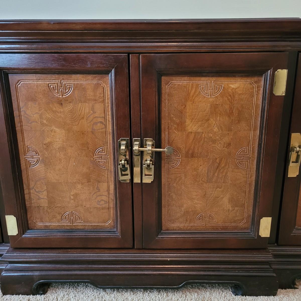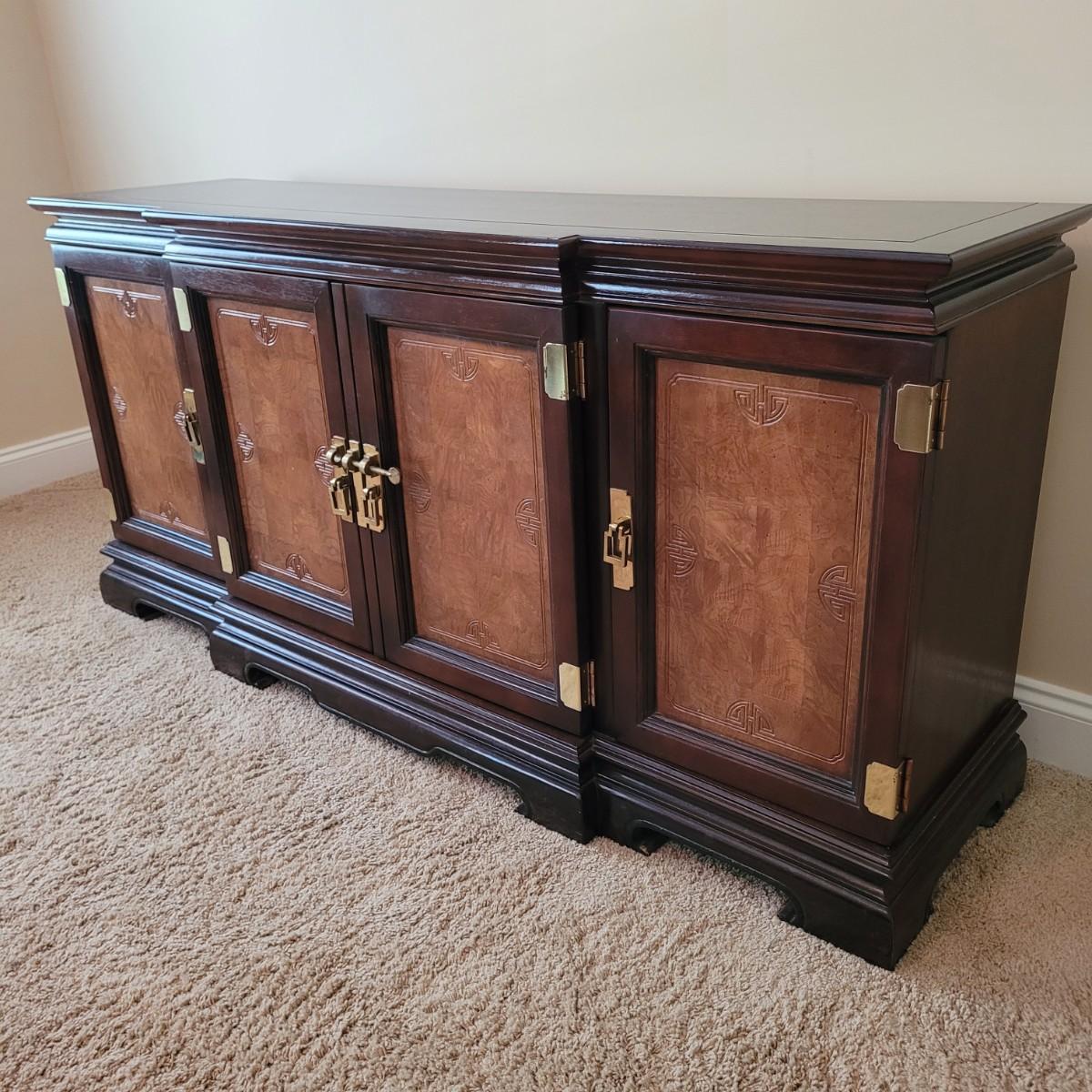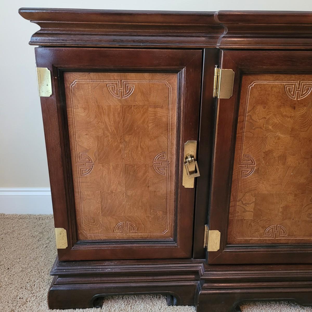 This lot includes one large Chinoiserie wooden credenza. Likely made in the1990s, this credenza has brass hardware and burl doors. There is a brass rod latch that may be used to secure the two middle doors. There is one divided drawer behind the middle two doors and one long shelf that spans the length of the entire credenza. The piece measures approximately 63.5" x 18" x 31"H.